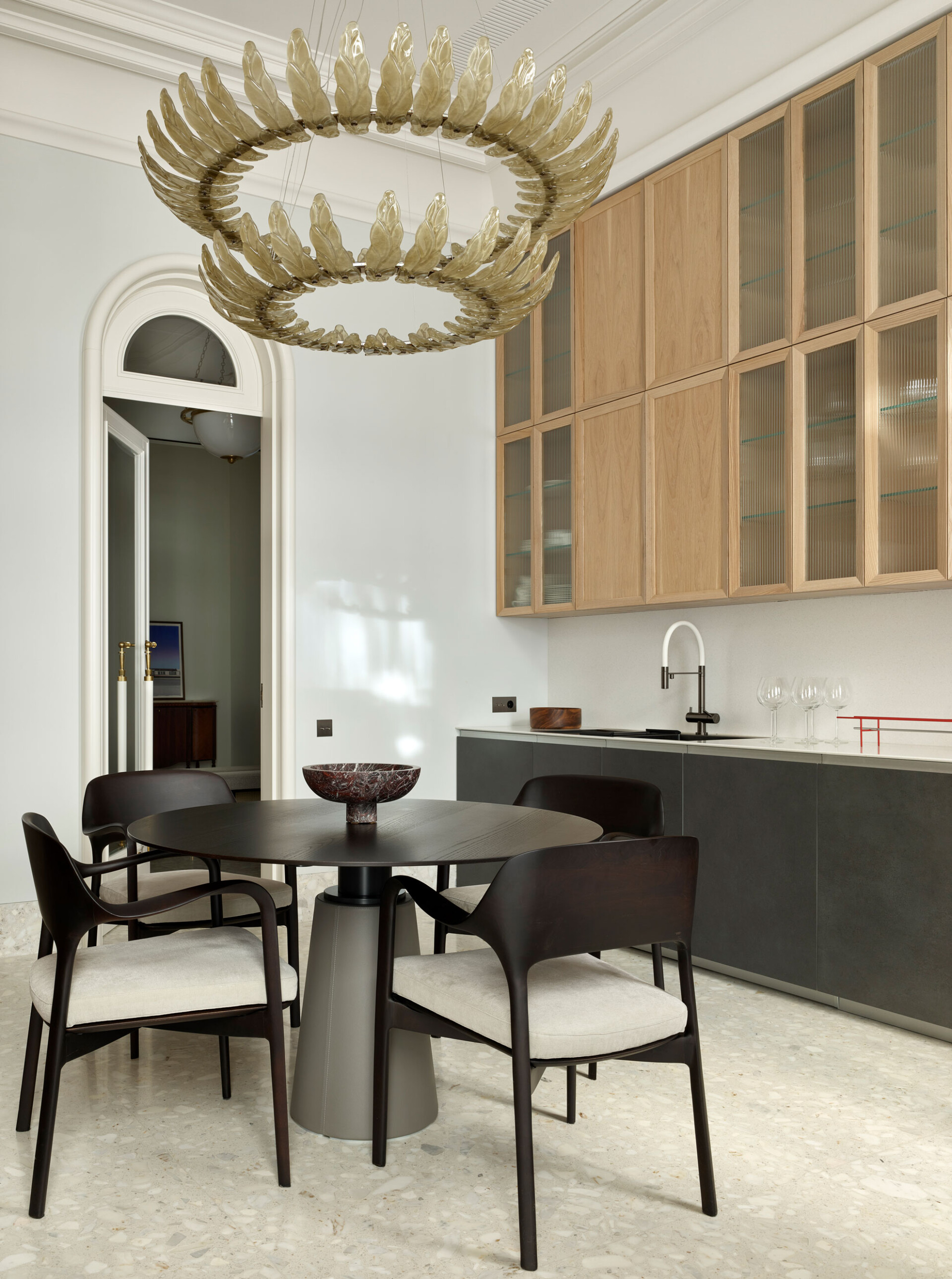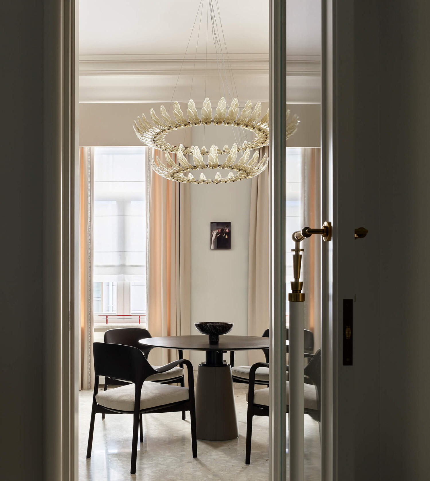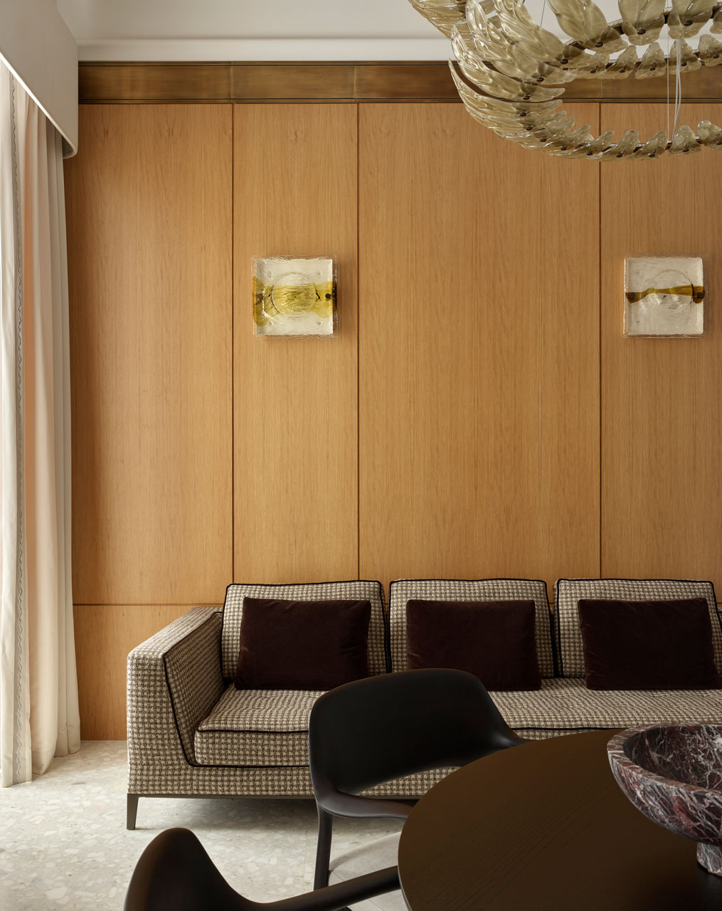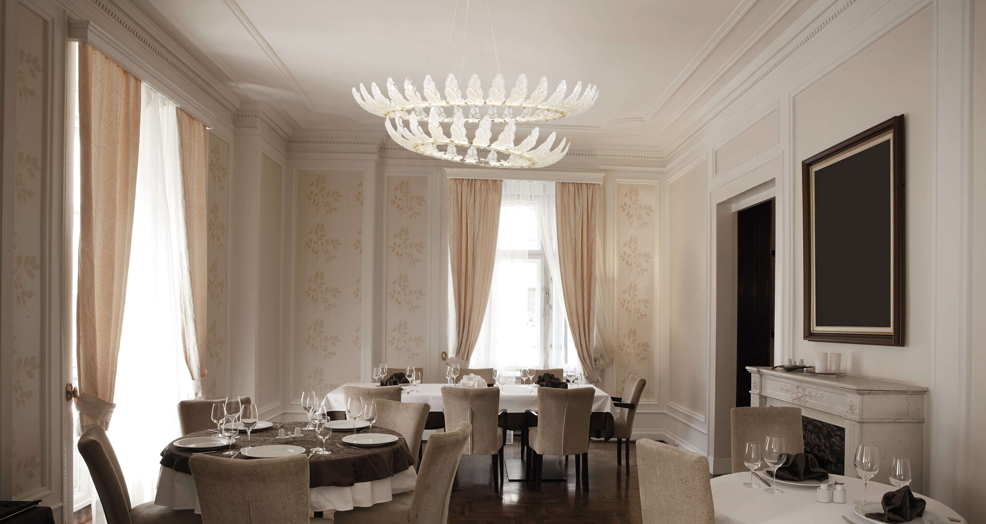 Подвесной светильник с листами из сатинированного тикового стекла и отделкой из позолоченного никелевого металла.