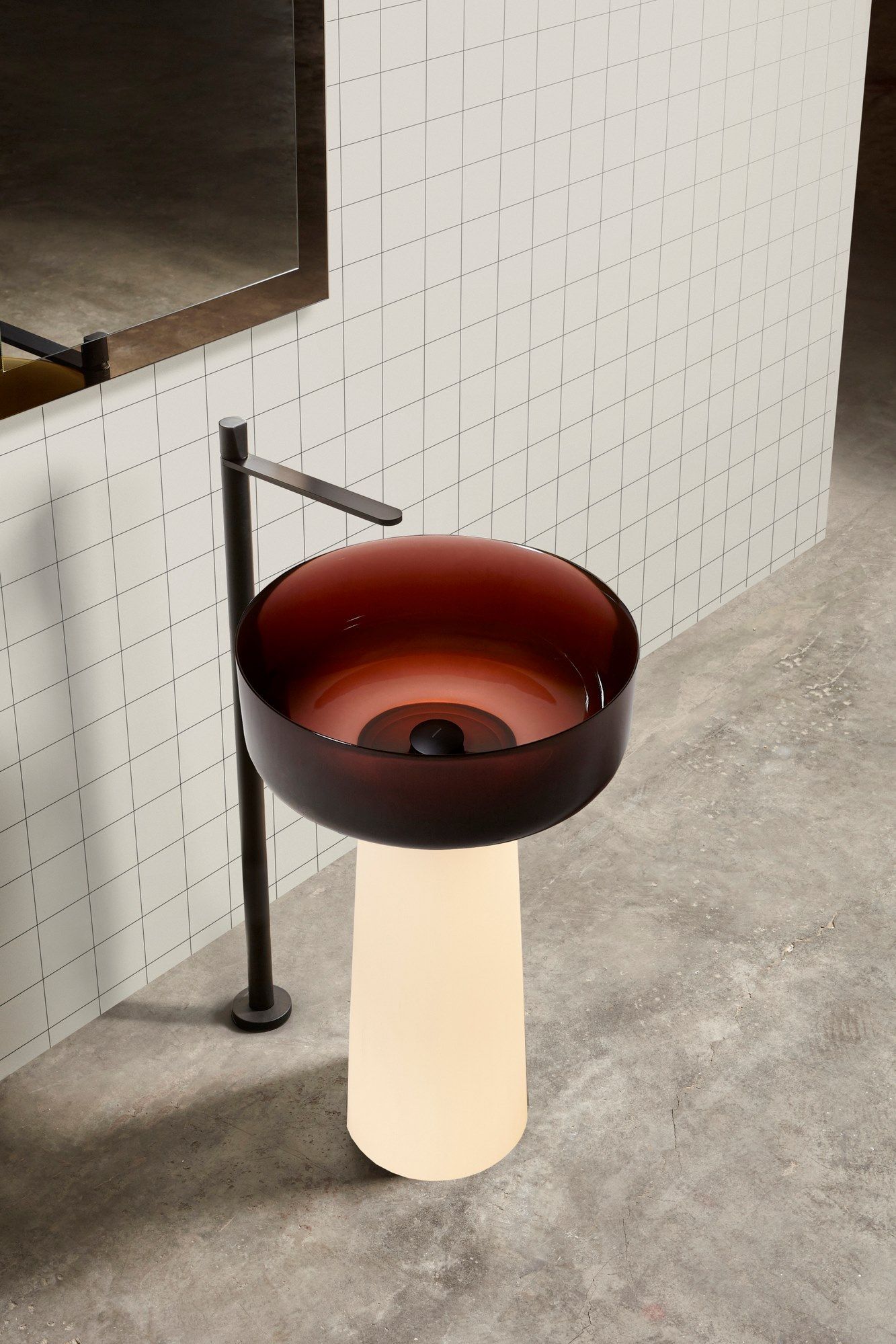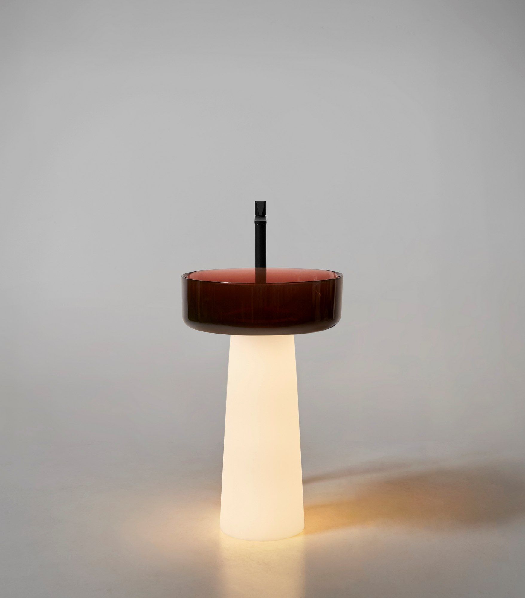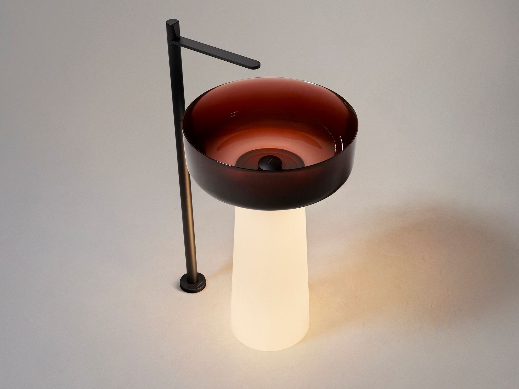 Основание раковины изготовлено из Flumood Bianco Dinamico, материала, рожденного в результате непрерывной исследовательской деятельности antoniolupi, компактной полупрозрачной смолы, которая позволяет ножке равномерно распространять свет по всей ванной комнате.