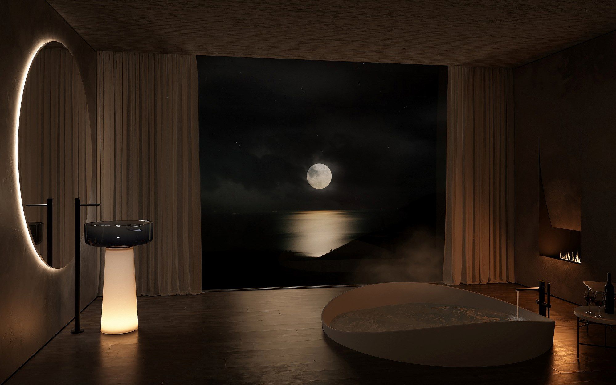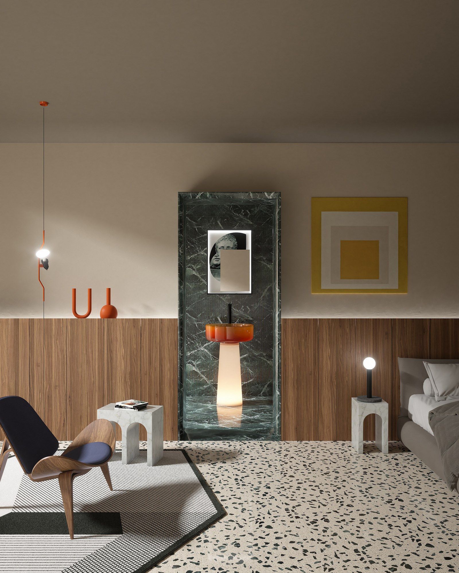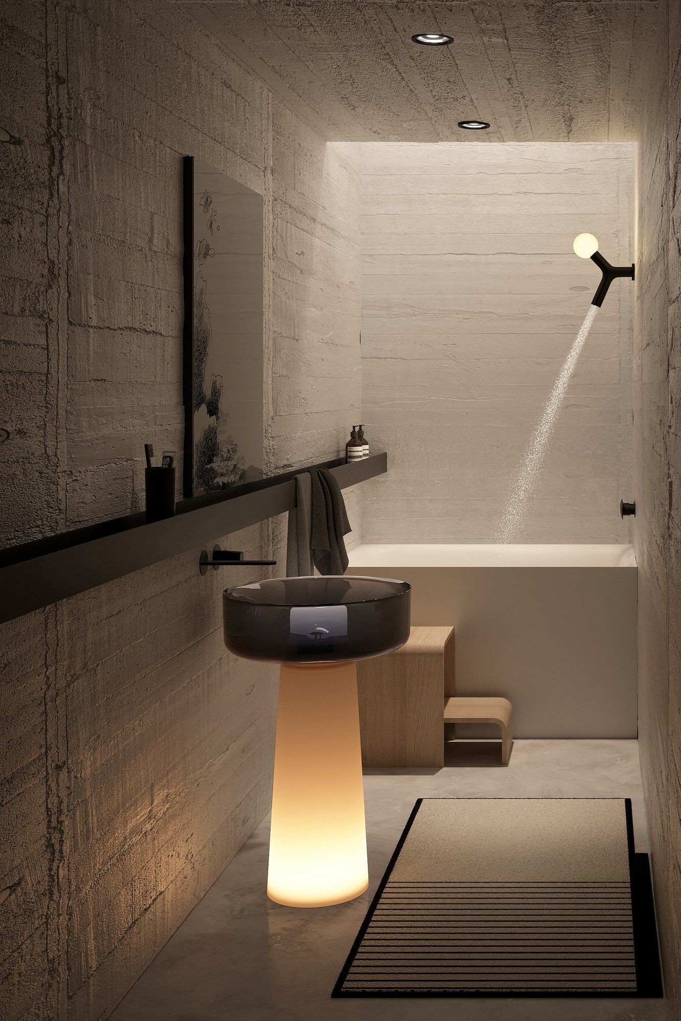 Основание раковины изготовлено из Flumood Bianco Dinamico, материала, рожденного в результате непрерывной исследовательской деятельности antoniolupi, компактной полупрозрачной смолы, которая позволяет ножке равномерно распространять свет по всей ванной комнате.