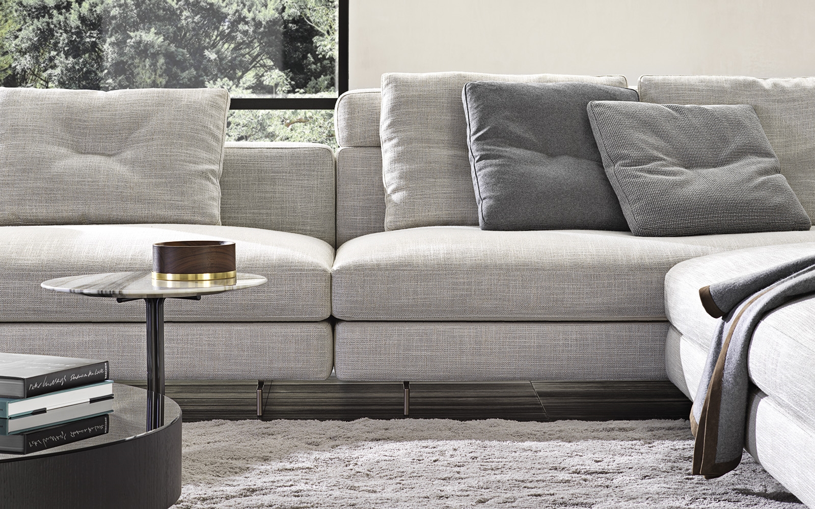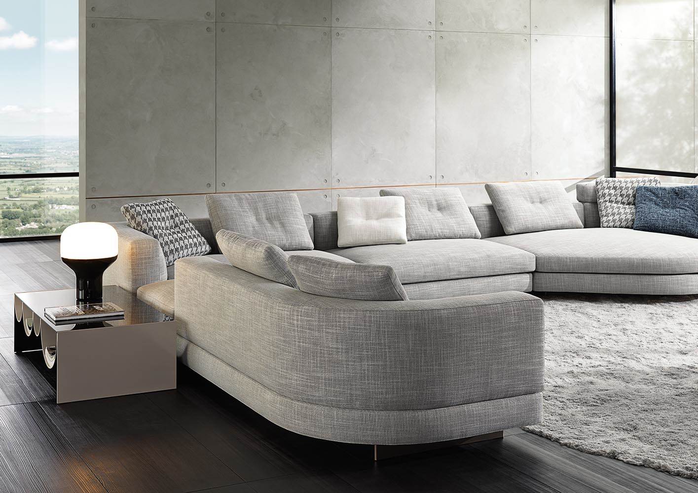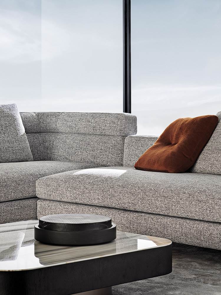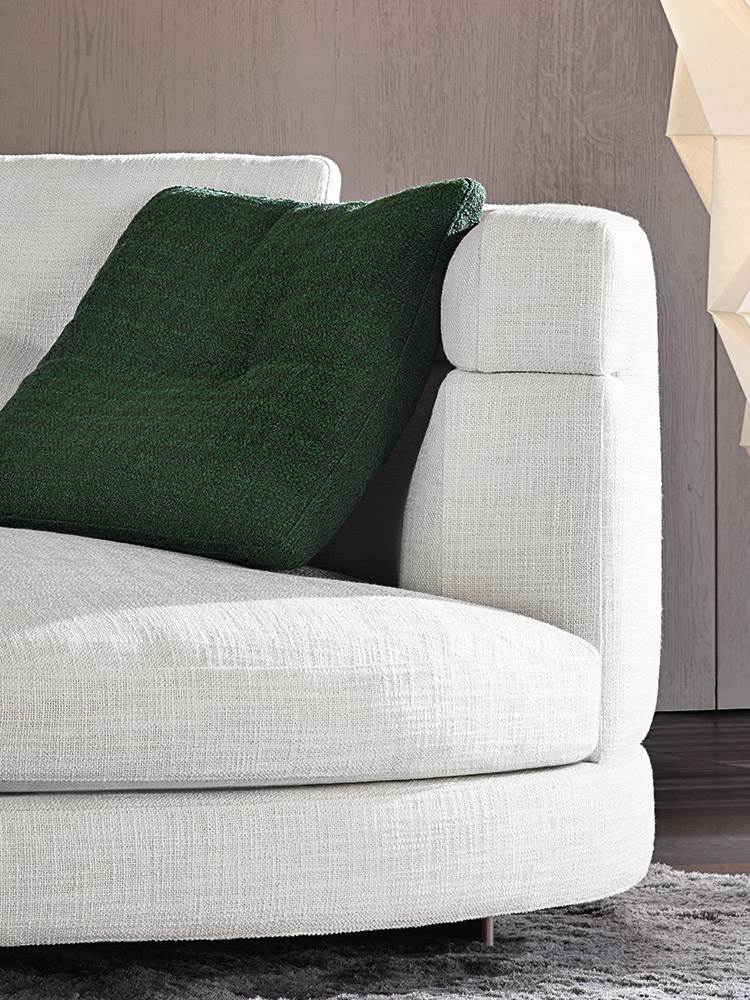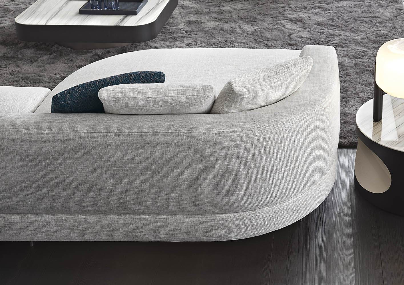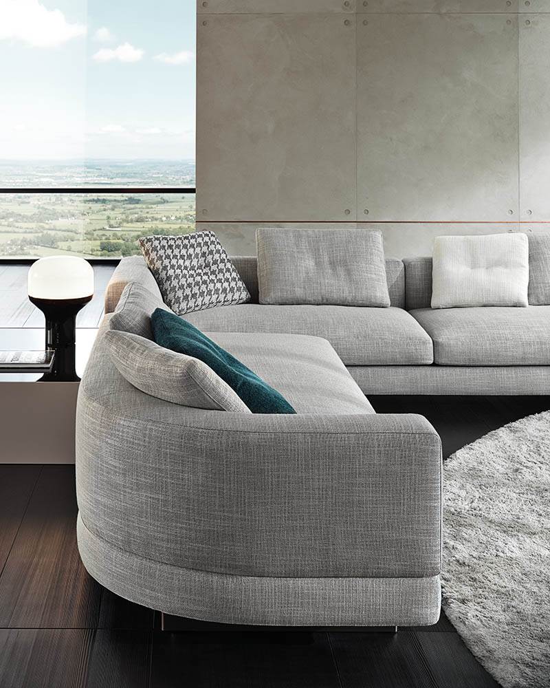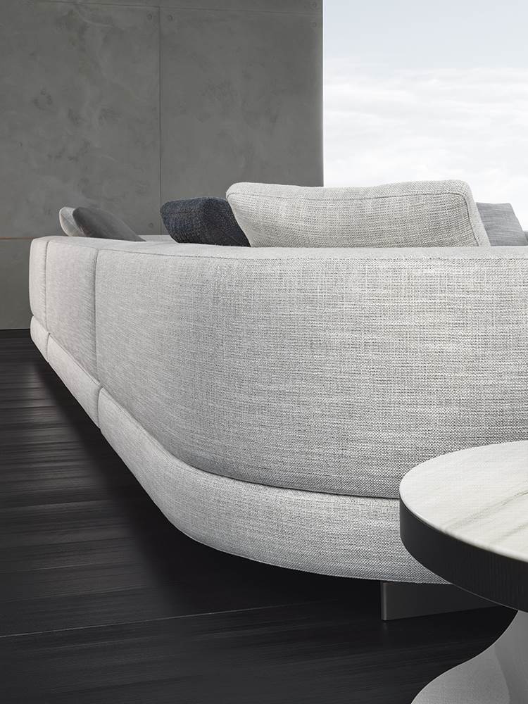 Материалы: каркас — дерево и металл; наполнение — полиуретан и гусиный пух; обивка — ткань или кожа Minotti; основание — металл с порошковым покрытием