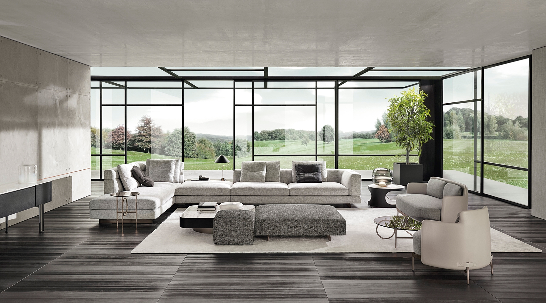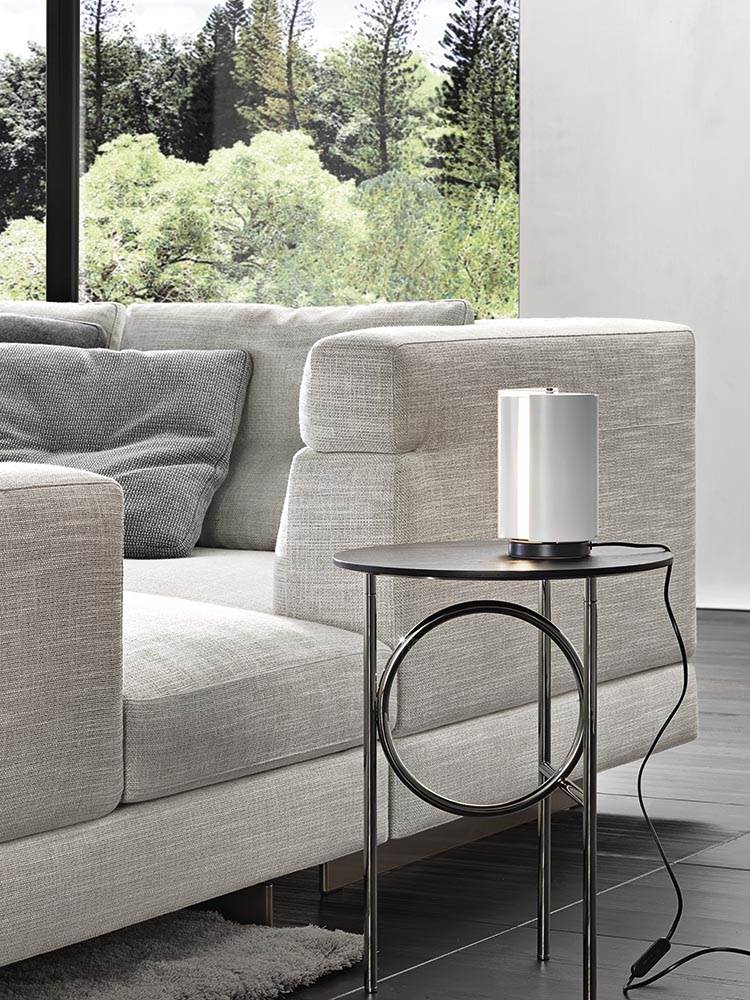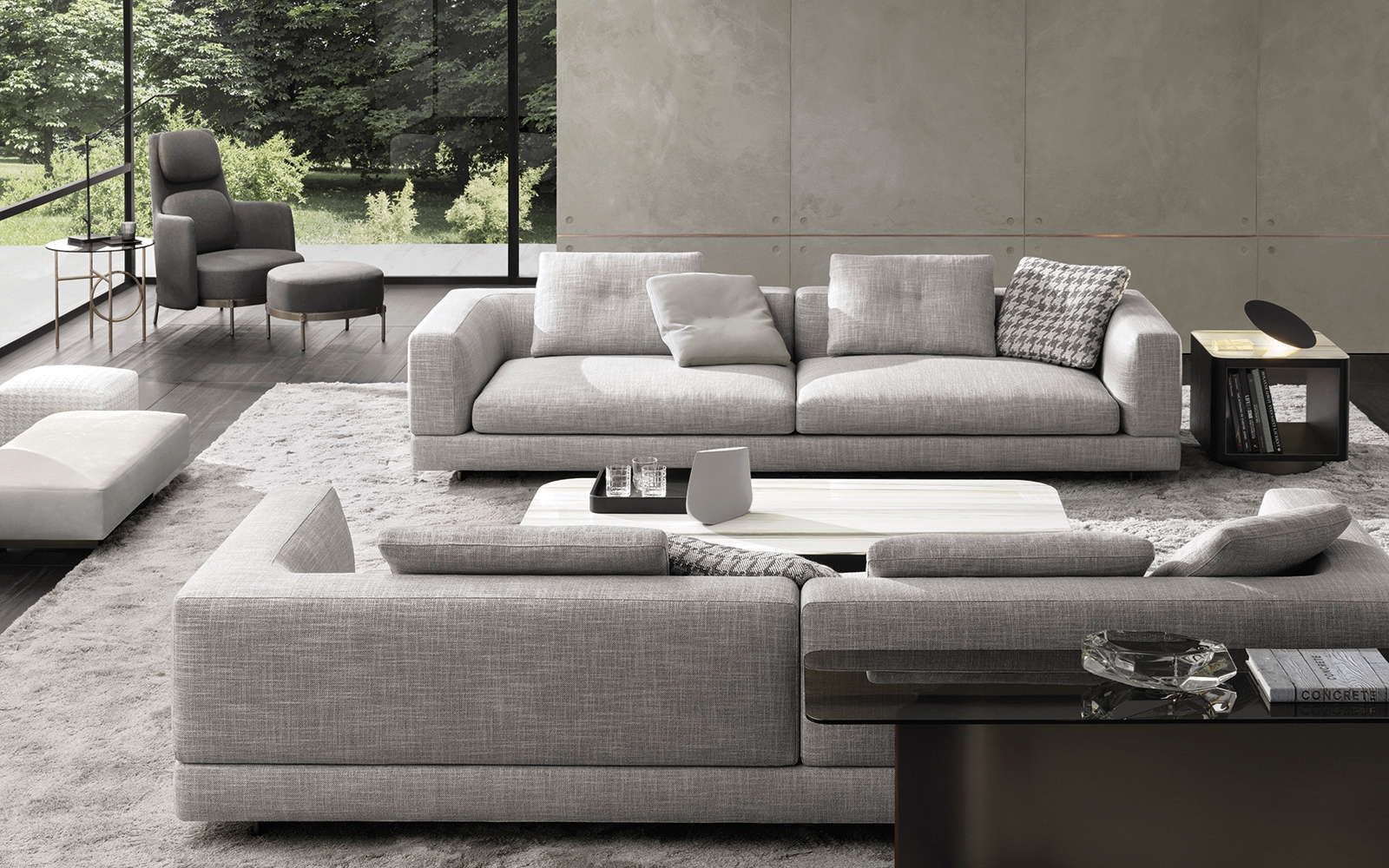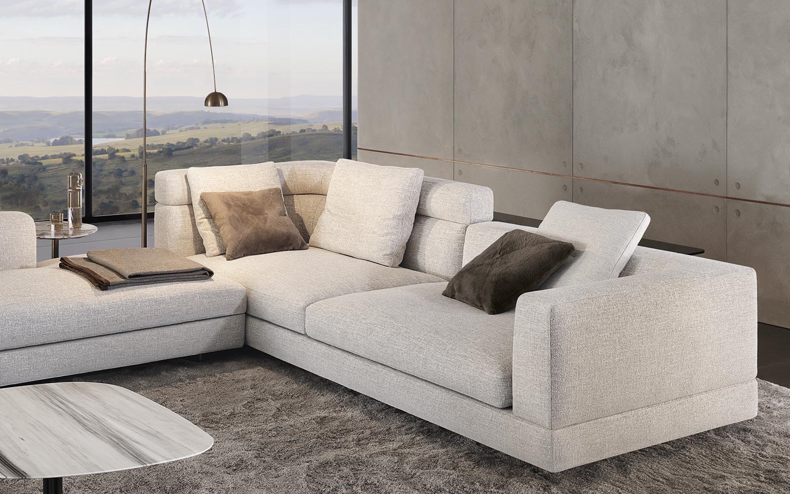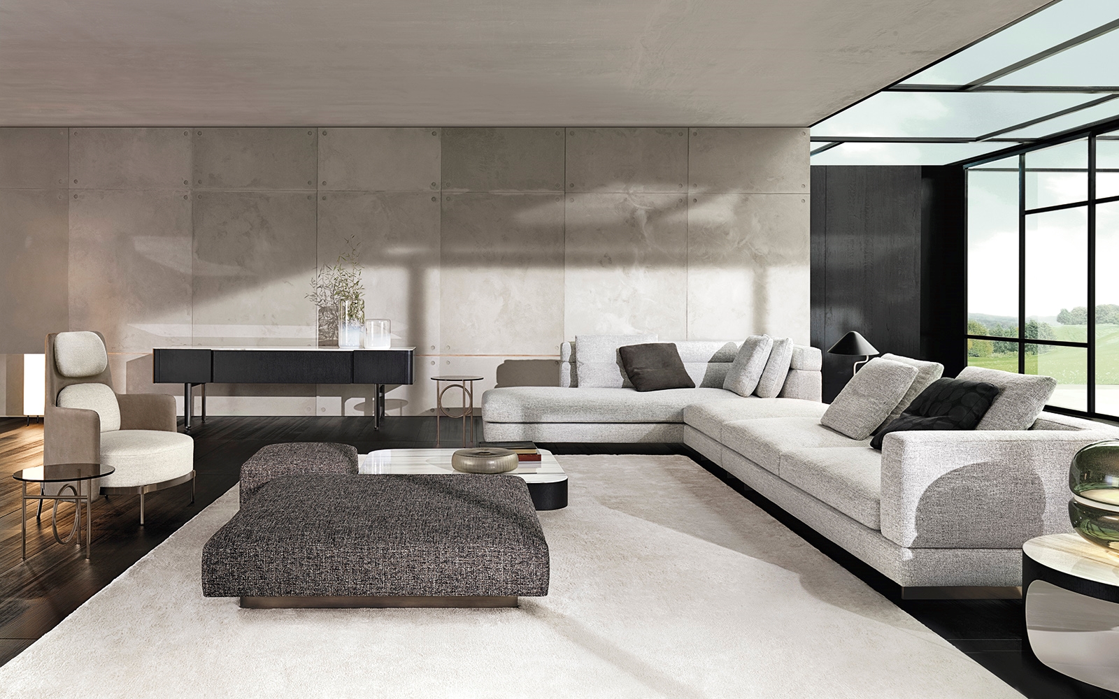 Материалы: каркас — дерево и металл; наполнение — полиуретан и гусиный пух; обивка — ткань или кожа Minotti; основание — металл с порошковым покрытием