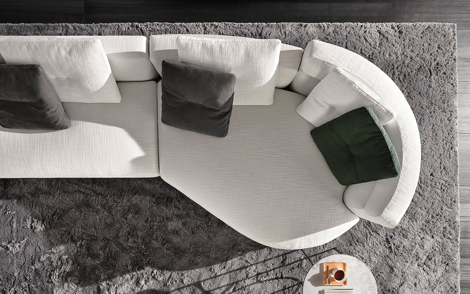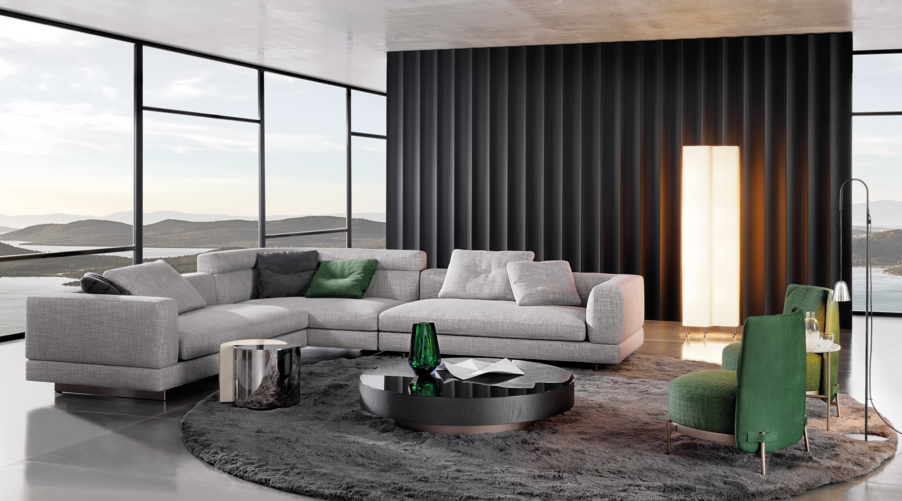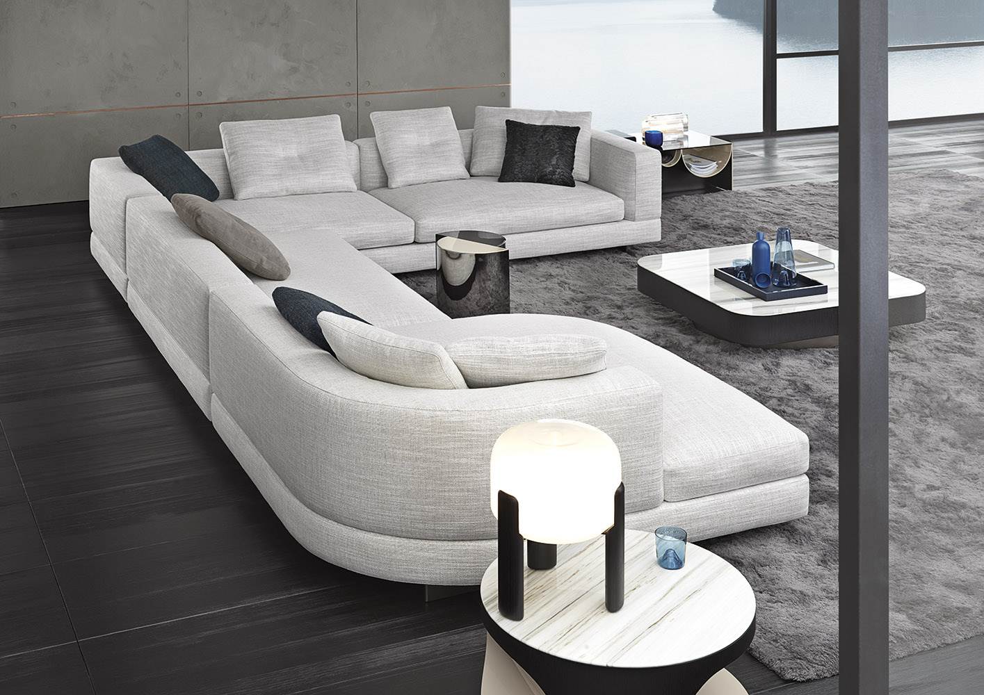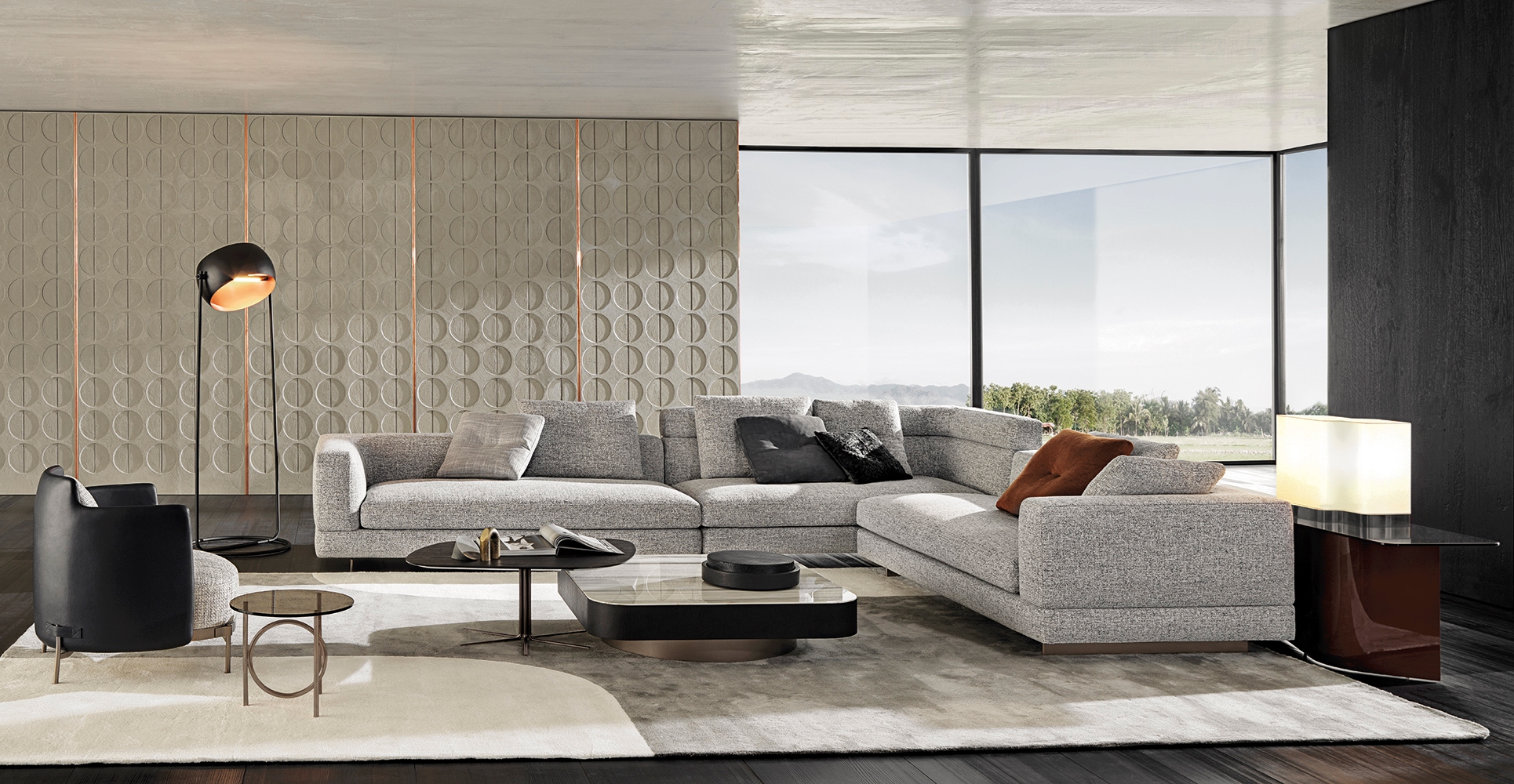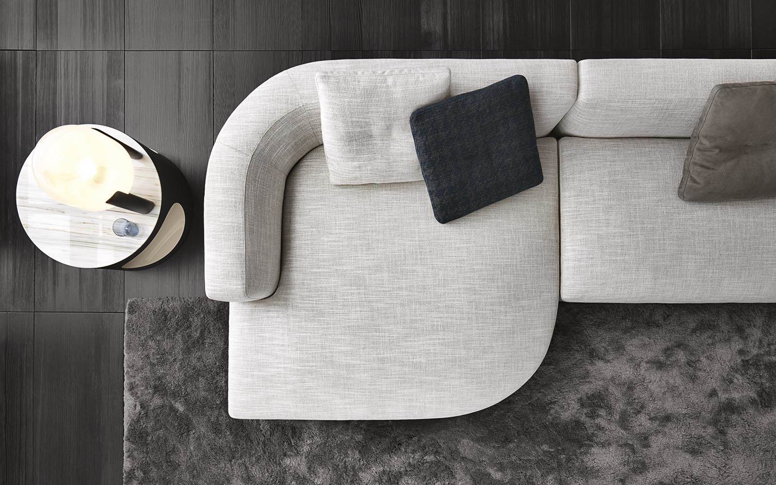 Материалы: каркас — дерево и металл; наполнение — полиуретан и гусиный пух; обивка — ткань или кожа Minotti; основание — металл с порошковым покрытием