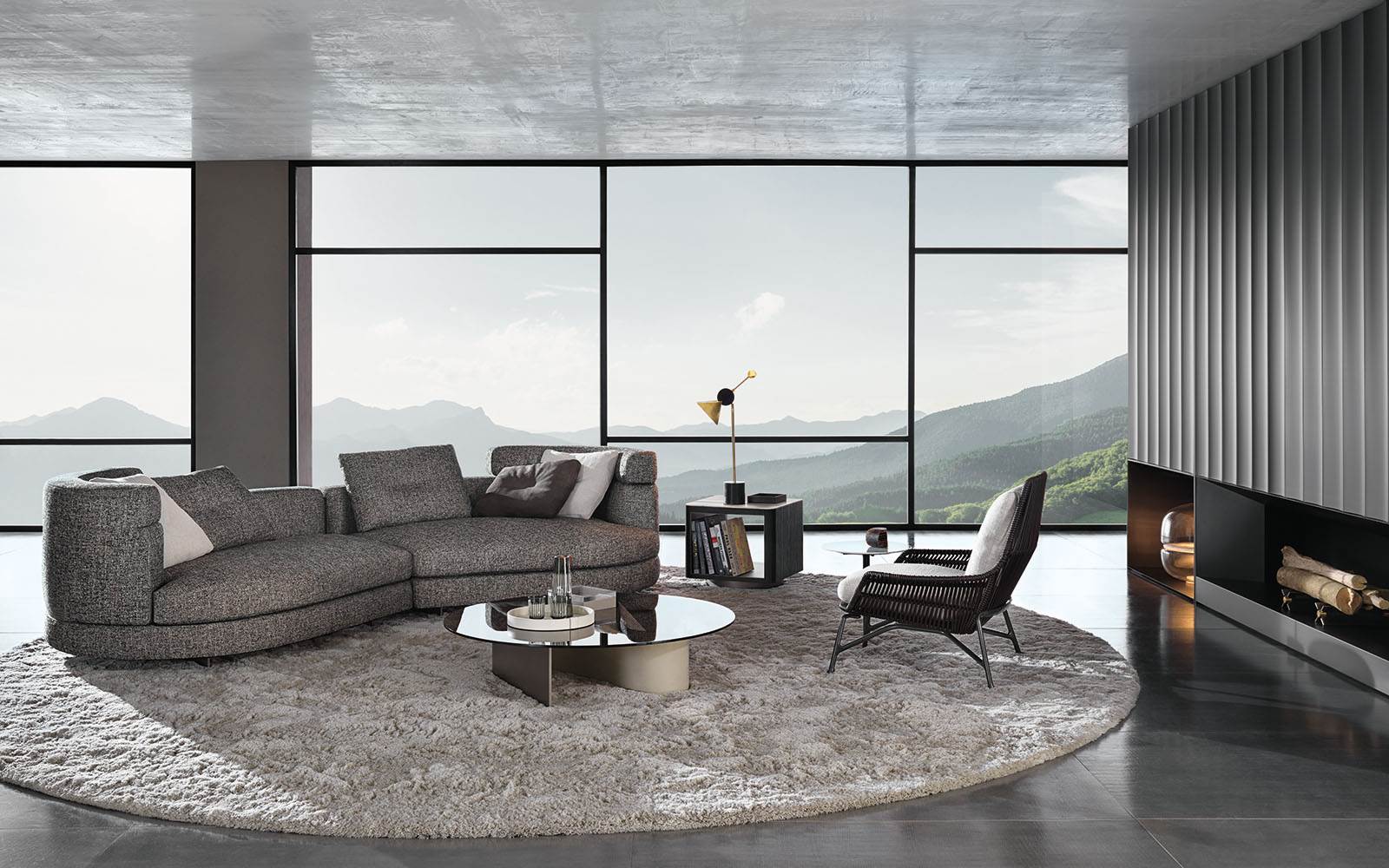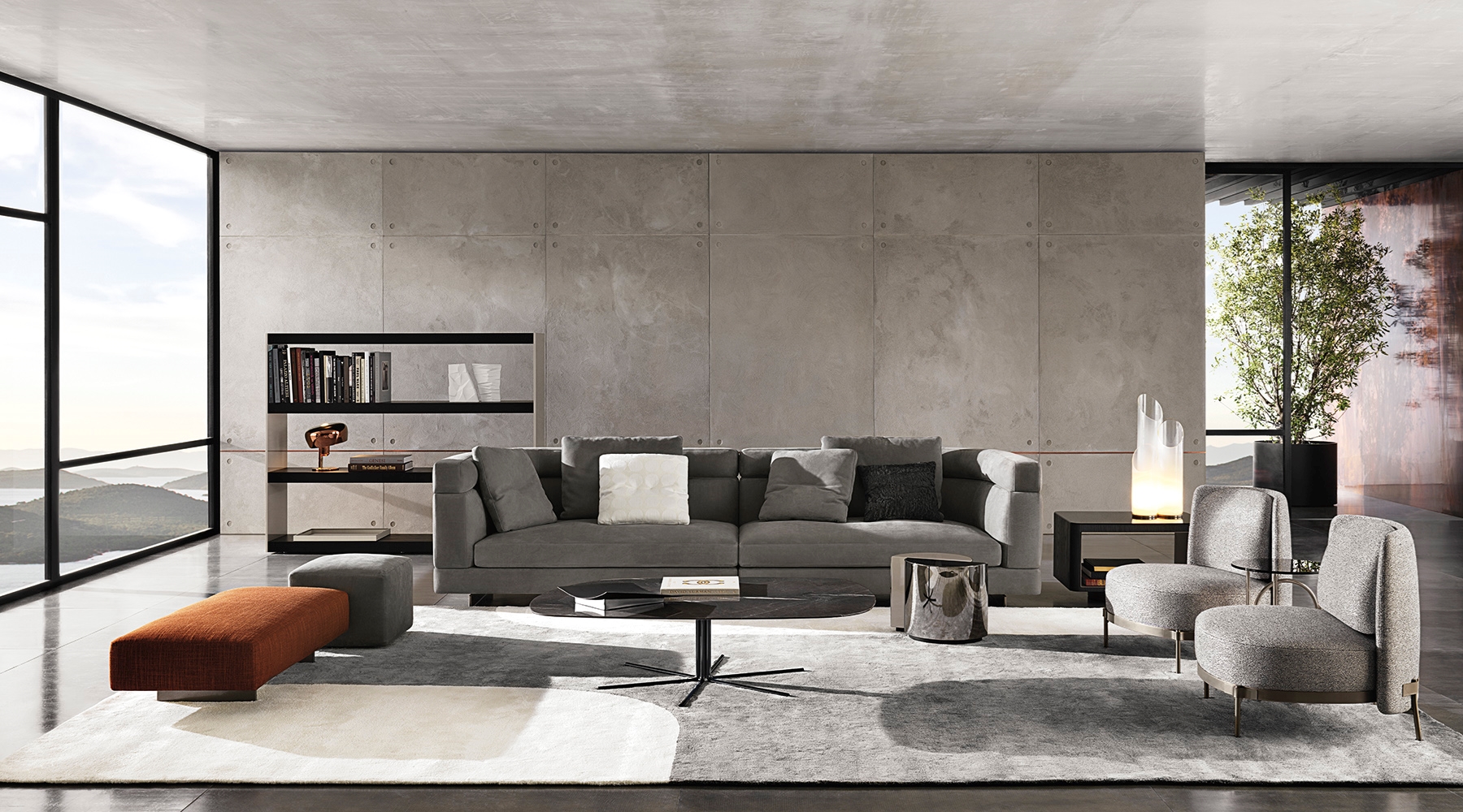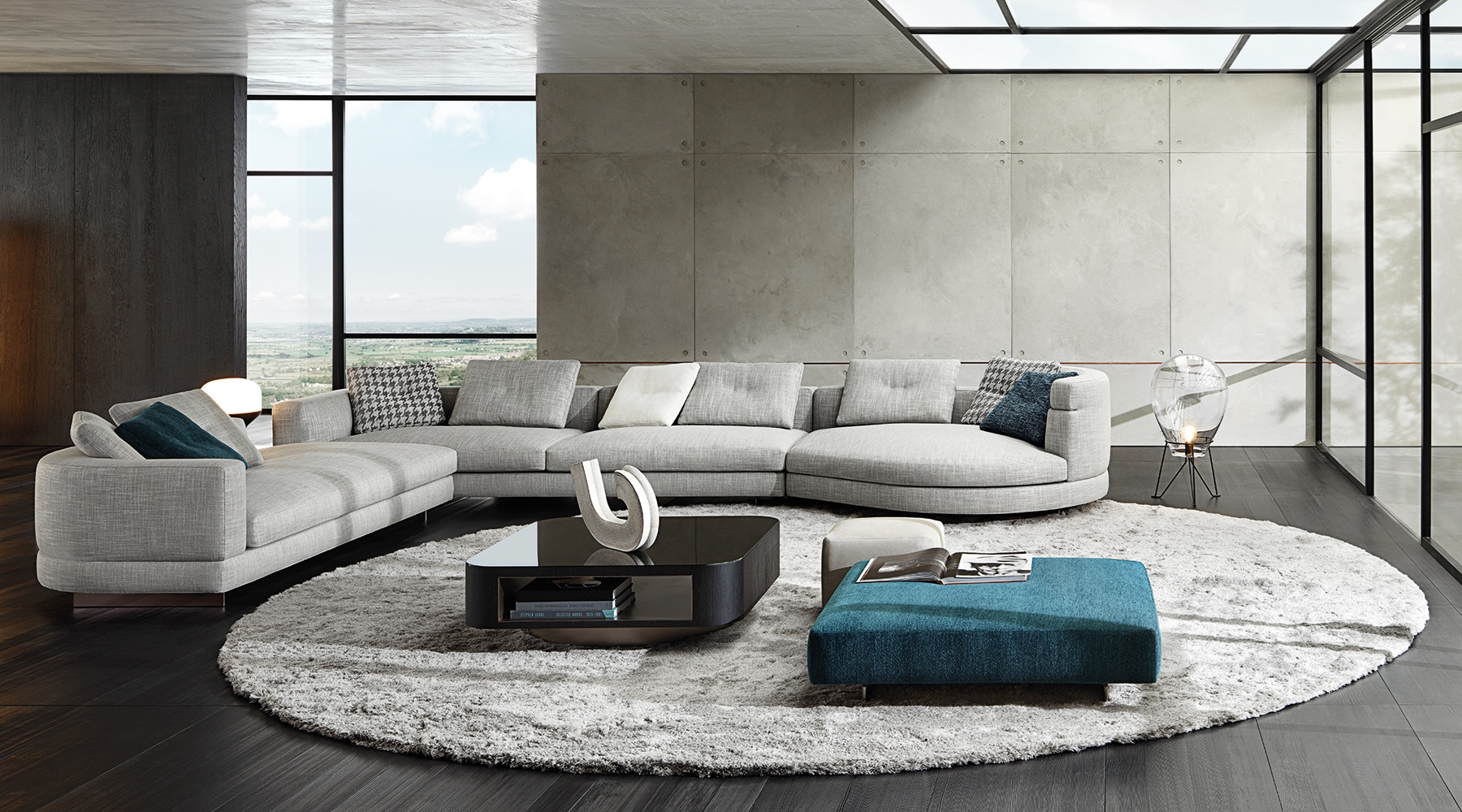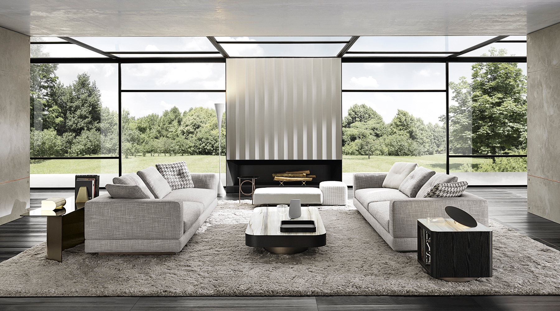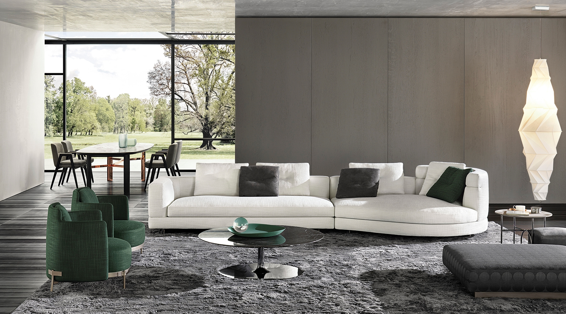 Материалы: каркас — дерево и металл; наполнение — полиуретан и гусиный пух; обивка — ткань или кожа Minotti; основание — металл с порошковым покрытием