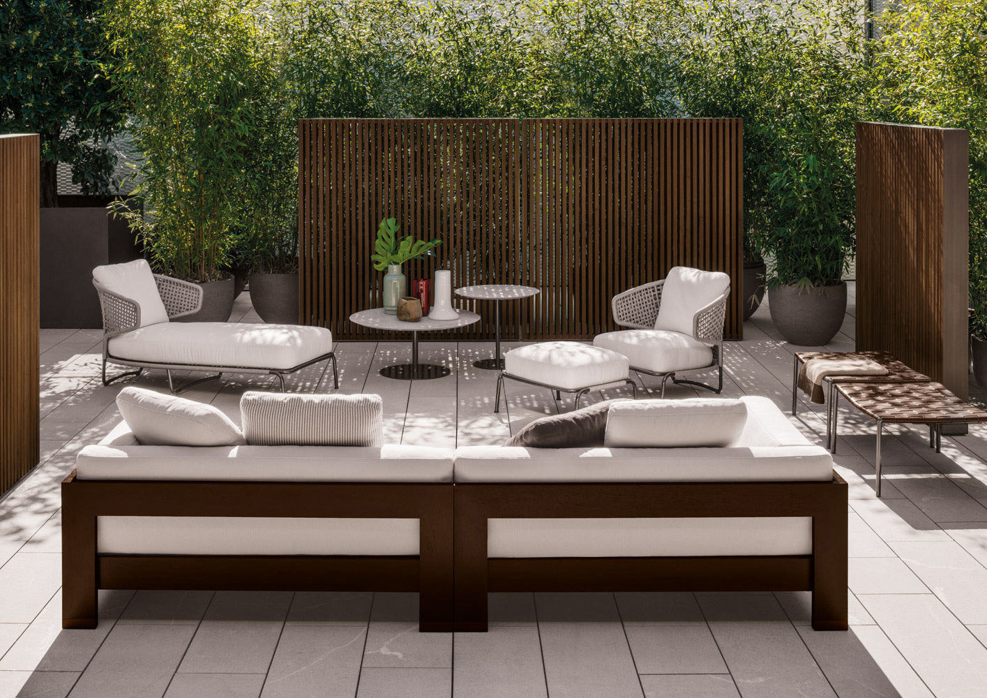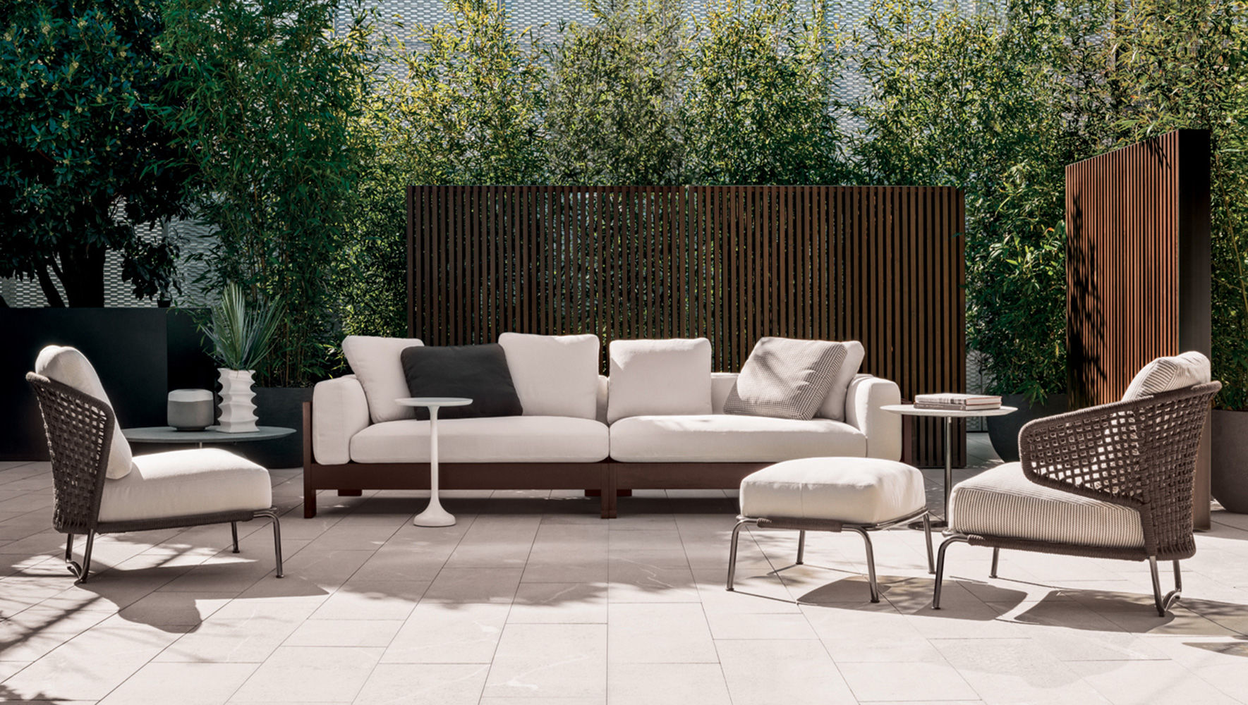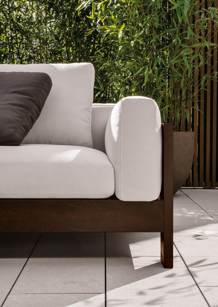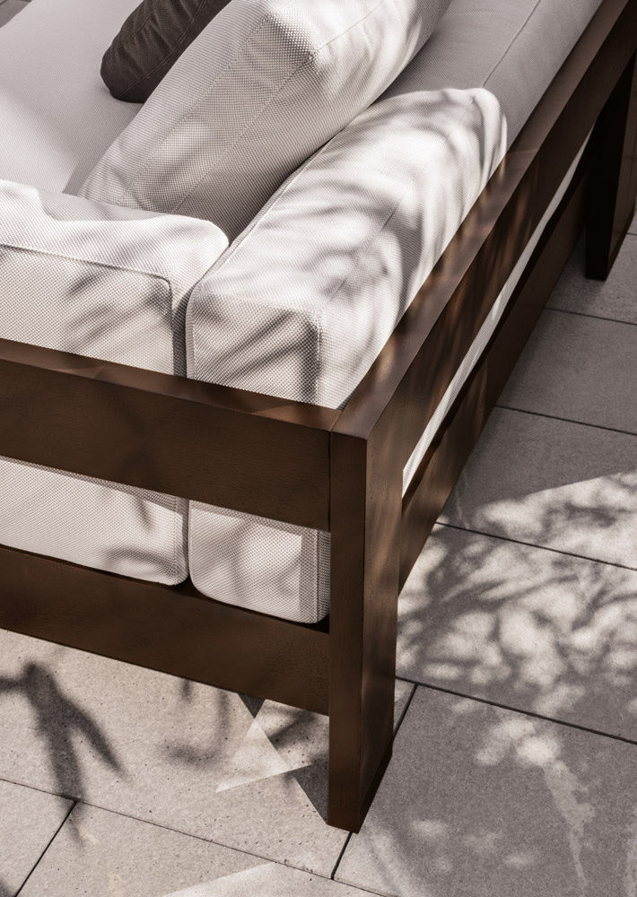 Alison "Dark Brown" — уличный диван с лаконичным силуэтом и тёплой природной эстетикой. Каркас выполнен из массива тика в глубоком тёмно-коричневом оттенке с водоотталкивающей отделкой. Спинка и подлокотники имеют цельнодеревянную структуру без декоративной оплётки, подчеркивая чистоту форм и элегантность пропорций. Обивка выполнена из уличных тканей Minotti Outdoor, устойчивых к влаге, солнечным лучам и образованию плесени. Наполнение подушек — быстросохнущая пена с защитной дышащей оболочкой.