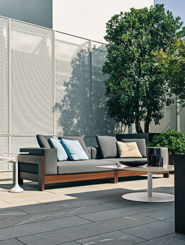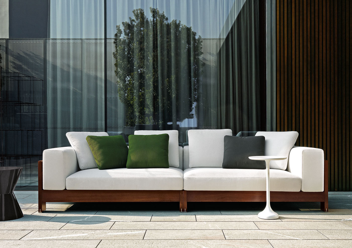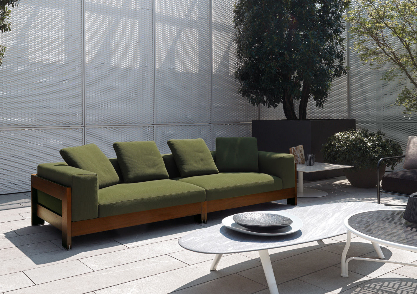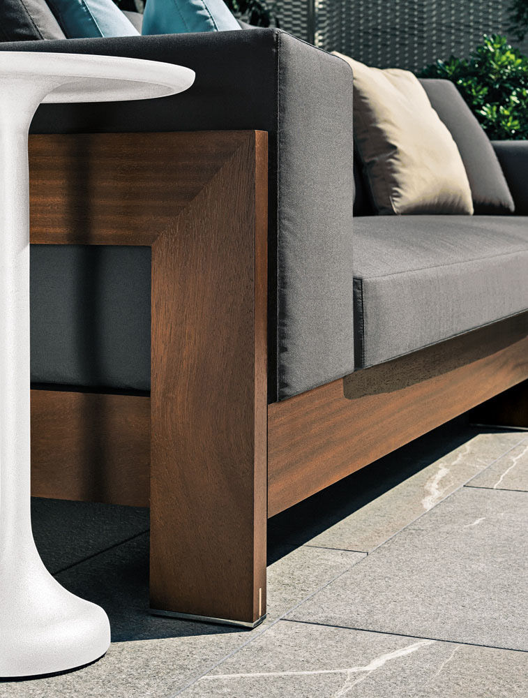 Уличный диван Alison из массива ироко — воплощение природной эстетики и лаконичной формы. Структура выполнена из обработанного тика, устойчивого к влаге и перепадам температур. Широкие деревянные подлокотники и отсутствие плетения подчеркивают естественную текстуру материала. Подушки с водоотталкивающими чехлами из уличных тканей Minotti дополняют образ.
