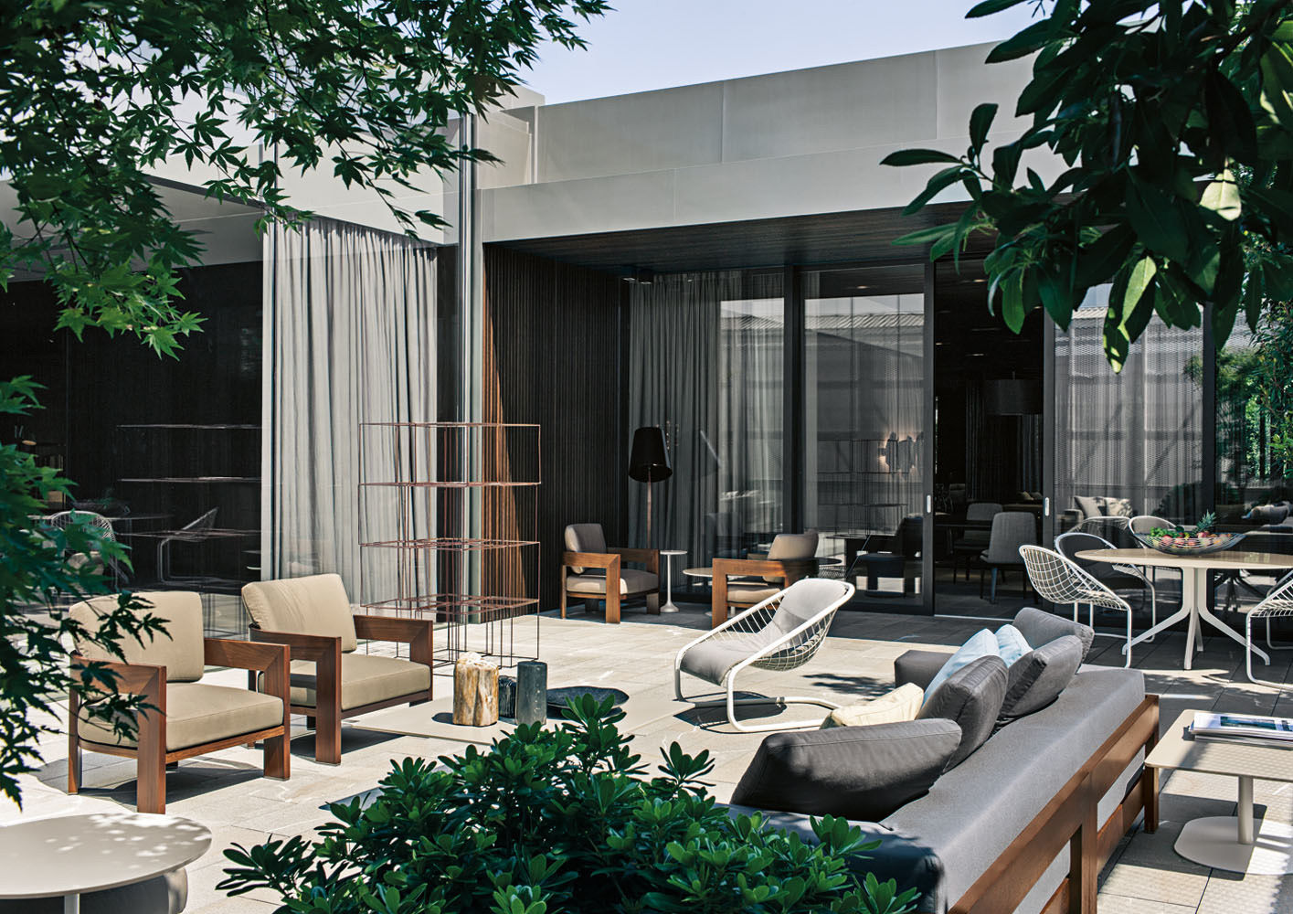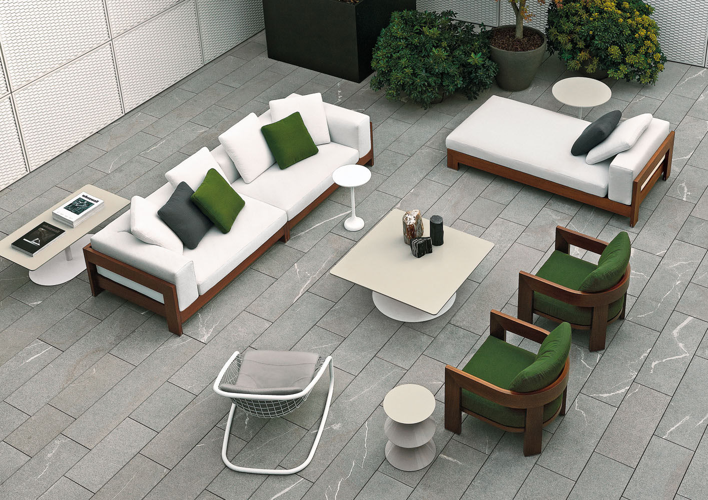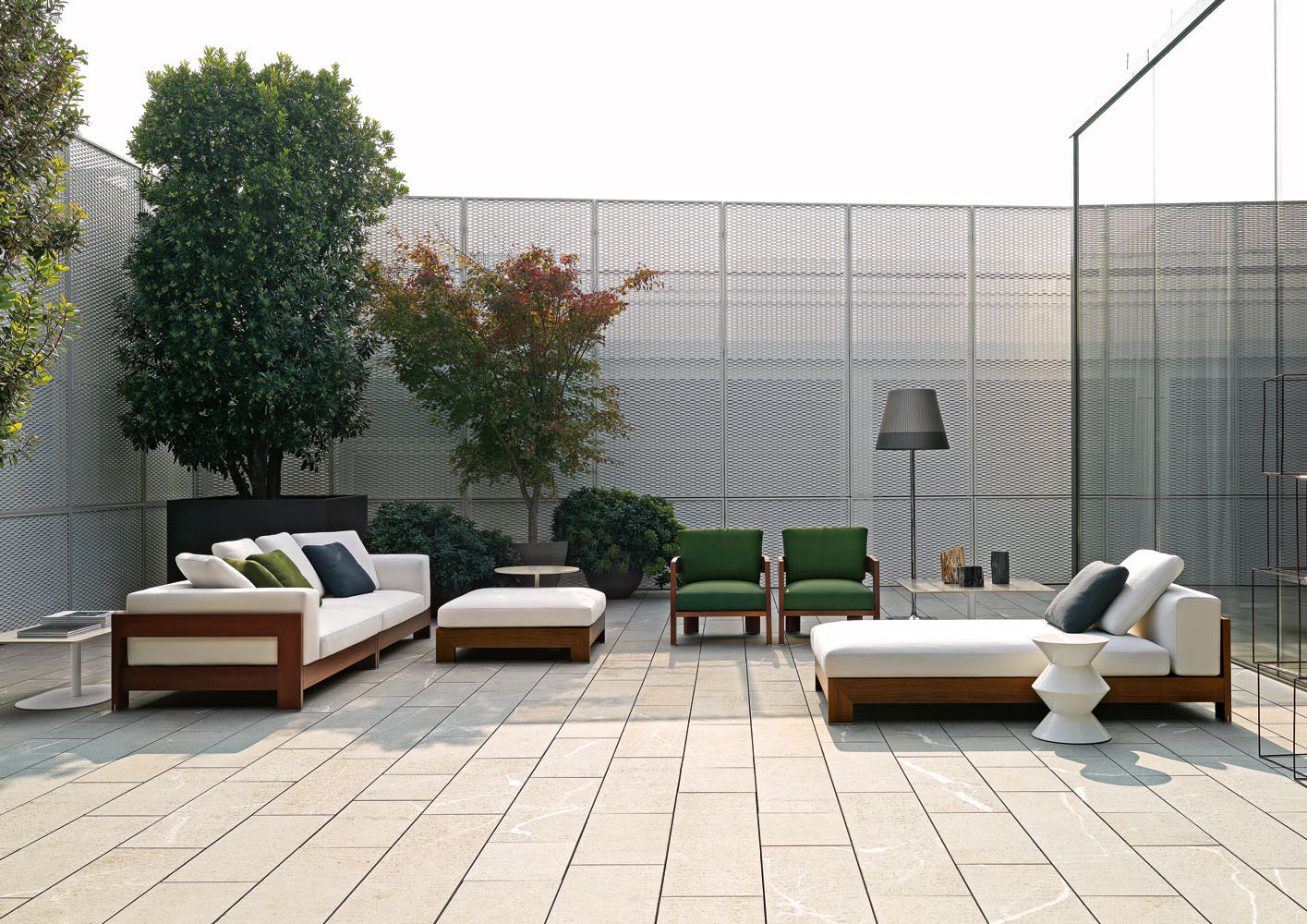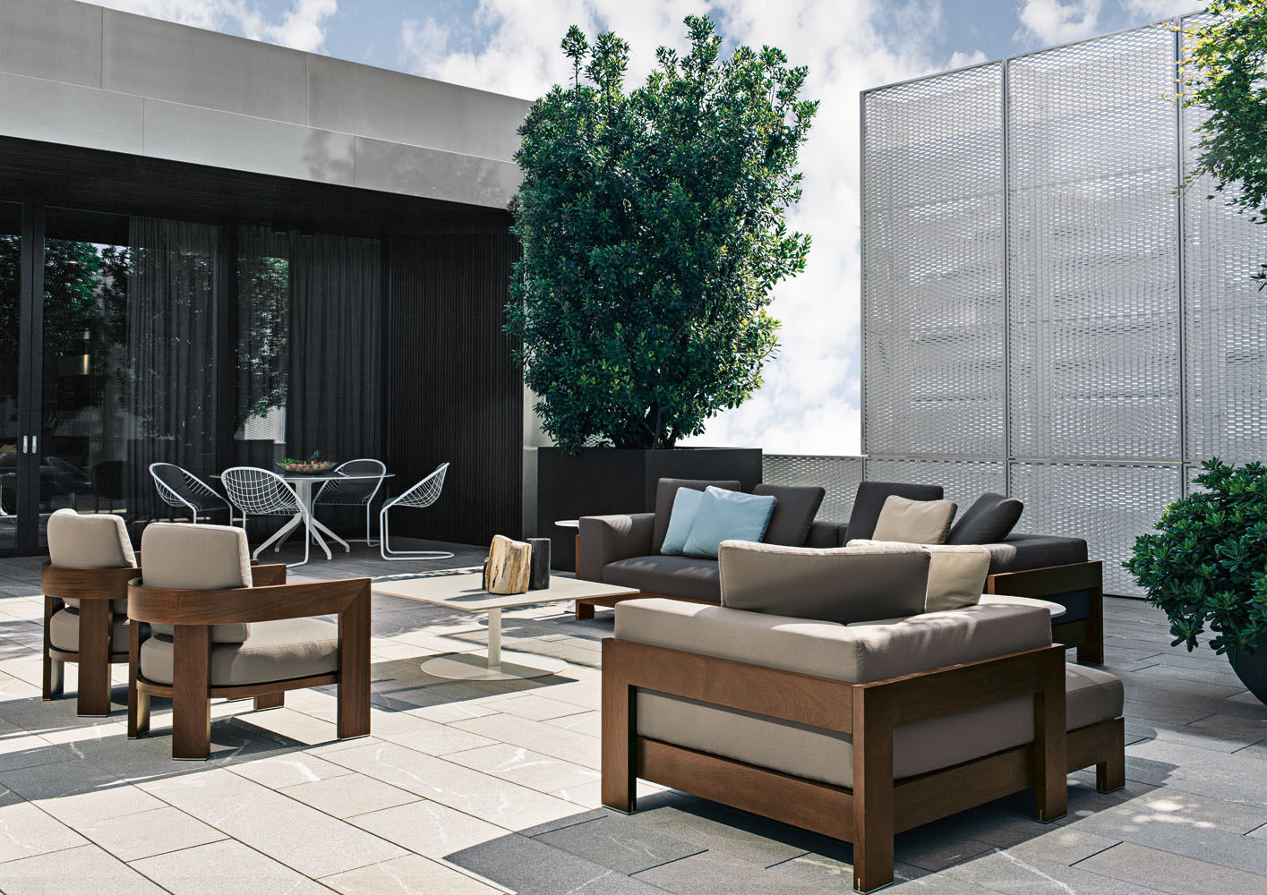 Уличный диван Alison из массива ироко — воплощение природной эстетики и лаконичной формы. Структура выполнена из обработанного тика, устойчивого к влаге и перепадам температур. Широкие деревянные подлокотники и отсутствие плетения подчеркивают естественную текстуру материала. Подушки с водоотталкивающими чехлами из уличных тканей Minotti дополняют образ.
