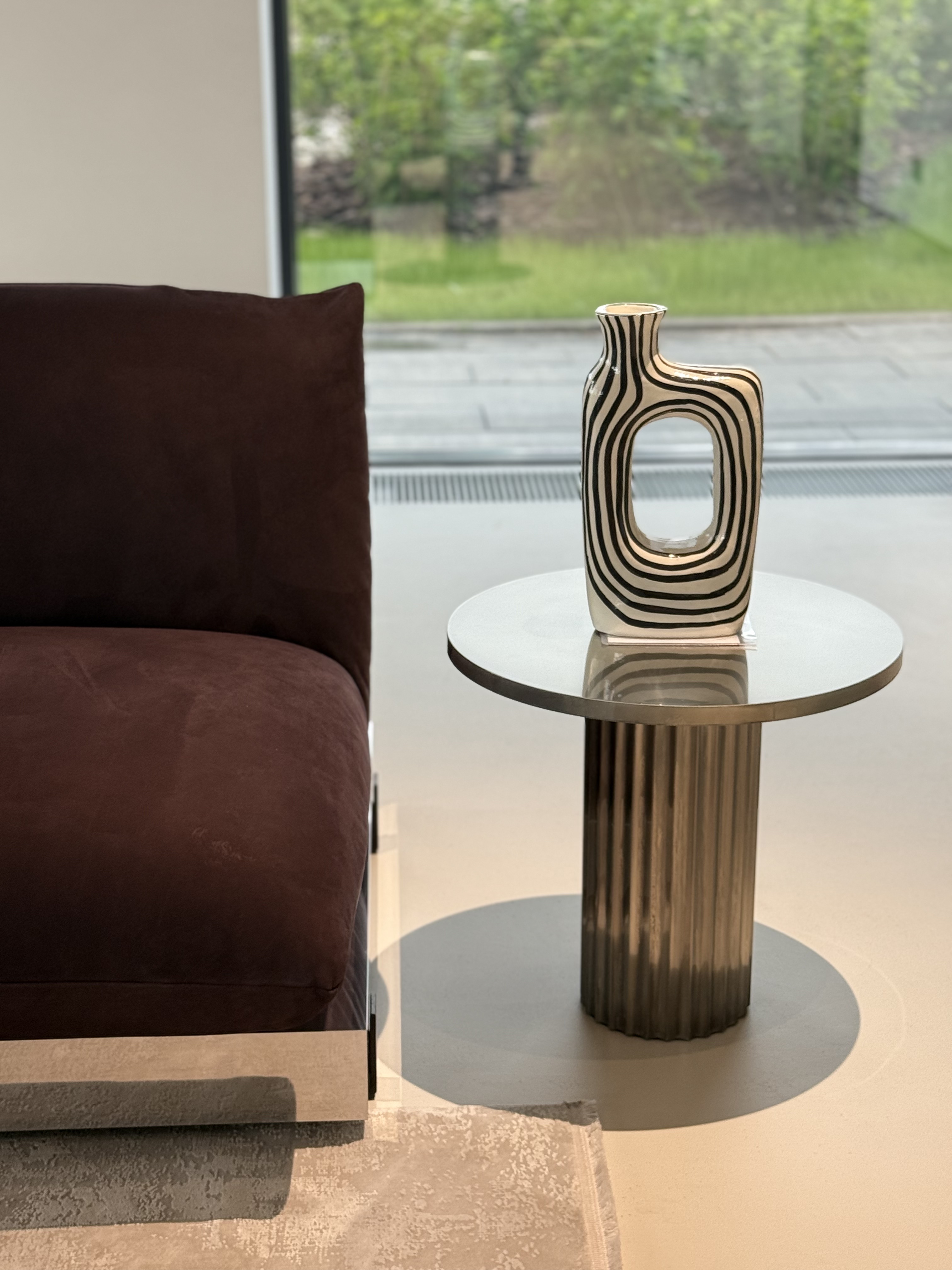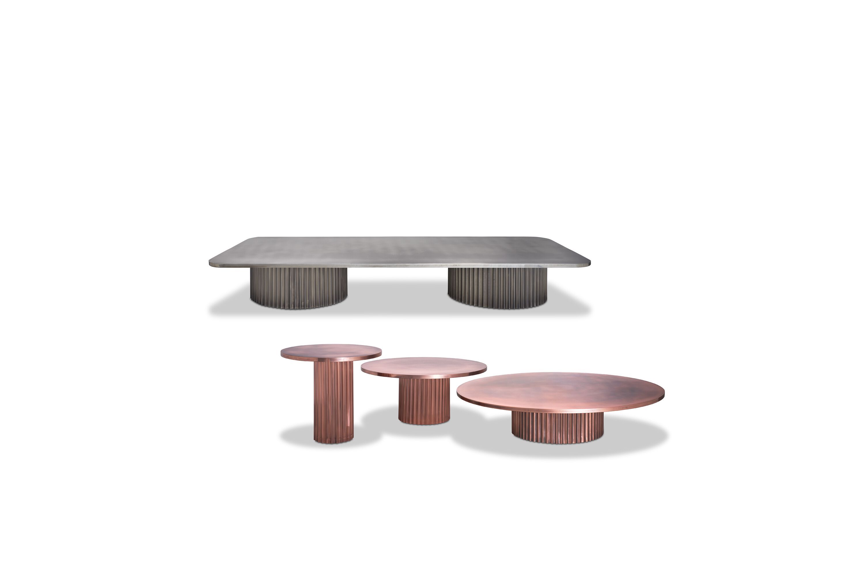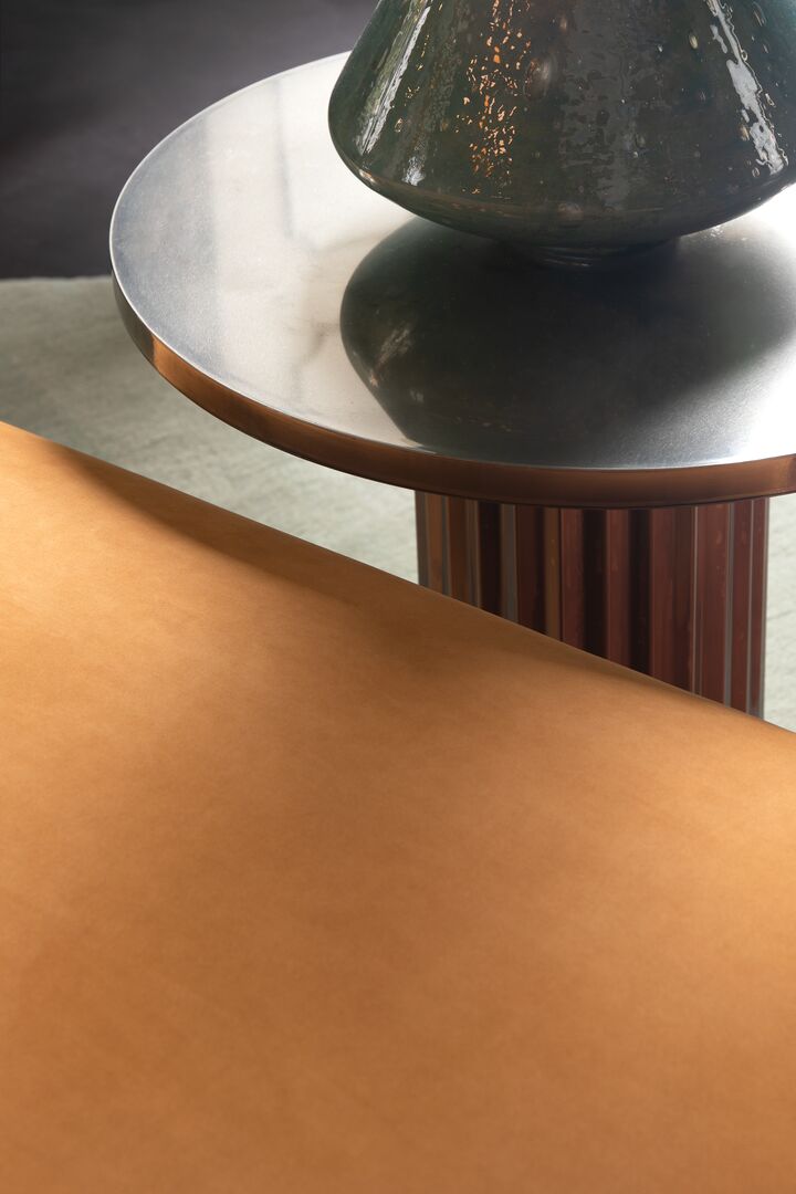 Кофейный столик Allure переосмысливает геометрию круга, объединяя три масштаба в одном предмете. Поверхность — из антикварного металла (альпака, медь или латунь) с глянцевым финишем, основание — визуально напоминает дорические колонны, отсылая к концептуальной архитектуре Северной Европы XX века.
