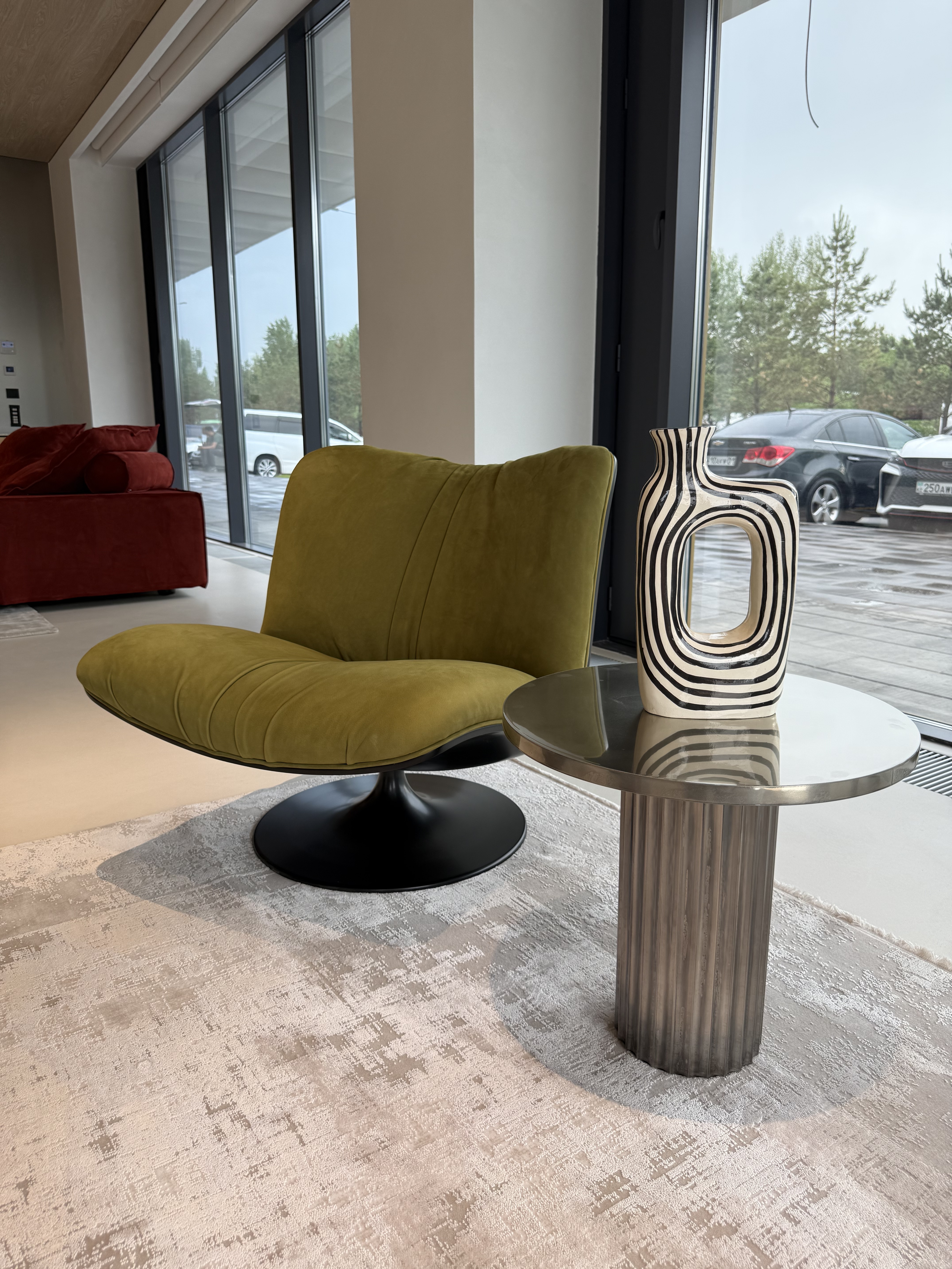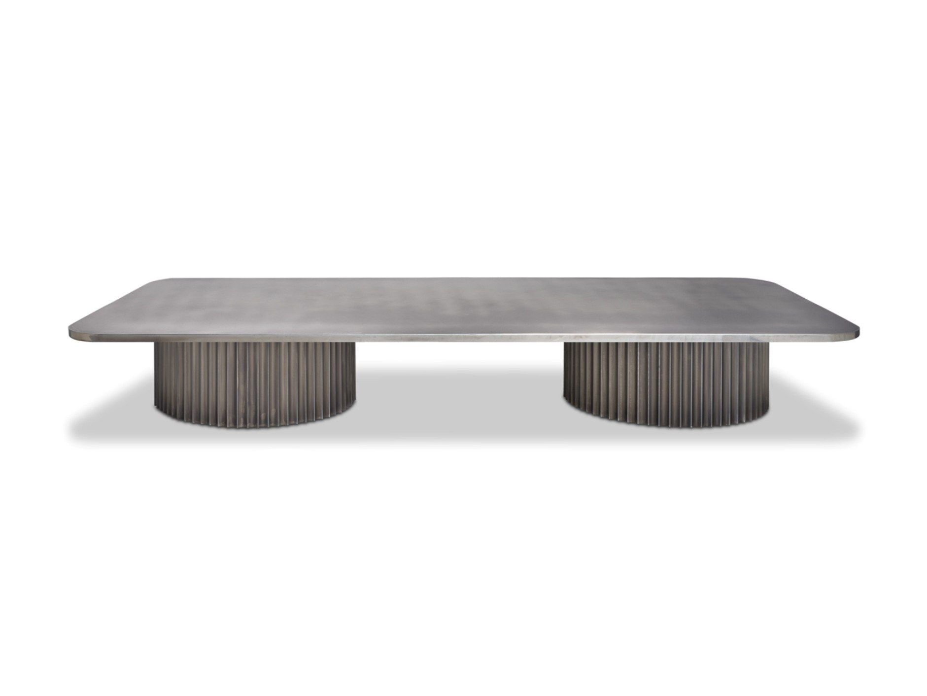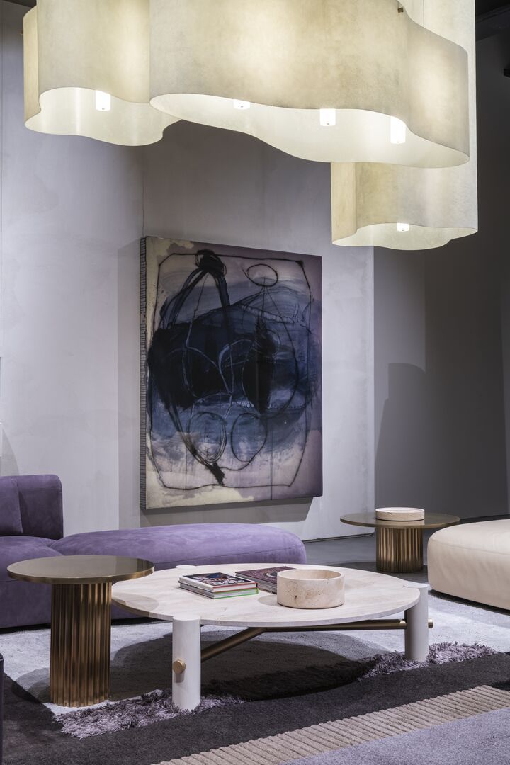 Кофейный столик Allure переосмысливает геометрию круга, объединяя три масштаба в одном предмете. Поверхность — из антикварного металла (альпака, медь или латунь) с глянцевым финишем, основание — визуально напоминает дорические колонны, отсылая к концептуальной архитектуре Северной Европы XX века.