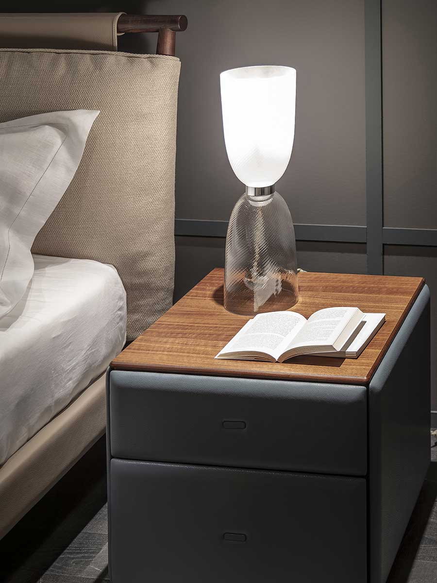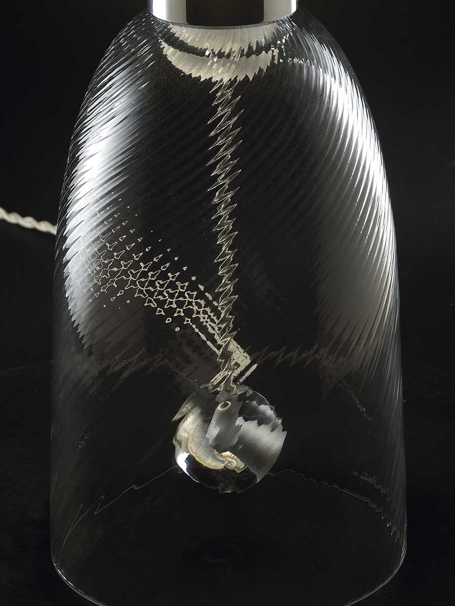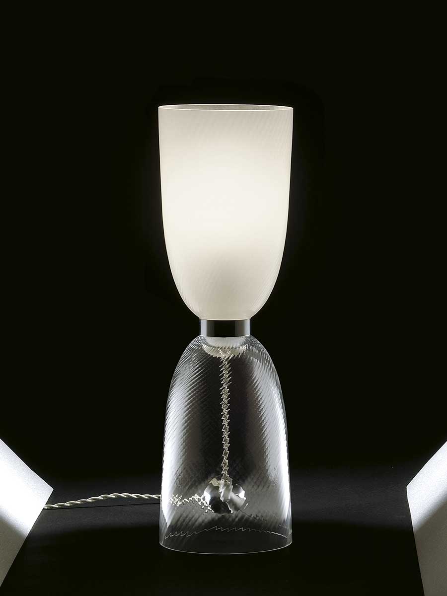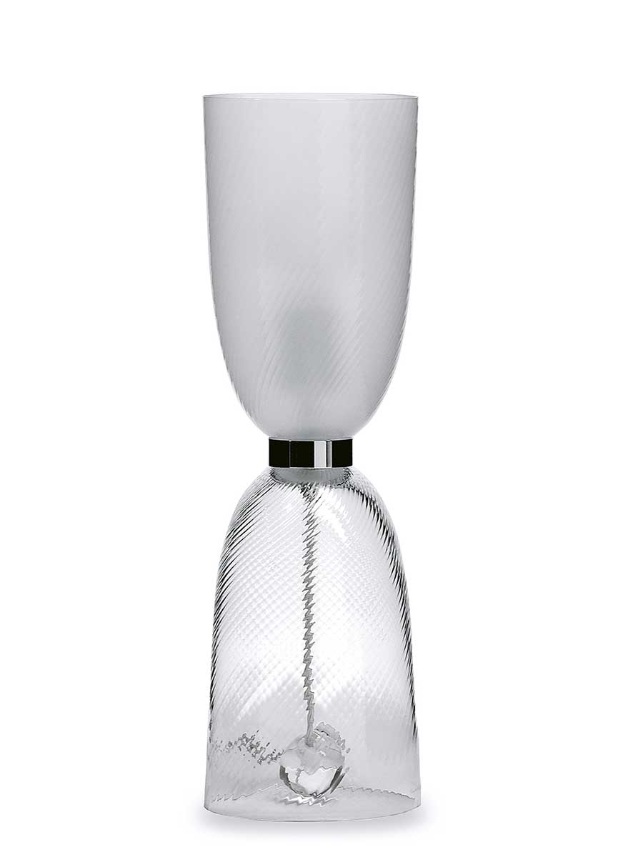 Настольная лампа Alma изготовлена из прозрачного ребристого стекла и состоит из двух перекрывающих друг друга колокольчиков, которые создают светящиеся песочные часы.