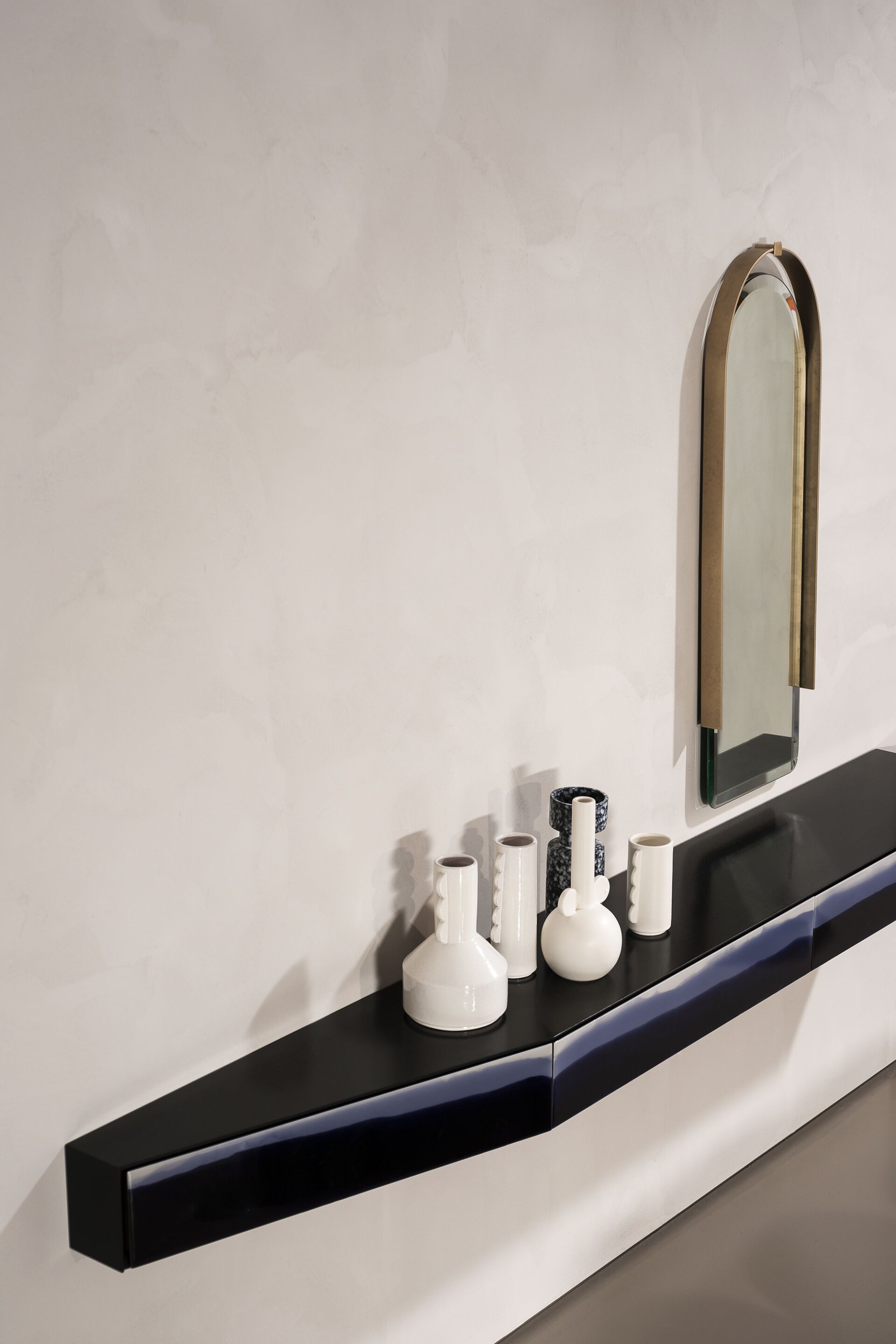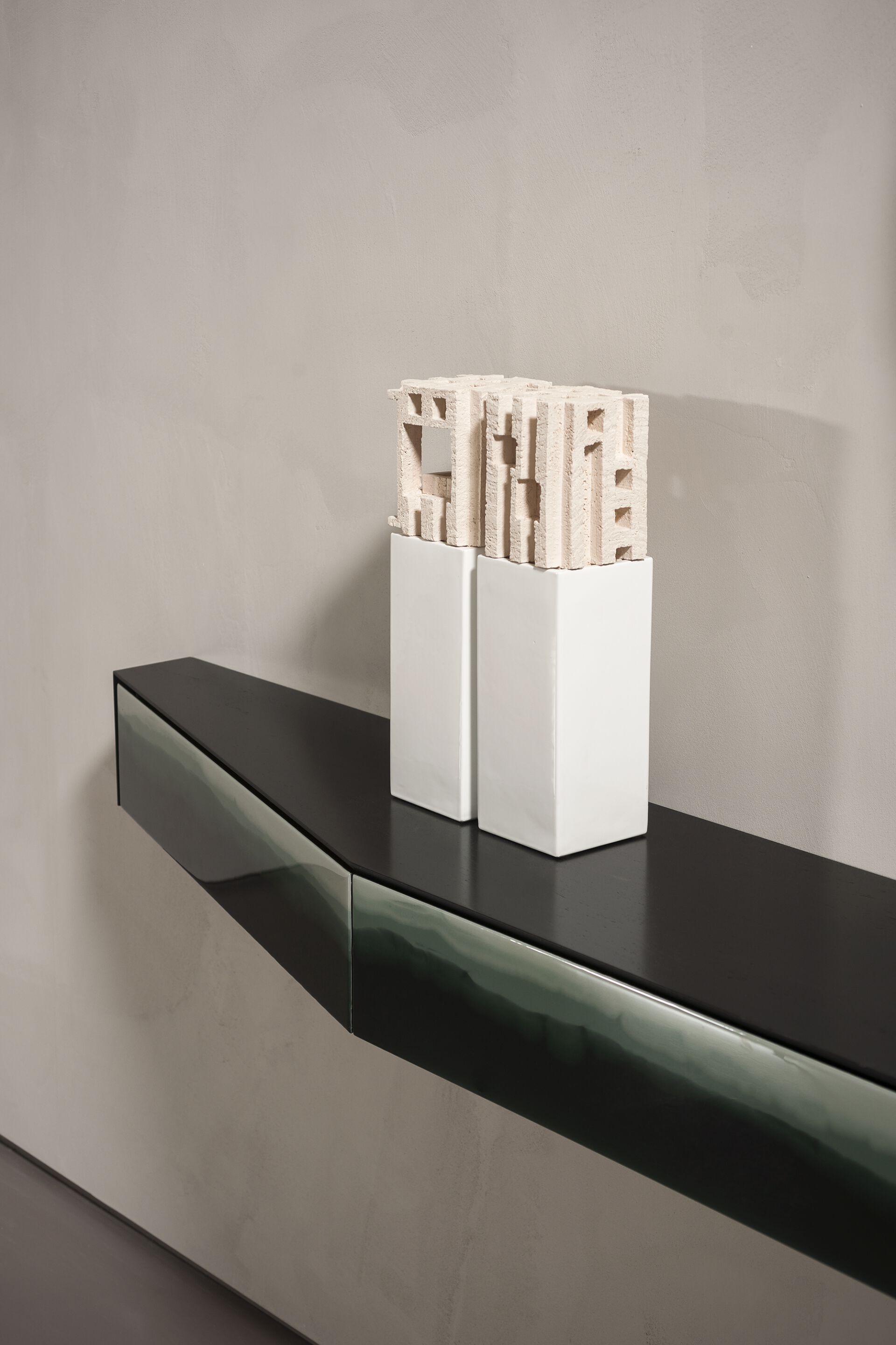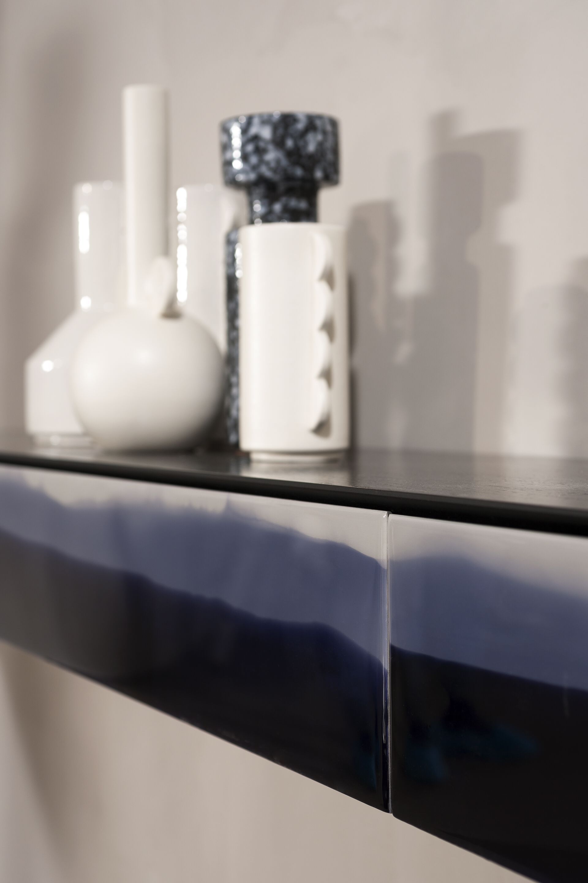 Структура из МДФ, внутренняя отделка — натуральный клен, внешняя — шпон эбенового дерева с тёмным морением и глянцевым водным лаком (70 gloss). Фасады ящиков и дверцы оформлены вручную при помощи художественно нанесённых смол.