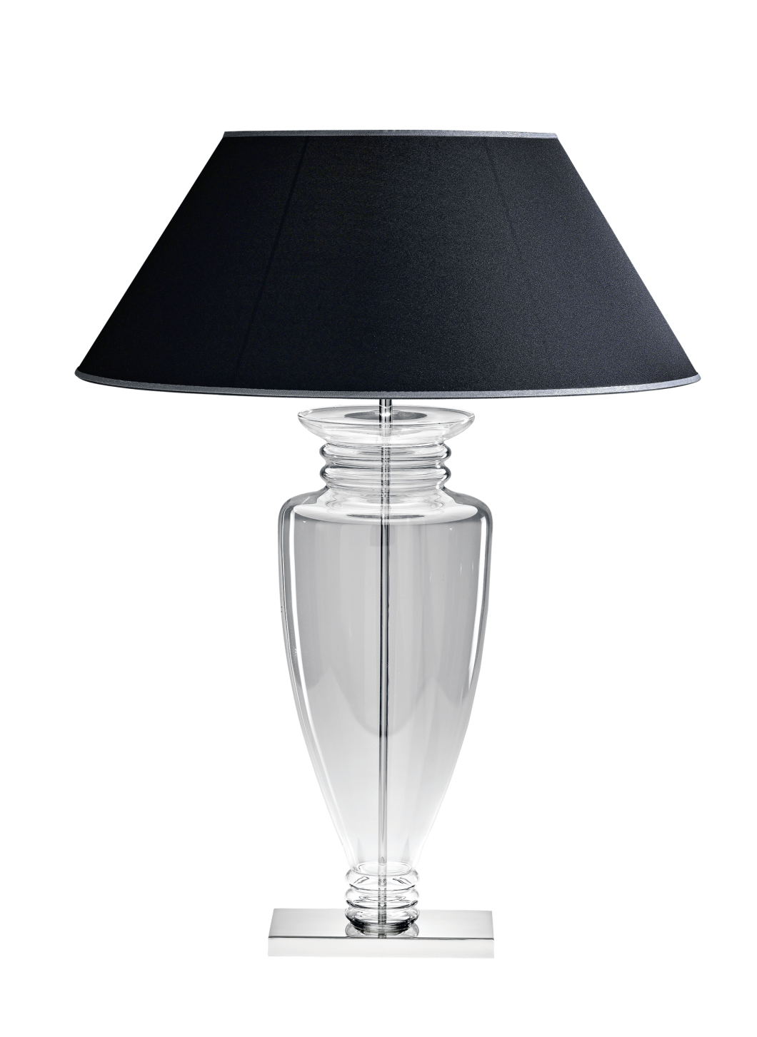 Настольная лампа из выдувного стекла с металлическим основанием с никелированным покрытием. Абажур из чёрной ткани.