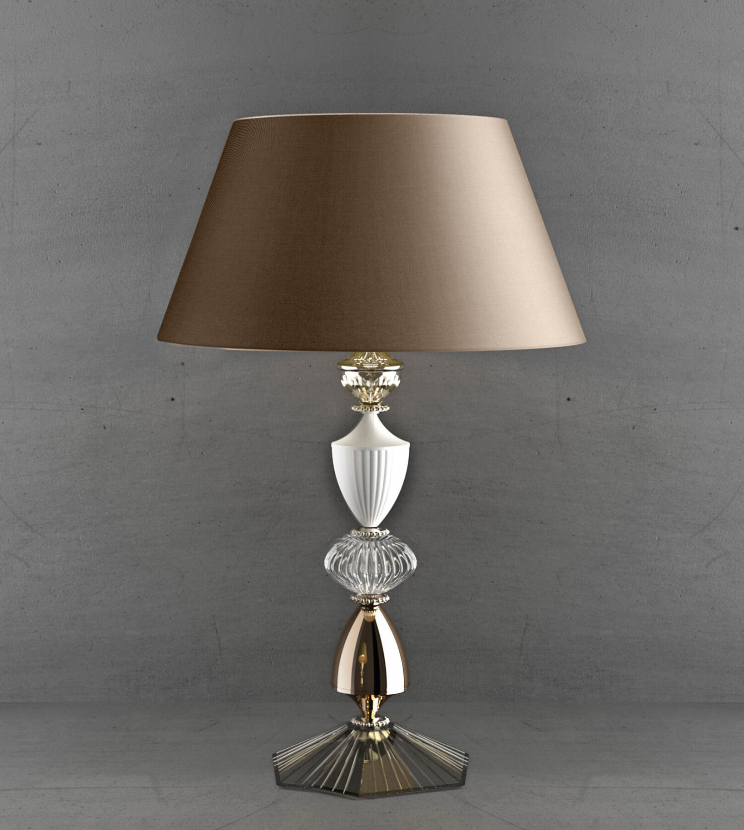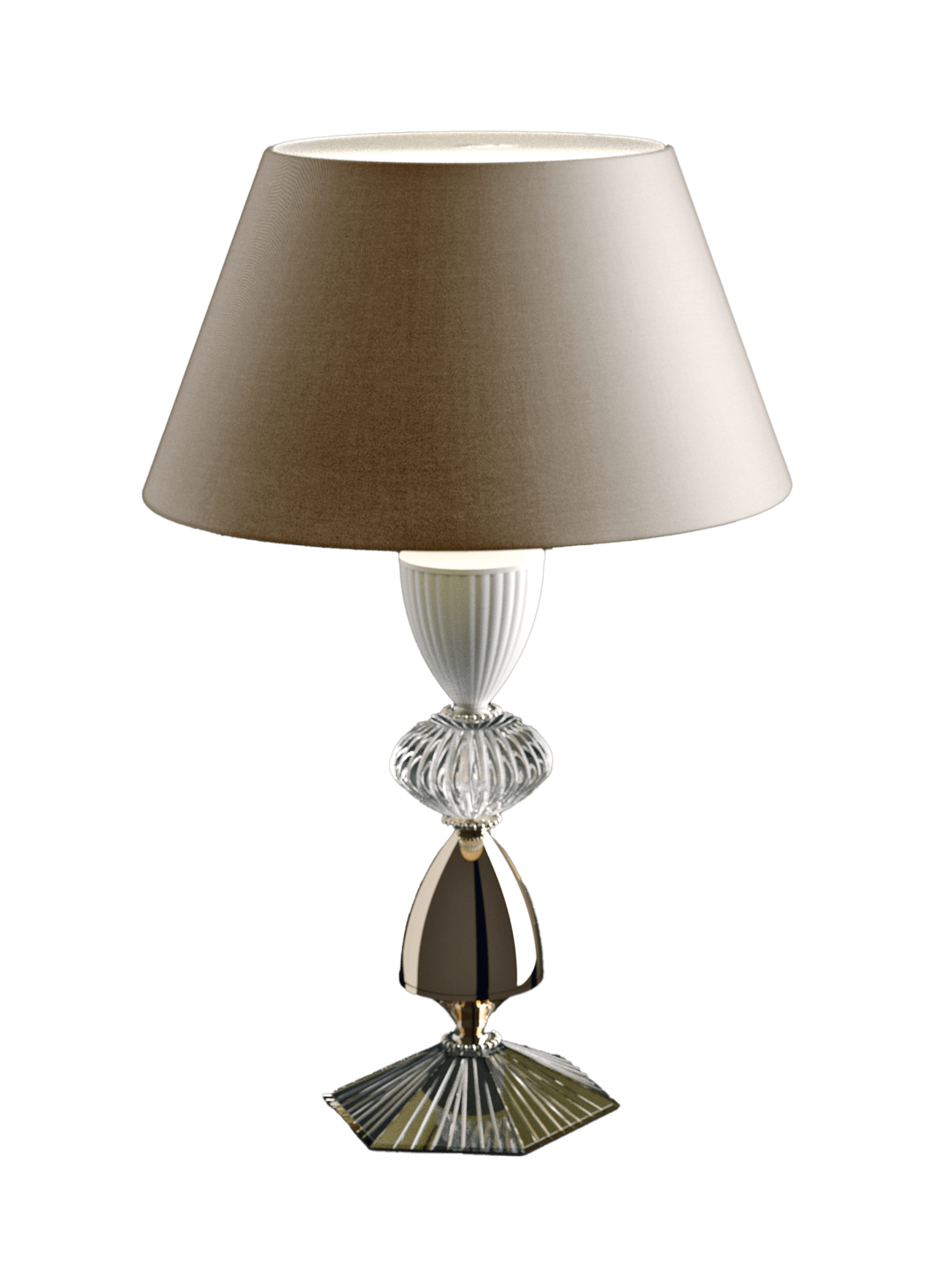 Настольная лампа из тикового хрусталя, каркас из металла с никелированной и белой металлической отделкой, абажуры из ткани.