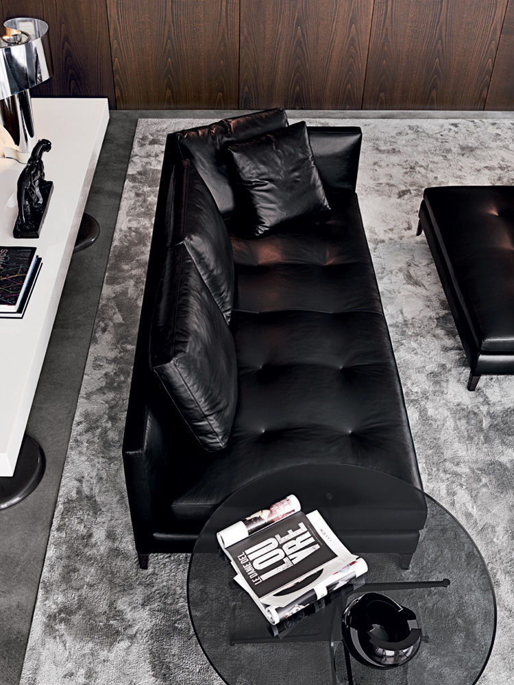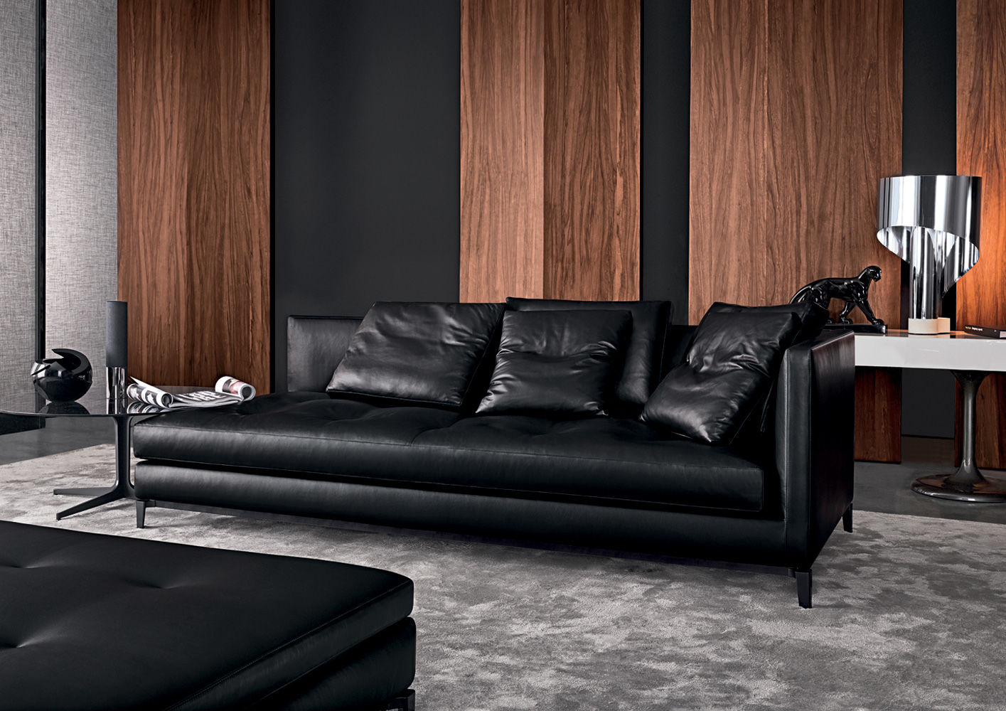 Материалы: каркас из массива древесины и фанеры; наполнение — многослойный пенополиуретан, полиэфирное волокно, пух; обивка — ткань или кожа из коллекции Minotti; основание — литой алюминий с отделкой Black-Nickel