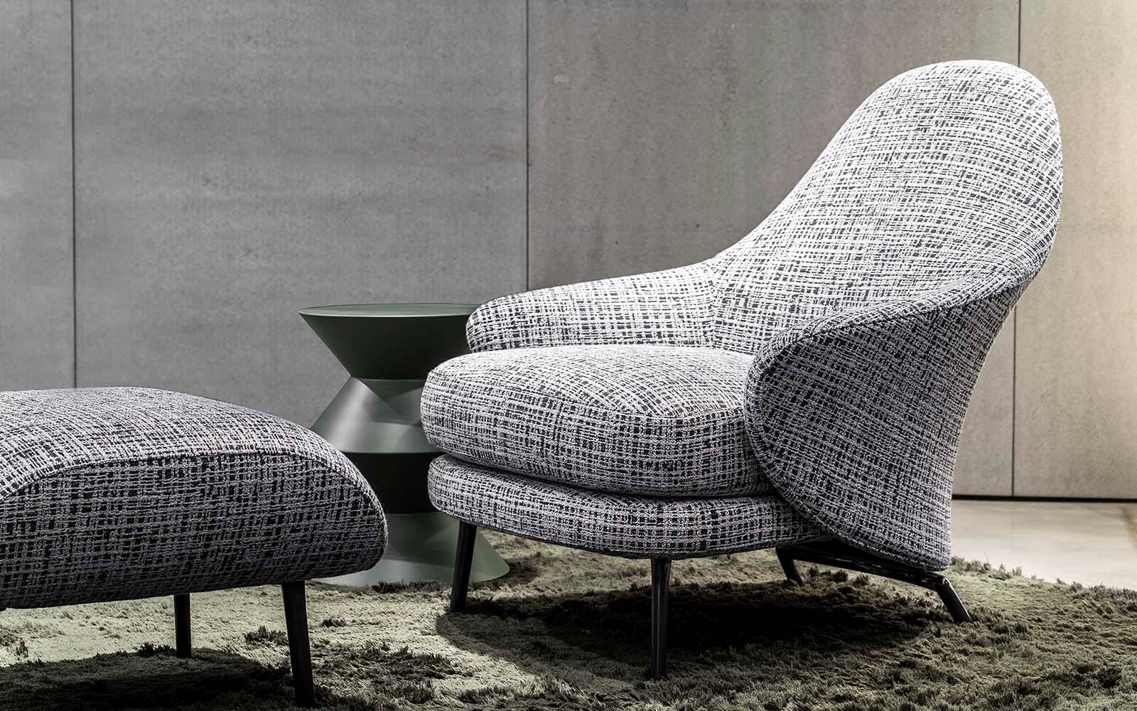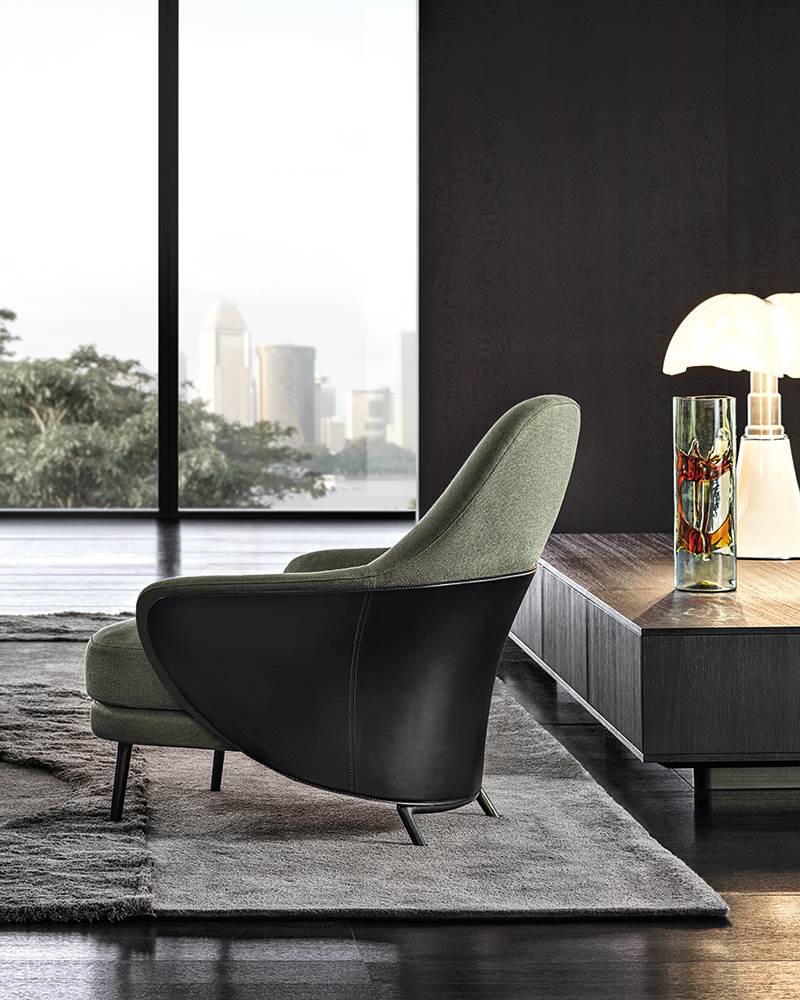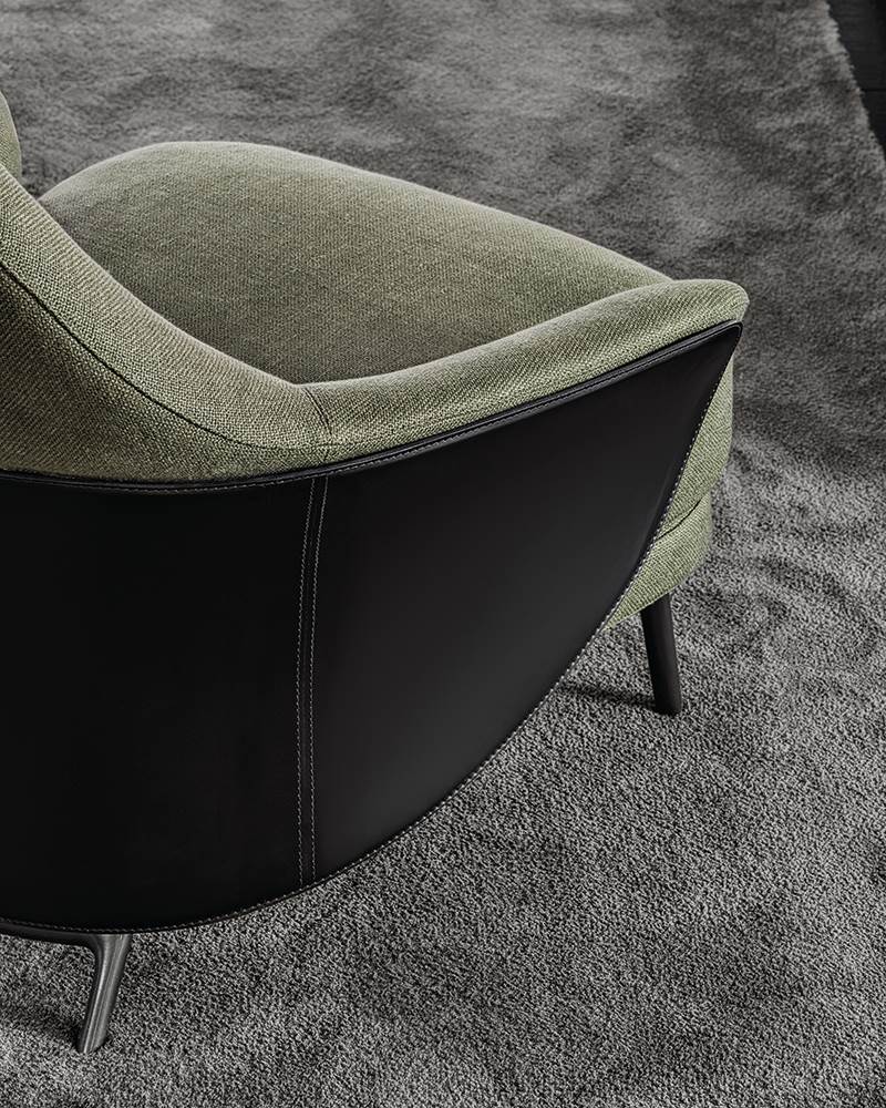 Angie — выразительное кресло с обволакивающей формой спинки и акцентными подлокотниками, обтянутыми кожей Saddle-Hide. Визуальный образ кресла вдохновлён классикой 50-х годов, переосмысленной в современном ключе.