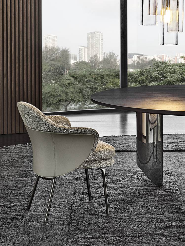 Студия GamFratesi работала над идеей контраста, подчеркивая и противопоставляя жесткий каркас из седельной кожи или кожаного элемента с мягкостью обитой части, которая также видна на спинке, создавая интересные цветовые комбинации седельной кожи и ткани. Ножки выполнены из литого алюминия цвета Pewter, а уникальная изогнутая рама соединяет задние ножки, подчеркивая изгиб корпуса.