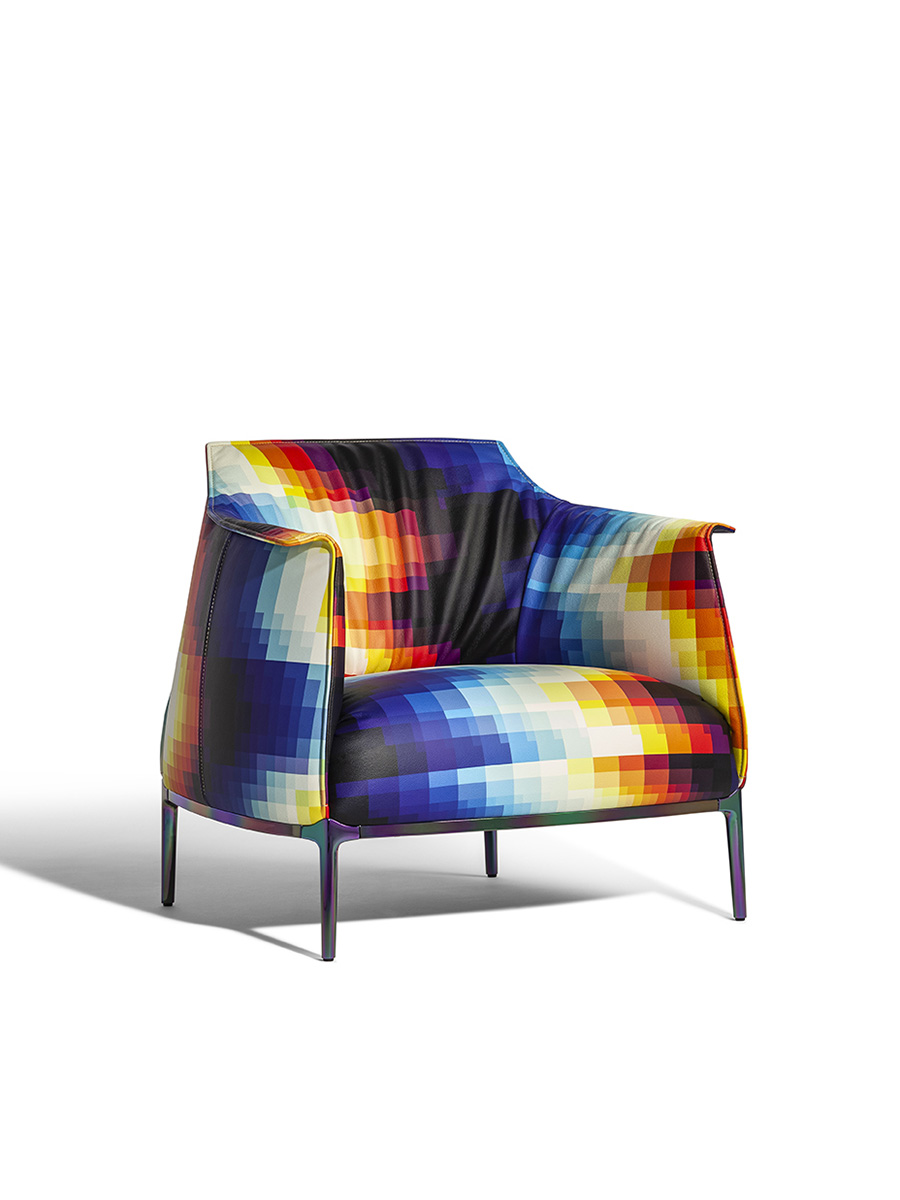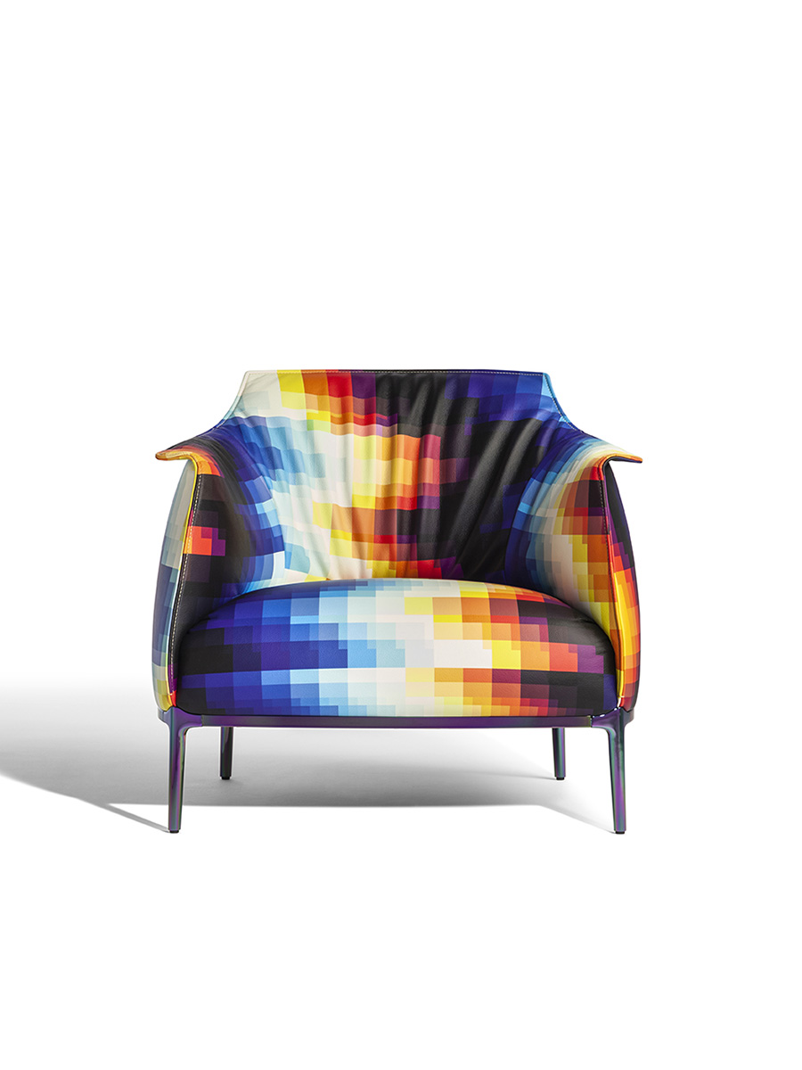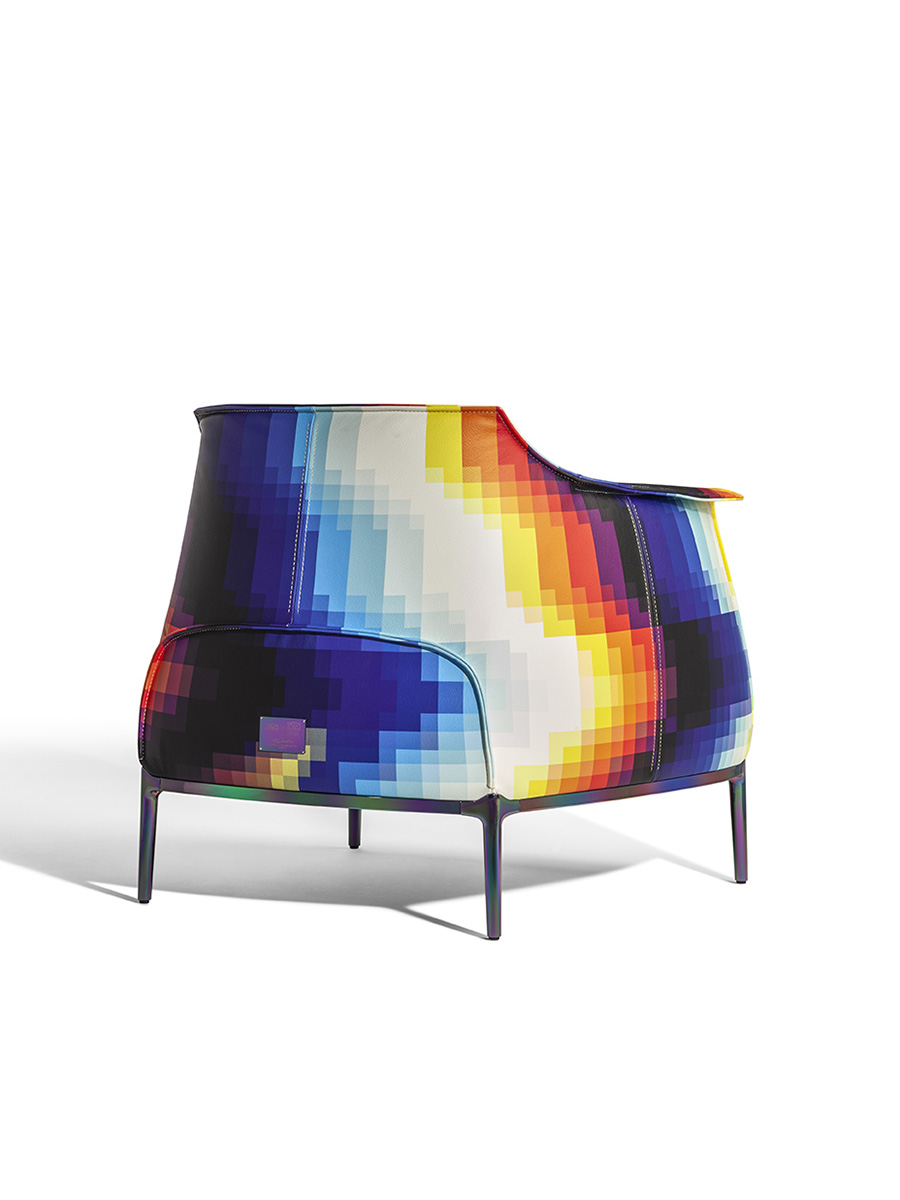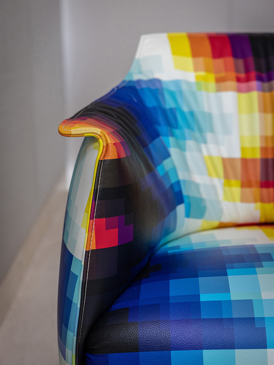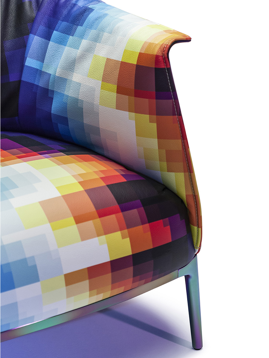 Арчибальд, разработанный Жаном-Мари Массо, — это широкое и глубокое кресло со стальным каркасом, наполненное формованным пенополиуретаном и полиэстерной ватой для большего комфорта. Его отличает приятная фактурная кожаная обивка и откидные подлокотники, напоминающие воротник рубашки. Благодаря технологии цифровой печати на коже, обычно применяемой для небольших роскошных кожаных изделий, работа Фелипе Пантоне придаёт обивке тонкую палитру красных, оранжевых, жёлтых, белых и синих оттенков, напоминающую температуру на тепловой карте. Обивка выполнена из Pelle Frau® ColorSphere® Impact Less – инновационной кожи, выделанной с использованием экологичных компонентов без использования хрома для снижения воздействия на окружающую среду.