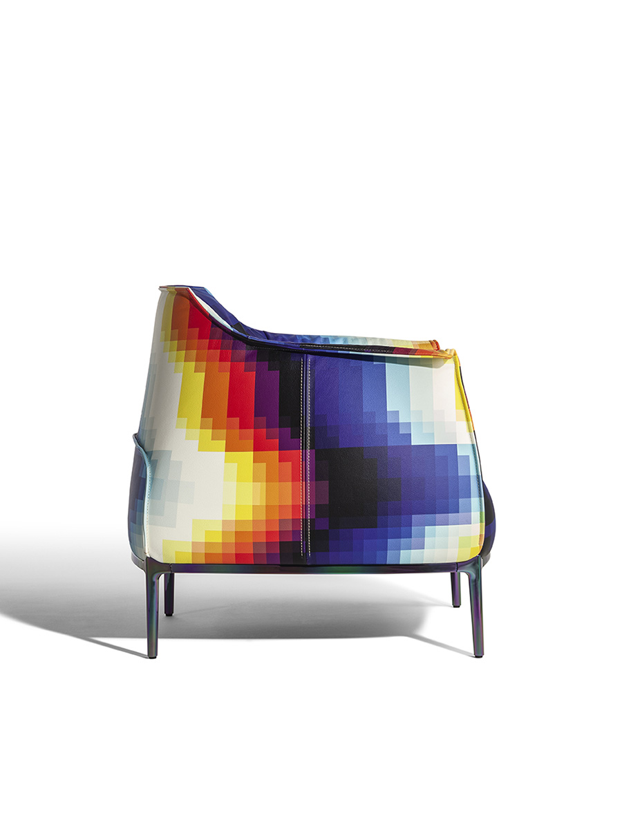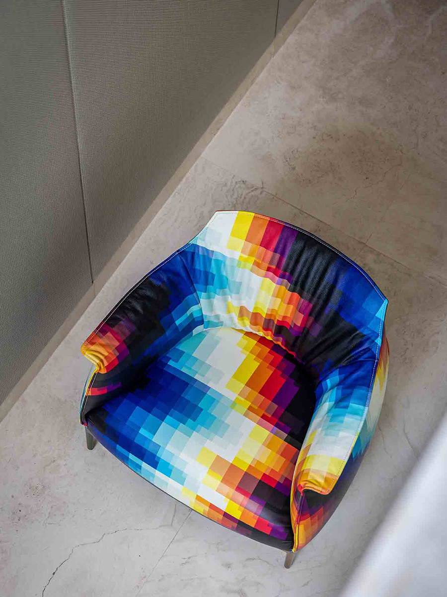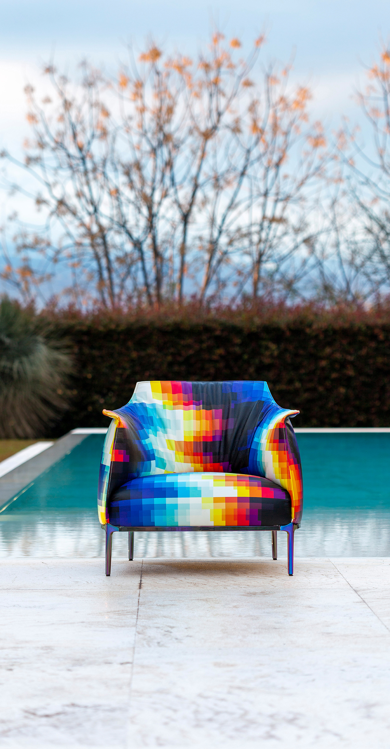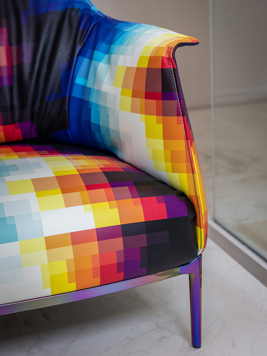 Арчибальд, разработанный Жаном-Мари Массо, — это широкое и глубокое кресло со стальным каркасом, наполненное формованным пенополиуретаном и полиэстерной ватой для большего комфорта. Его отличает приятная фактурная кожаная обивка и откидные подлокотники, напоминающие воротник рубашки. Благодаря технологии цифровой печати на коже, обычно применяемой для небольших роскошных кожаных изделий, работа Фелипе Пантоне придаёт обивке тонкую палитру красных, оранжевых, жёлтых, белых и синих оттенков, напоминающую температуру на тепловой карте. Обивка выполнена из Pelle Frau® ColorSphere® Impact Less – инновационной кожи, выделанной с использованием экологичных компонентов без использования хрома для снижения воздействия на окружающую среду.