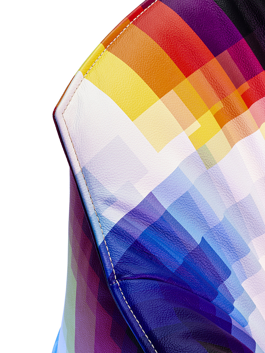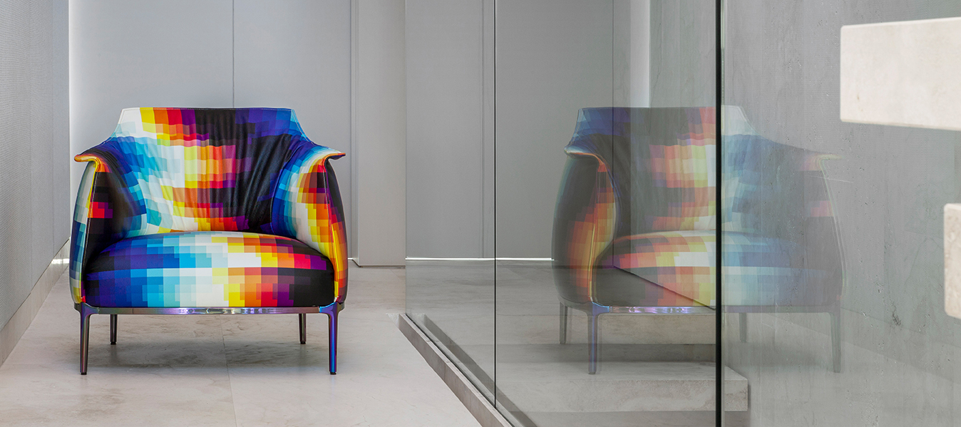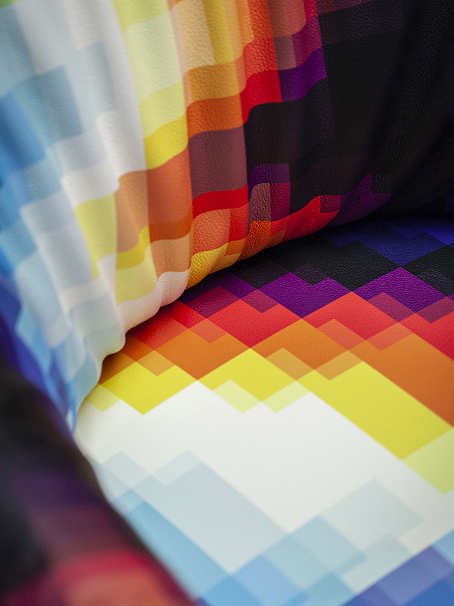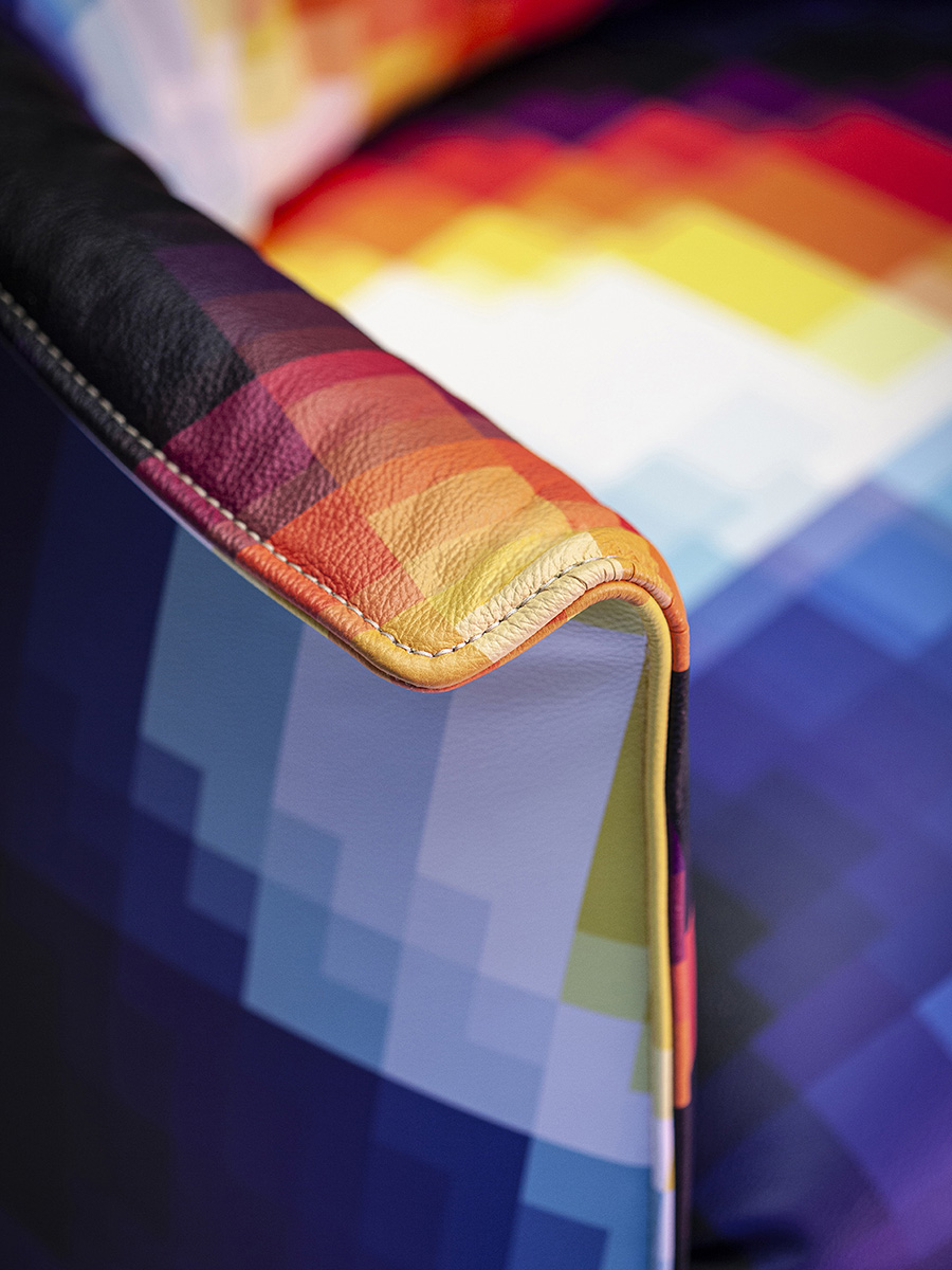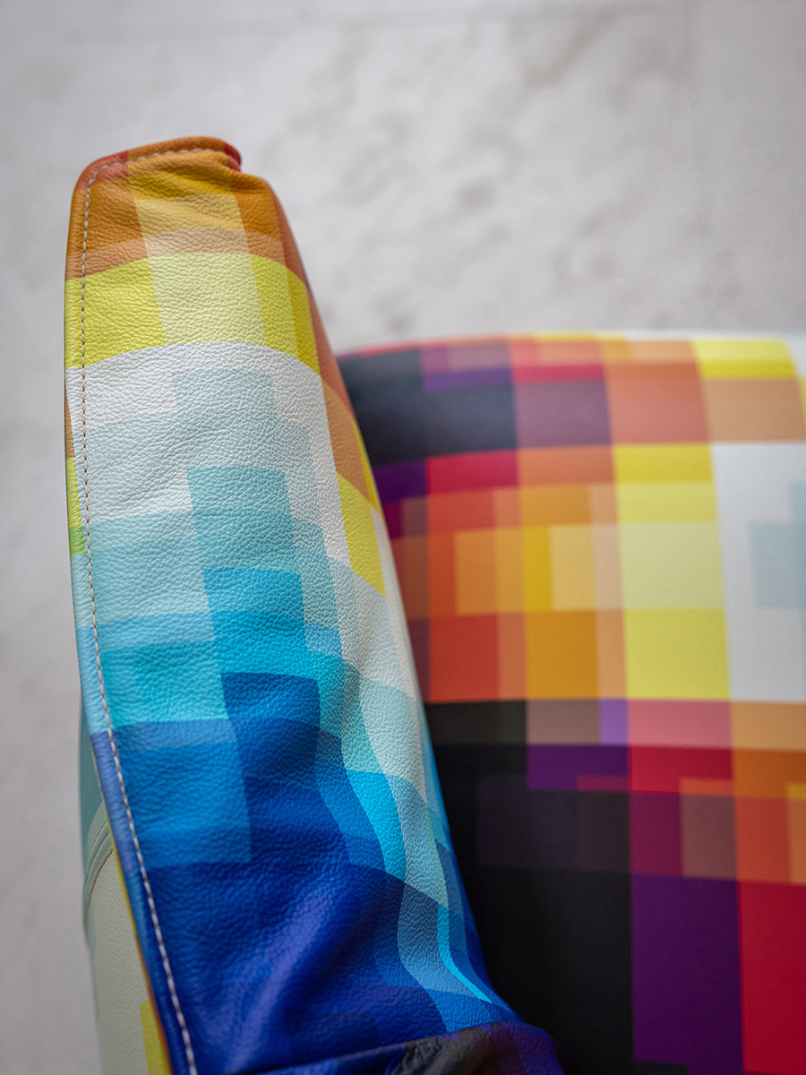 Арчибальд, разработанный Жаном-Мари Массо, — это широкое и глубокое кресло со стальным каркасом, наполненное формованным пенополиуретаном и полиэстерной ватой для большего комфорта. Его отличает приятная фактурная кожаная обивка и откидные подлокотники, напоминающие воротник рубашки. Благодаря технологии цифровой печати на коже, обычно применяемой для небольших роскошных кожаных изделий, работа Фелипе Пантоне придаёт обивке тонкую палитру красных, оранжевых, жёлтых, белых и синих оттенков, напоминающую температуру на тепловой карте. Обивка выполнена из Pelle Frau® ColorSphere® Impact Less – инновационной кожи, выделанной с использованием экологичных компонентов без использования хрома для снижения воздействия на окружающую среду.