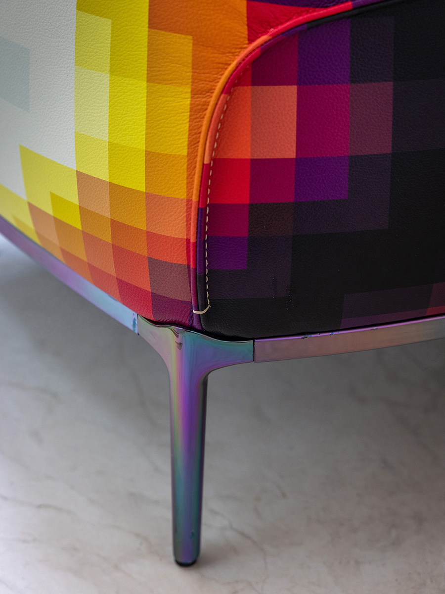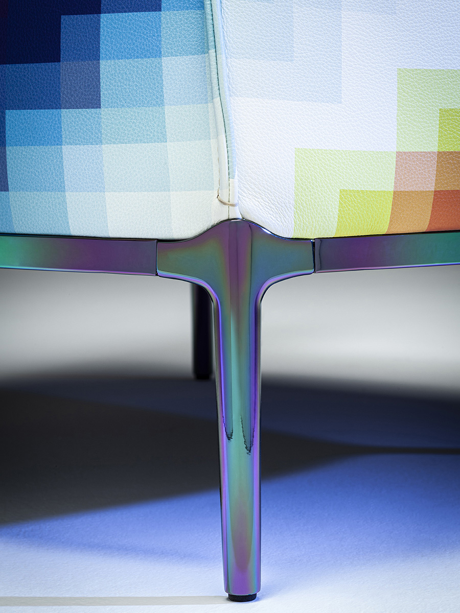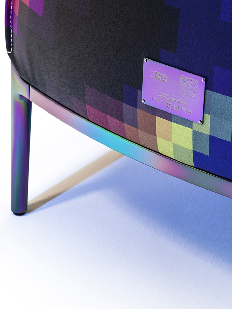 Чтобы подчеркнуть цветовую гамму поверхности, основание, состоящее из четырёх литых алюминиевых ножек и стального каркаса, имеет многоцветное хромированное покрытие: специальную переливающуюся краску, которая в зависимости от цвета и света создаёт яркий пурпурно-синий оттенок. Латунная табличка, выполненная в том же цвете, что и основание, украшена подписью художника и надписью «ONE OF 110». Кроме того, к каждой модели Archibald Limited Anniversary Edition прилагается специальный набор для чистки и эксклюзивный клатч, выполненный из той же разноцветной кожи, что и обивка, и содержащий сертификат подлинности изделия, подписанный художником.