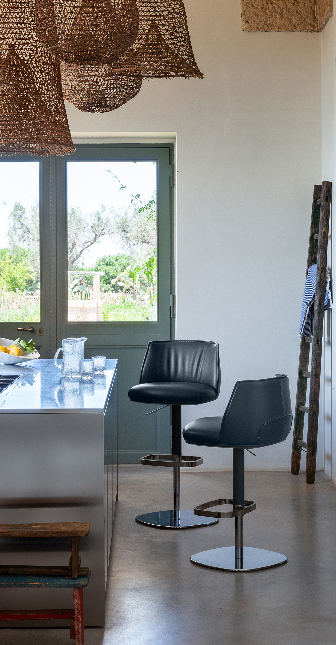 Каркас спинки стульев Archibald Stools изготовлен из формованного жёсткого полиуретана. Внутренняя обивка выполнена из мягкого формованного полиуретана и полиэстеровой ваты. Каркас сиденья изготовлен из берёзовой фанеры с наполнителем из пенополиуретана и полиэстеровой ваты. Он опирается на фартук, который соединяет его с основанием. Сиденье полностью обито кожей Pelle Frau® или тканью. Металлическое основание оснащено поворотным стальным стержнем, высота которого регулируется с помощью газовой пружины, приводимой в действие рычагом из нержавеющей стали, расположенным справа под сиденьем. Подставка для ног прямоугольного сечения из нержавеющей стали сужается изнутри наружу. Опорная пластина для пола также изготовлена из стали. Все видимые стальные поверхности отполированы до зеркального блеска, за исключением верхней части подставки для ног, которая имеет однонаправленную шлифовку.
