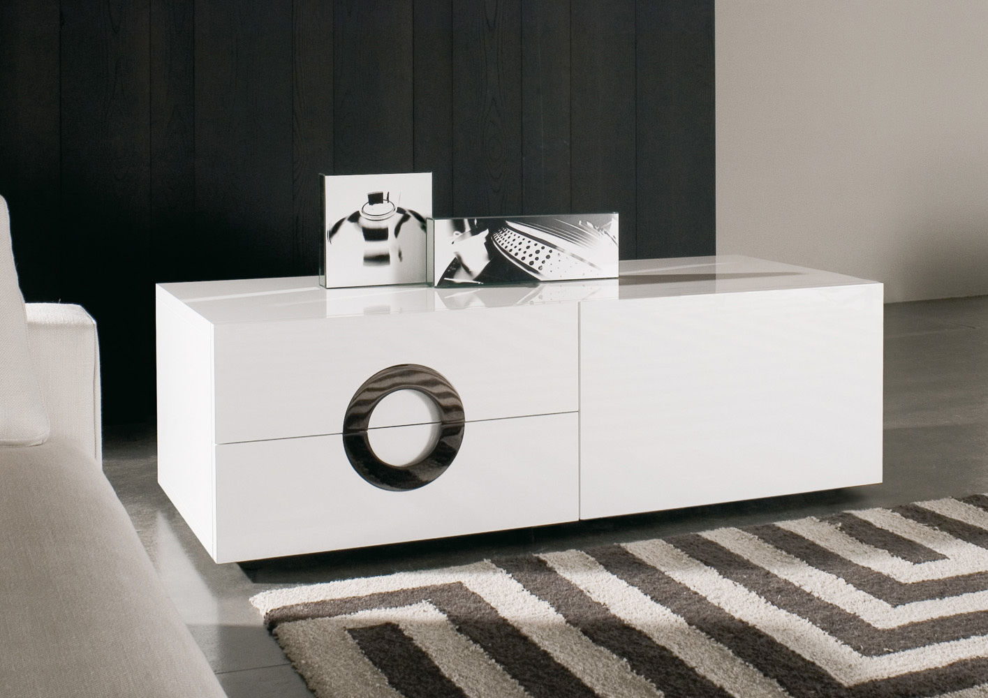 Материалы: корпус — шпон или лак; дверцы — лакированные панели, возможна вставка из стекла; основание — металл