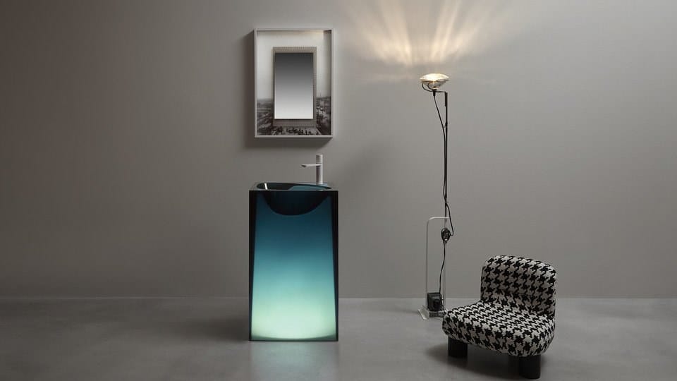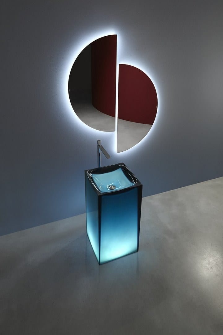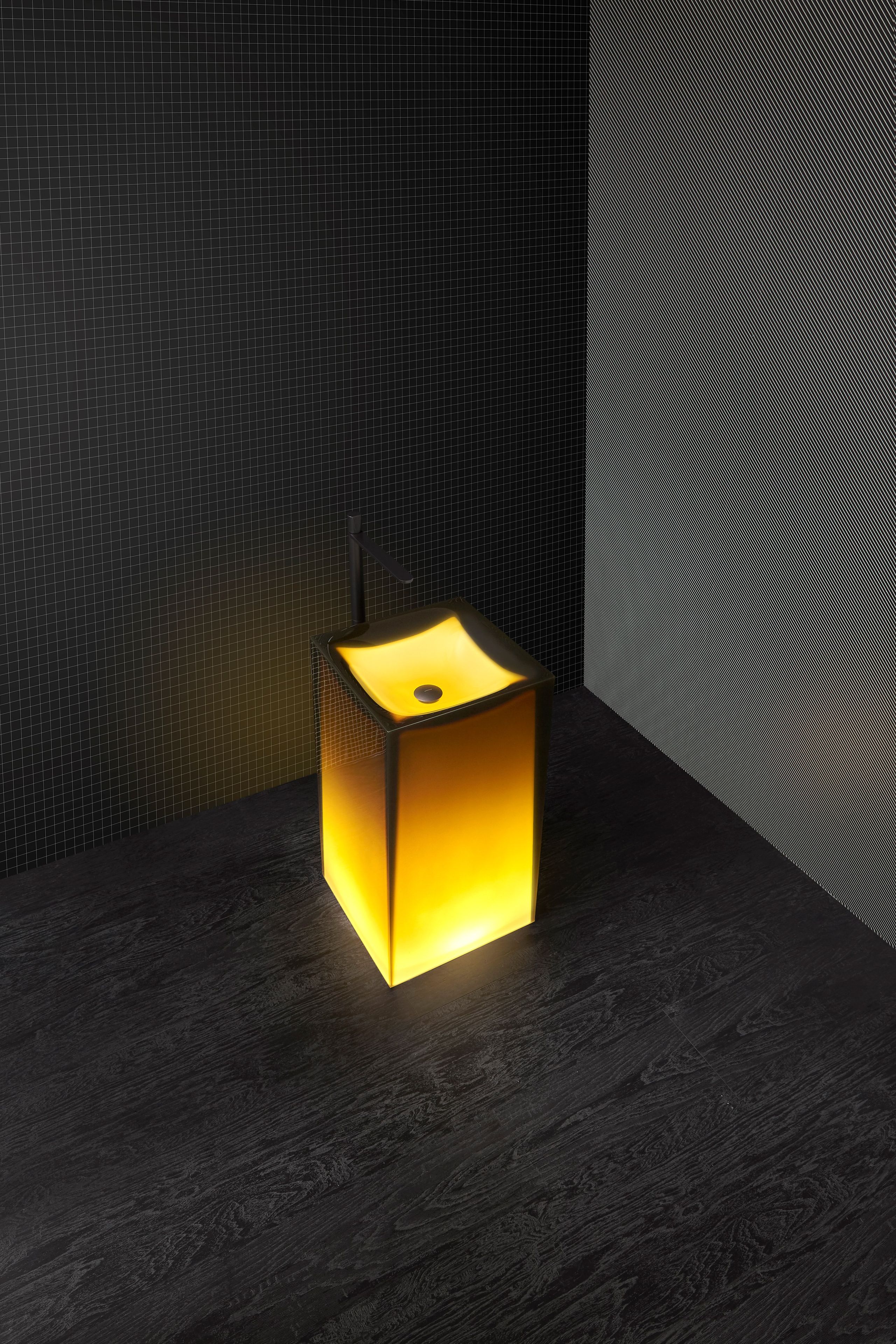 Отдельно стоящая раковина Cristalmood с напольным сливом, доступна в различных цветах согласно нашим образцам, с матовым основанием в комплекте с открытой заглушкой, сифоном и гибкой трубкой.