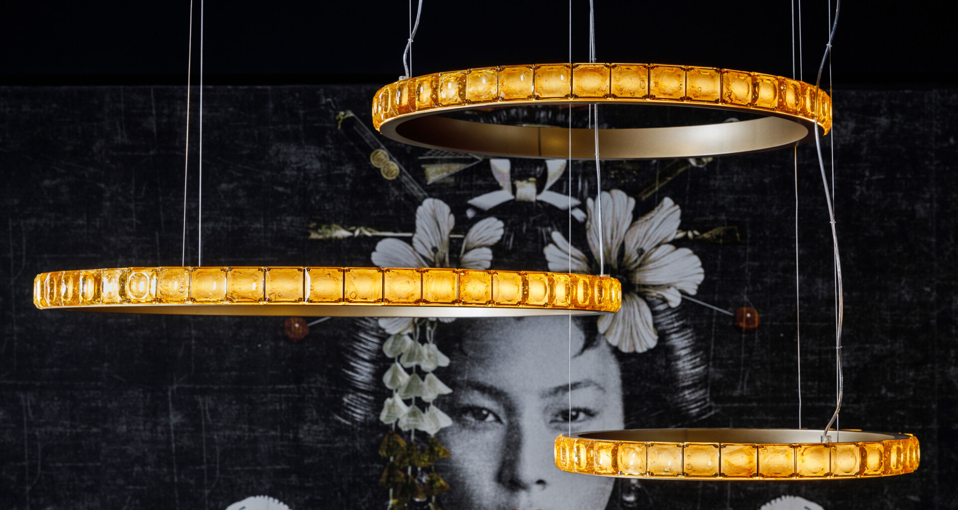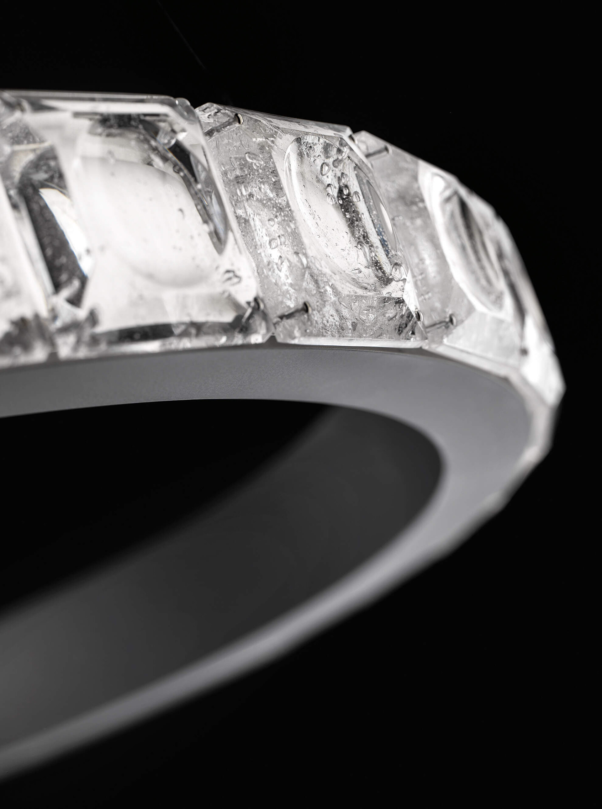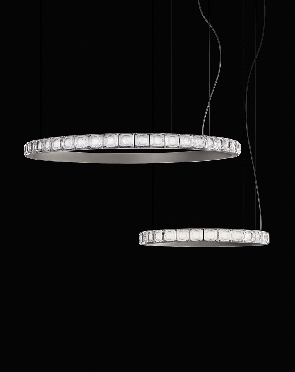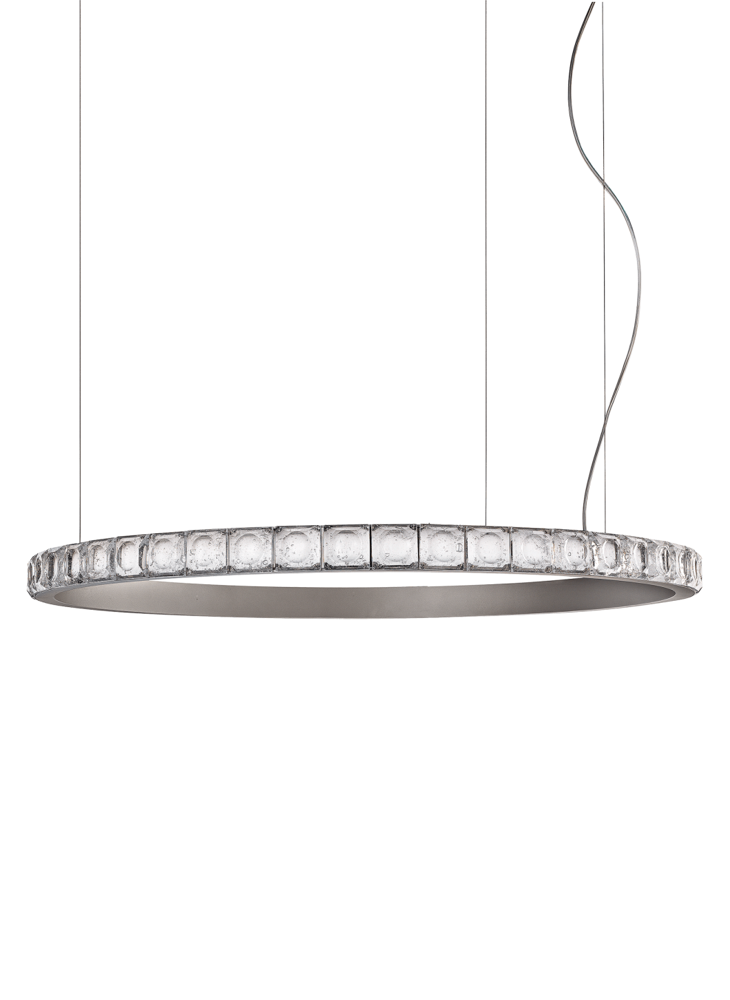 Подвесной светильник из металла с отделкой под сатинированную бронзу, сатинированное золото или сатинированное серебро. Рассеиватели из стекла с отделкой янтарного цвета или прозрачного крекинга.