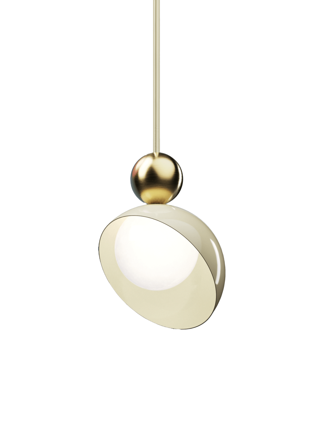 Подвесной светильник с каркасом и декоративными элементами из металла, доступен в цветах: античный белый, жёлтый восход, нежно-голубой, нежно-розовый и капучино. Центральная сфера покрыта матовым светло-золотым лаком. Рассеиватель из белого стекла.