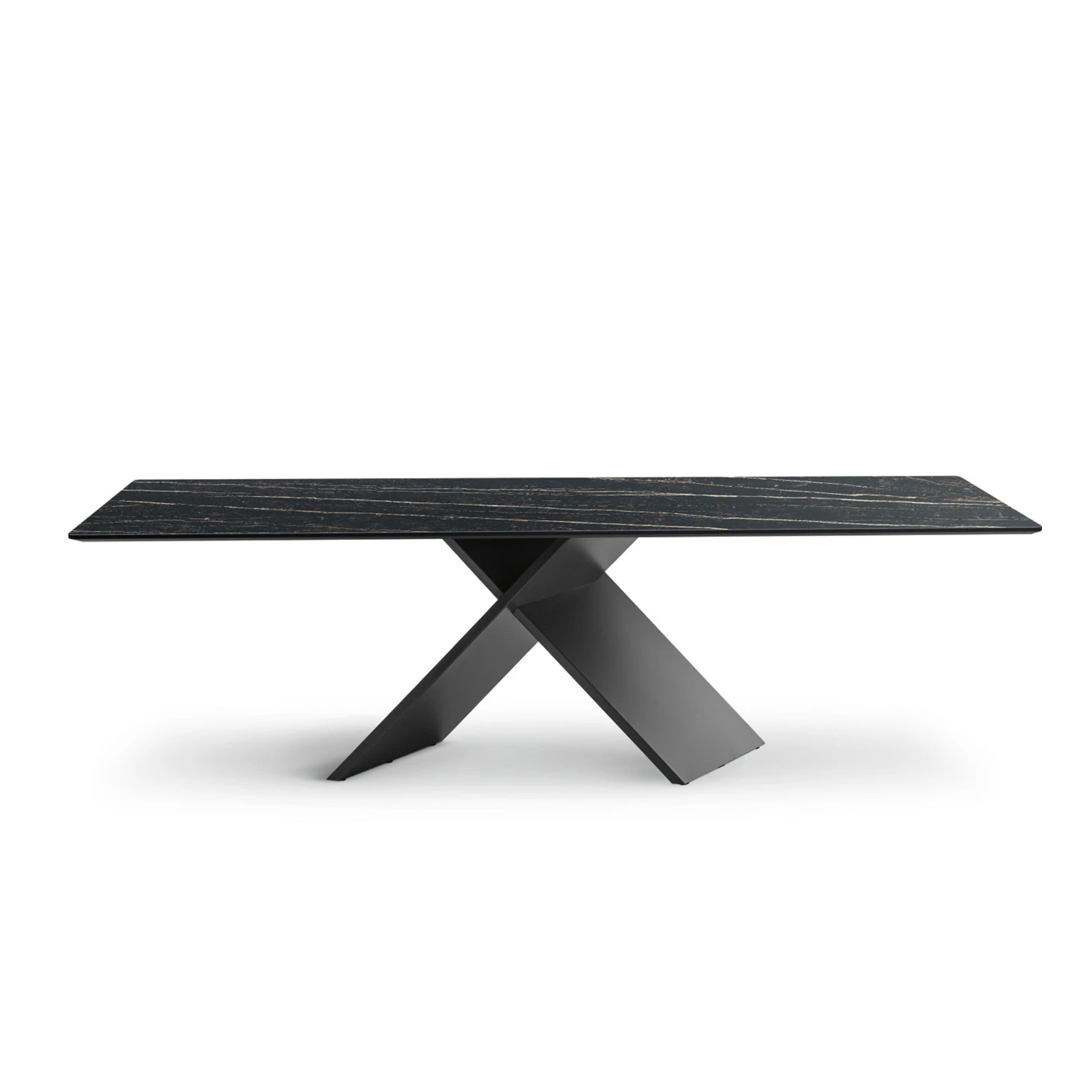 Современный облик модели подчеркивается сочетанием противоположных по характеру материалов: металлические ножки (в покраске или в патинированном исполнении) визуально и тактильно контрастируют с теплой текстурой столешницы, выполненной из дерева или керамики — как в фиксированной, так и в раздвижной версии.