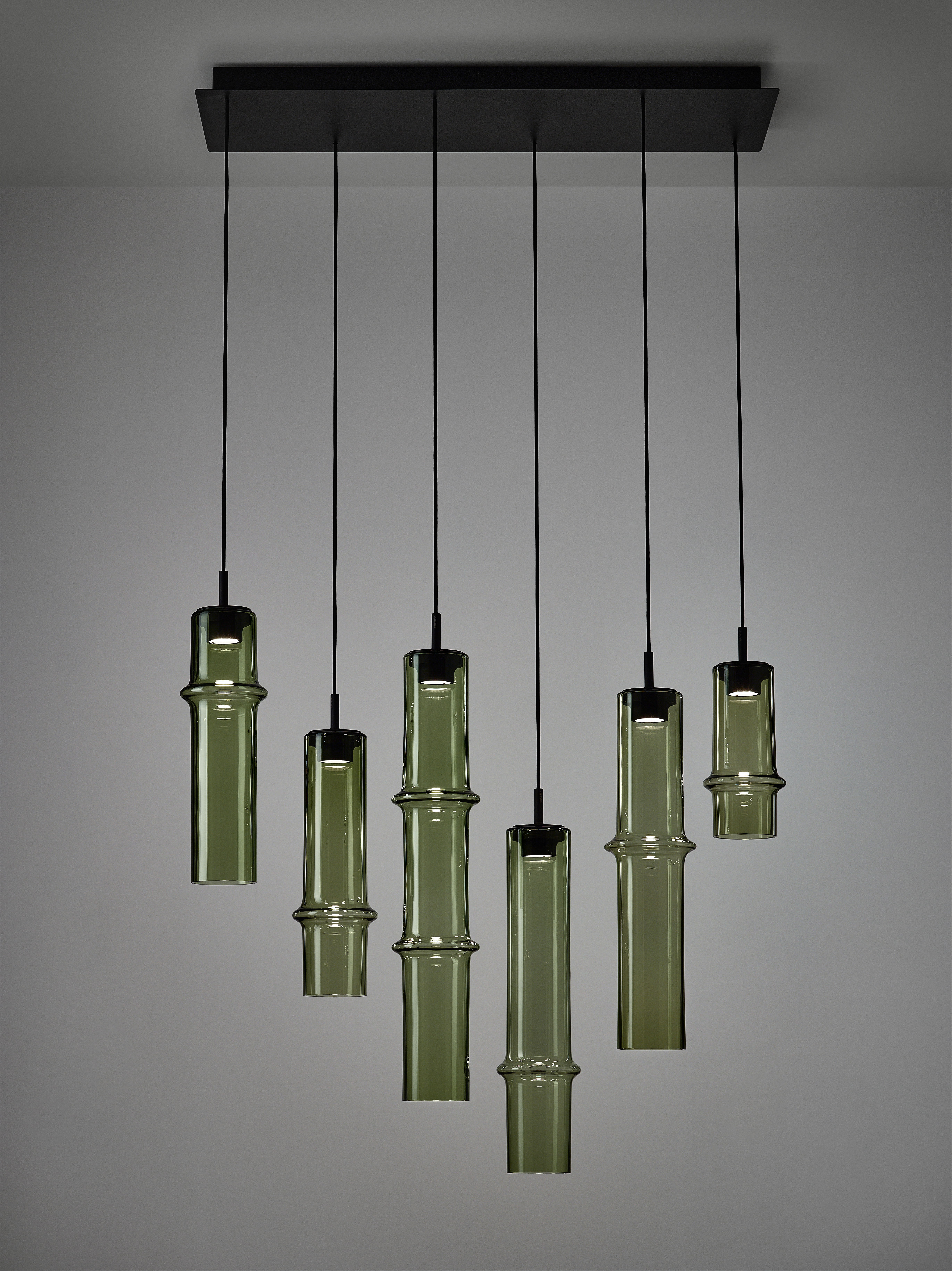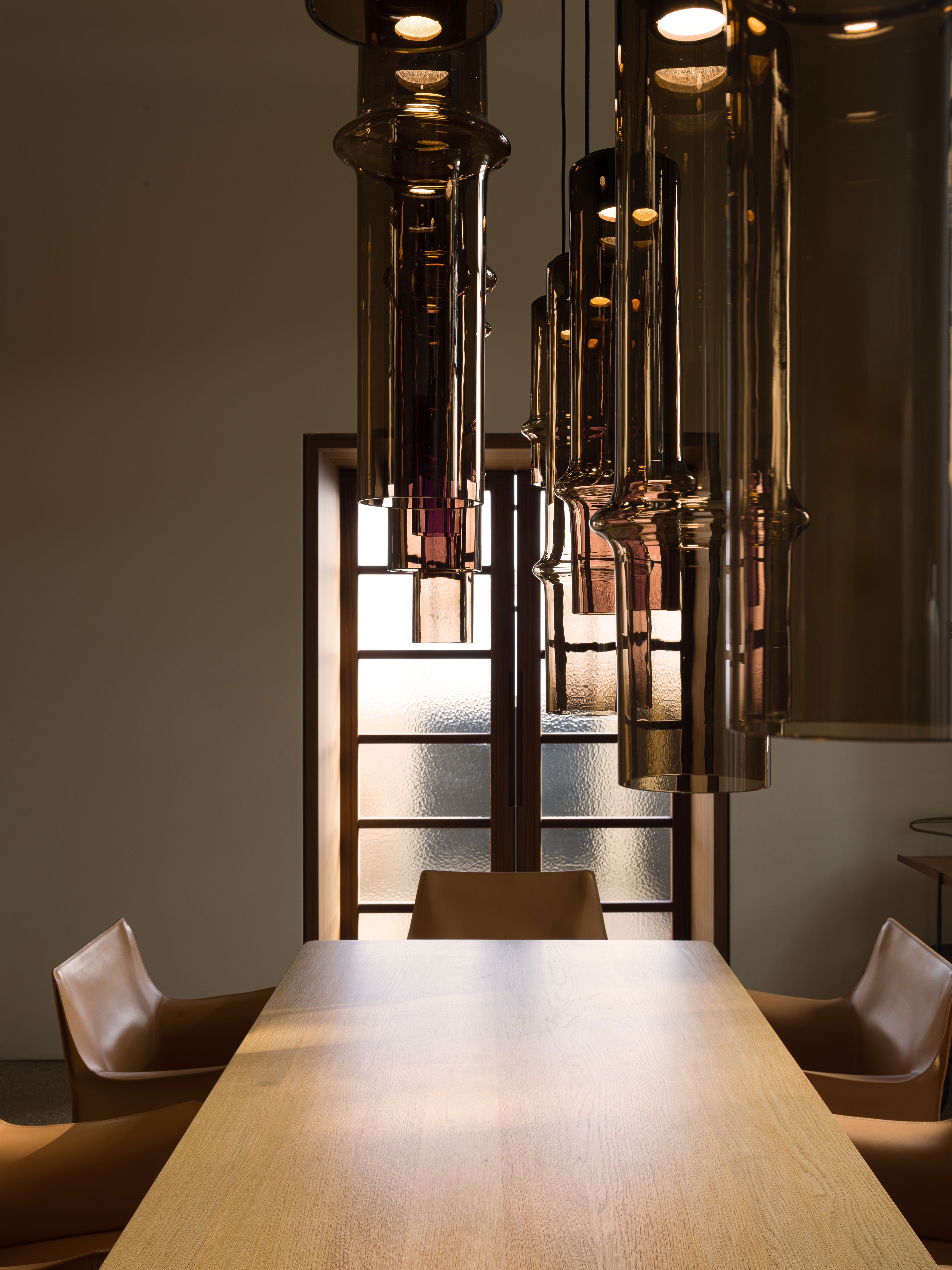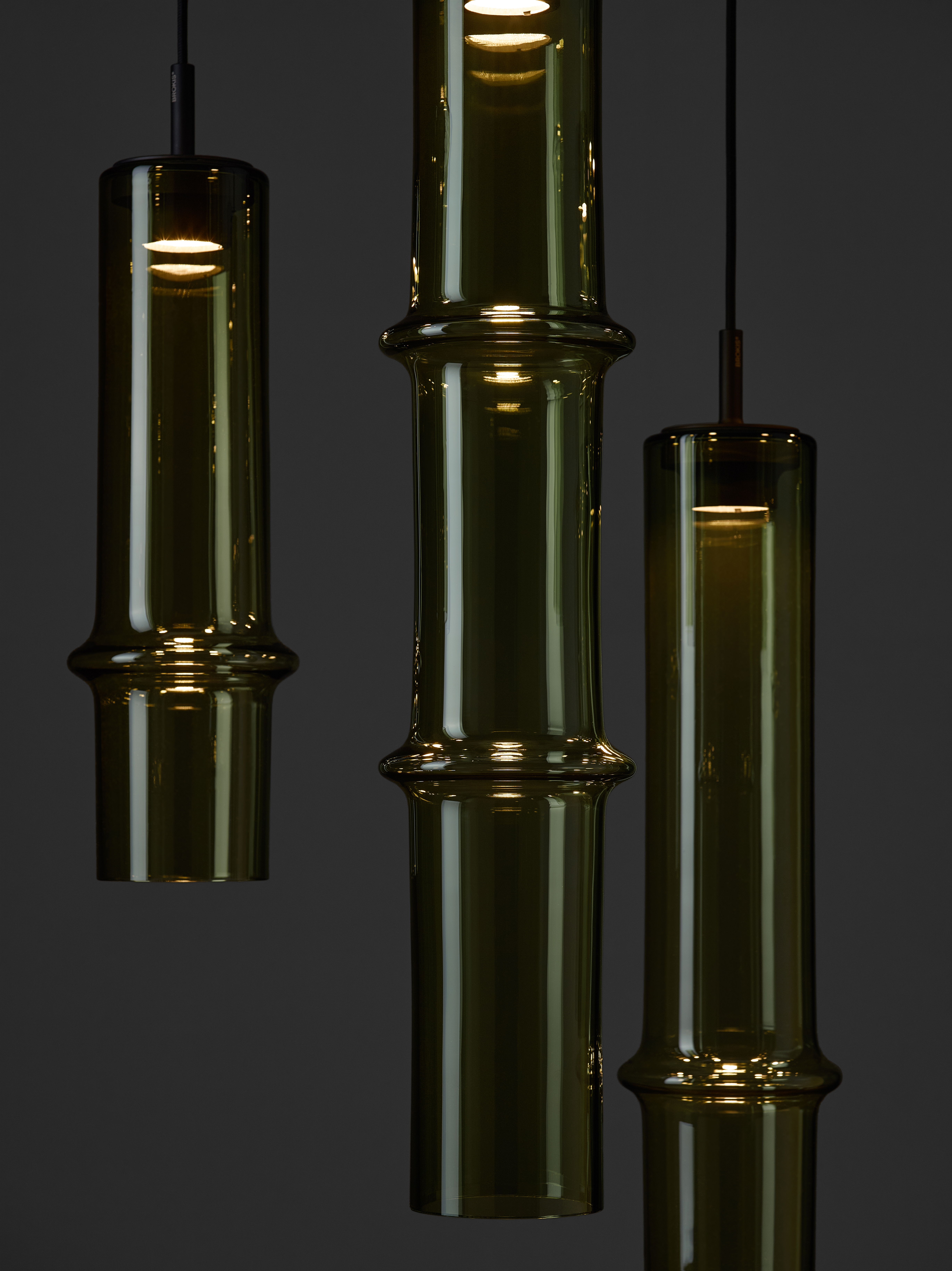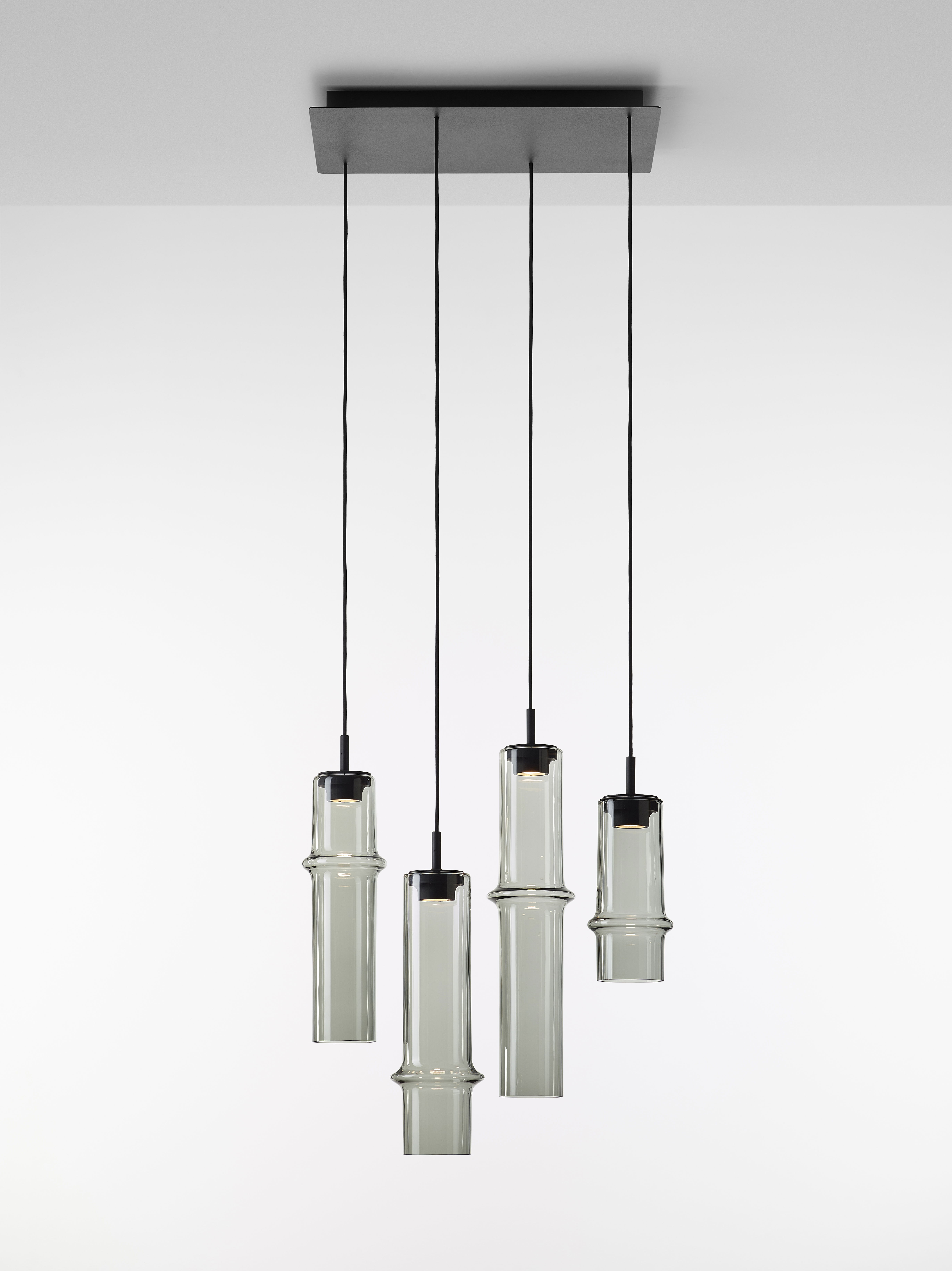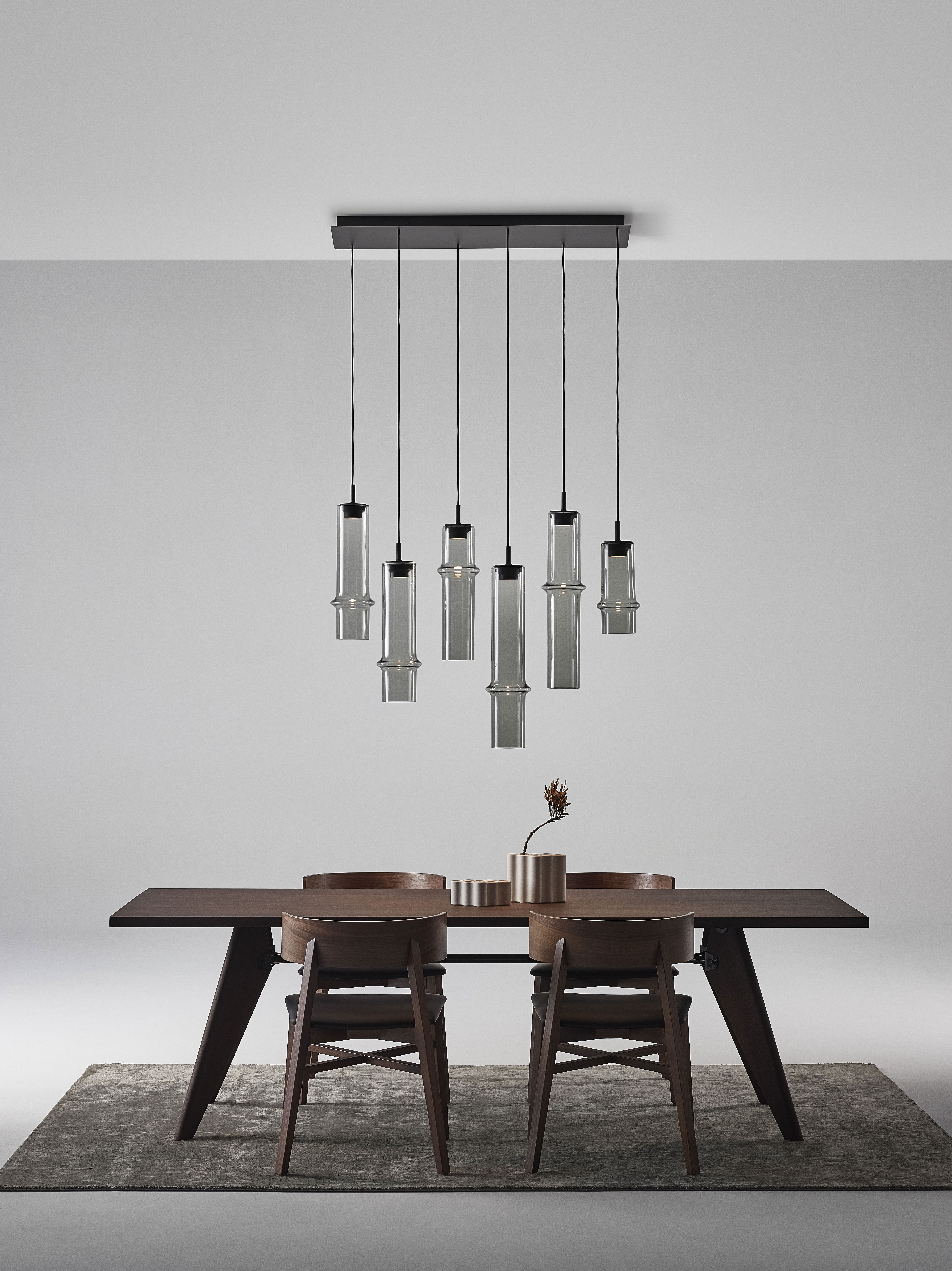 Коллекция Bamboo Forest вдохновлена вертикальными силуэтами бамбуковых зарослей. Светильники, выполненные вручную из стекла, повторяют форму стебля бамбука с характерным узловым кольцом, где материал утолщается, создавая мягкий акцент и нежные тени. Различные размеры и расположение «узлов» на стеблях делают коллекцию узнаваемой с первого взгляда, а групповые композиции наполняют интерьер атмосферой умиротворения, напоминающей прогулку по бамбуковому лесу.