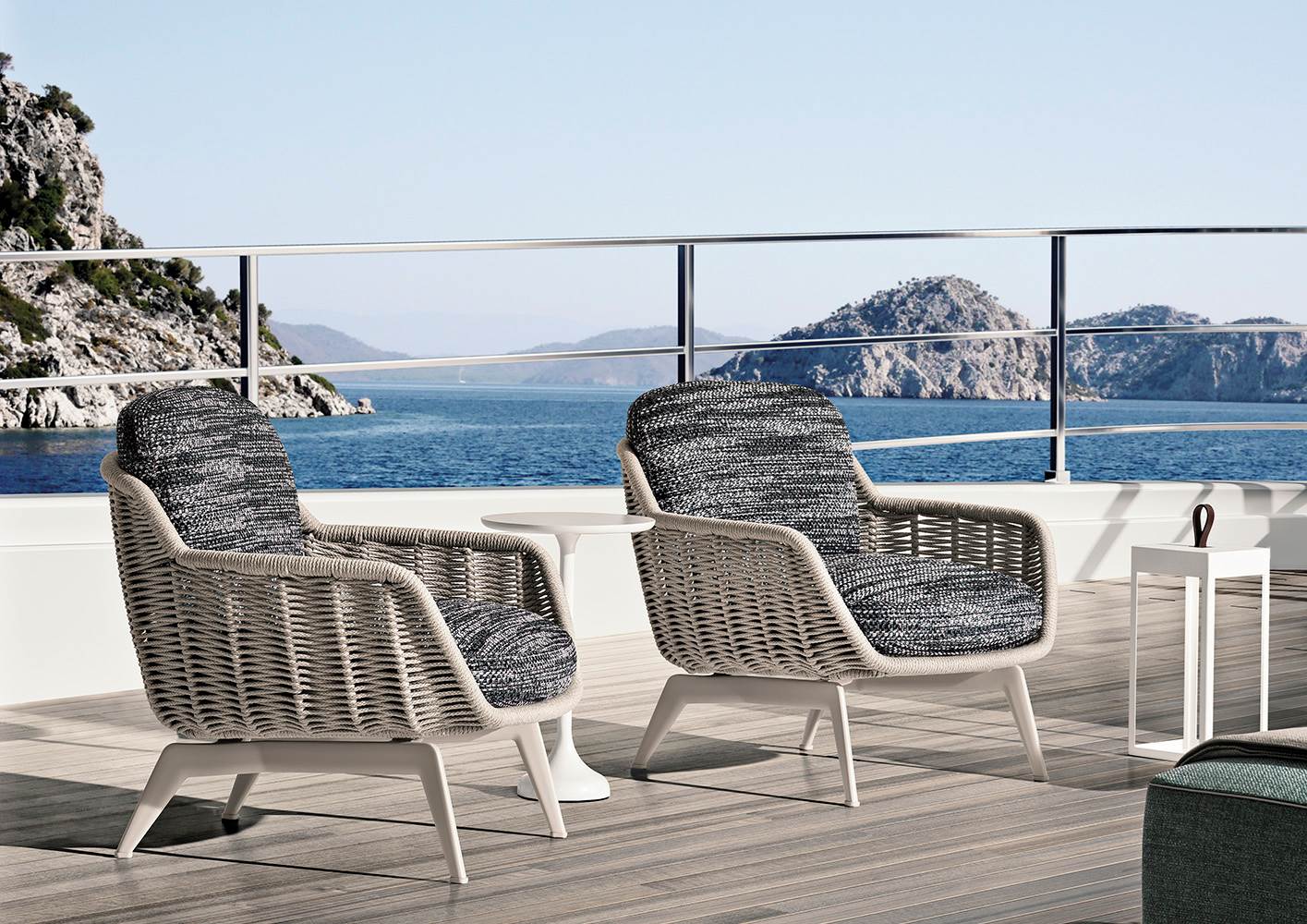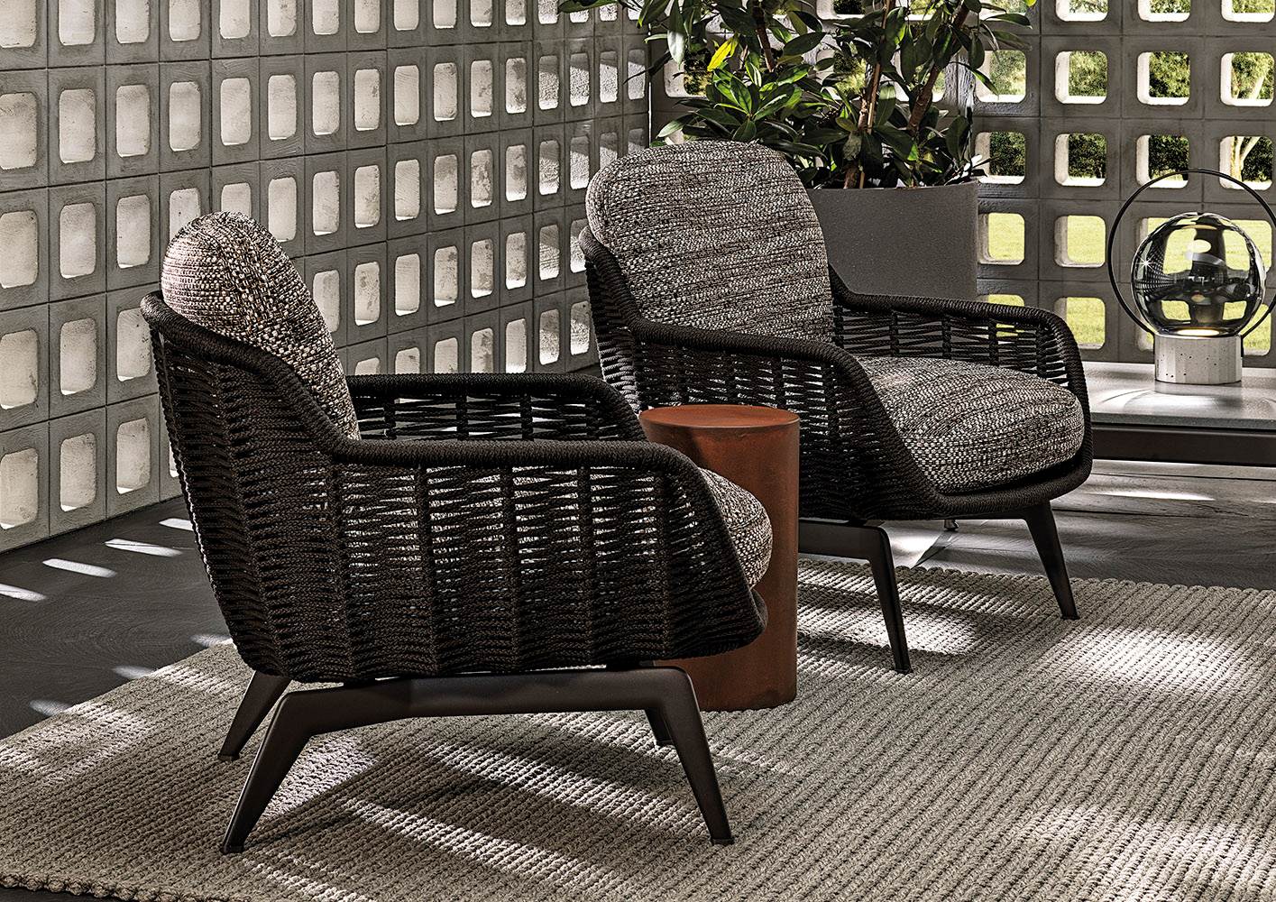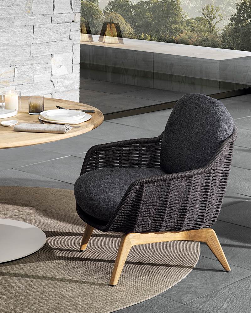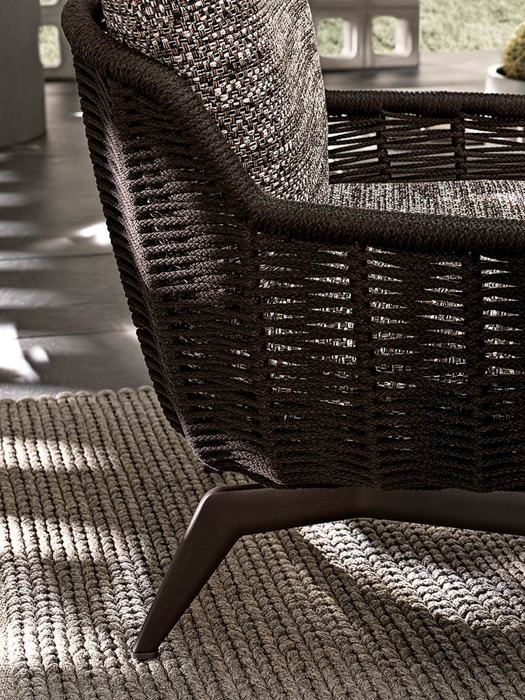 Belt Cord Outdoor отличает динамичная форма с мягко изогнутой спинкой и сиденьем. Каркас изготовлен из алюминия с порошковым покрытием и обтянут плетёным акриловым шнуром, создающим плотную и рельефную структуру. Подушки оснащены дренажной системой и обиты тканью для улицы.