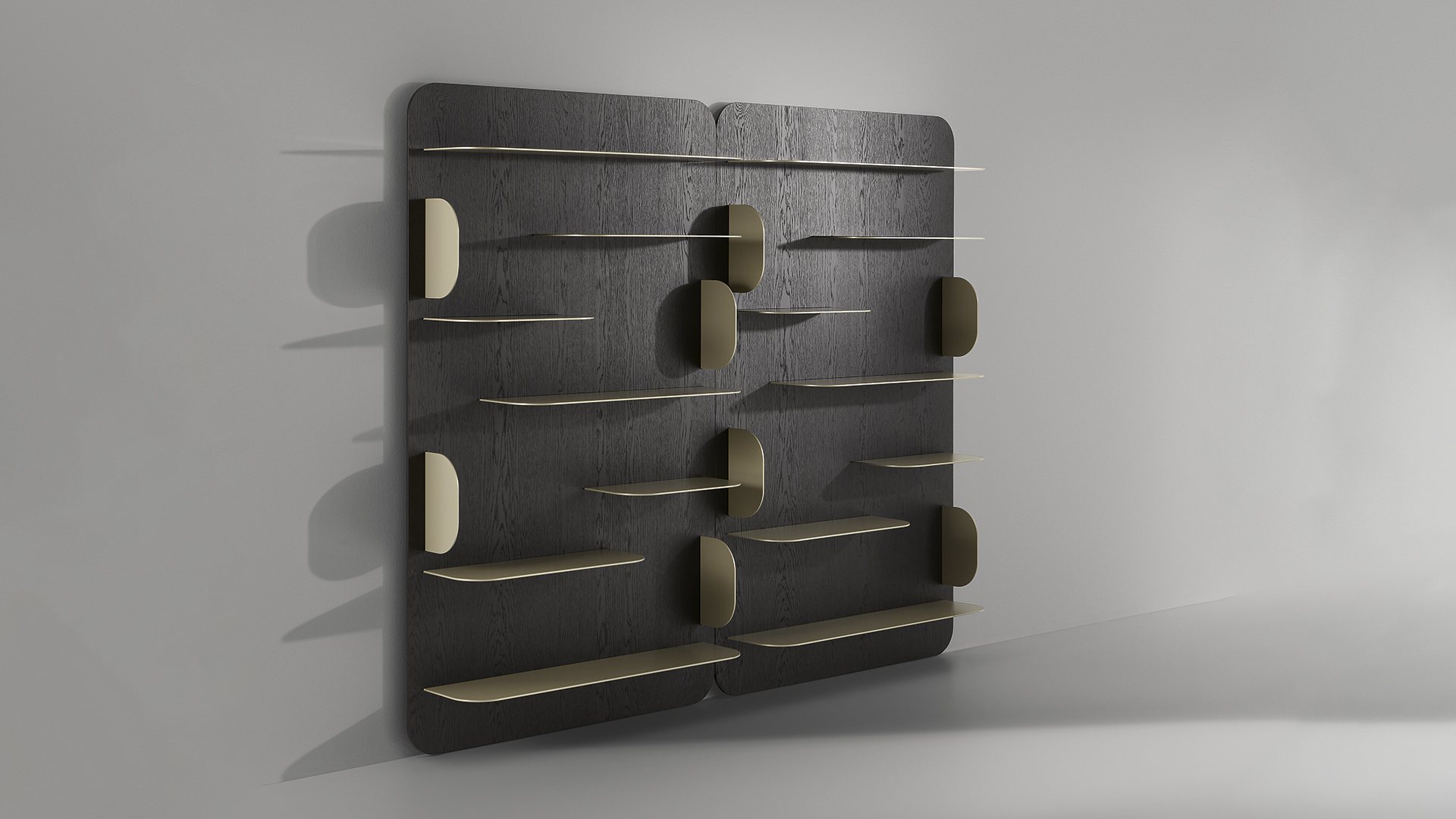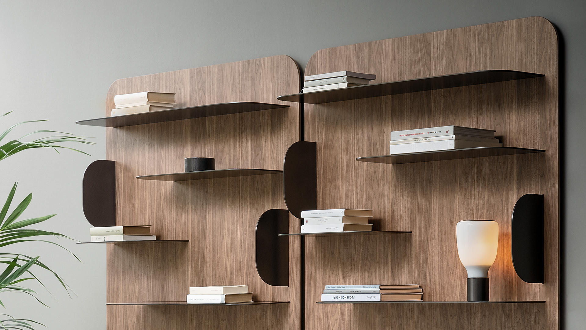 Стеллаж Blabla объединяет два ключевых элемента — деревянный книжный шкаф и зеркальный модуль, которые могут использоваться как отдельно, так и в составе единой, элегантной композиции. Закруглённый боковой профиль придаёт конструкции динамику, создавая непрерывную игру горизонтальных и вертикальных линий, визуально продолжая полки. Основой стеллажа служат широкие панели в отделке noce Canaletto, эффектно контрастирующие с изящными металлическими полками разной длины. Blabla может монтироваться как к стене, так и устанавливаться с опорой на пол, обеспечивая гибкость размещения в интерьере.