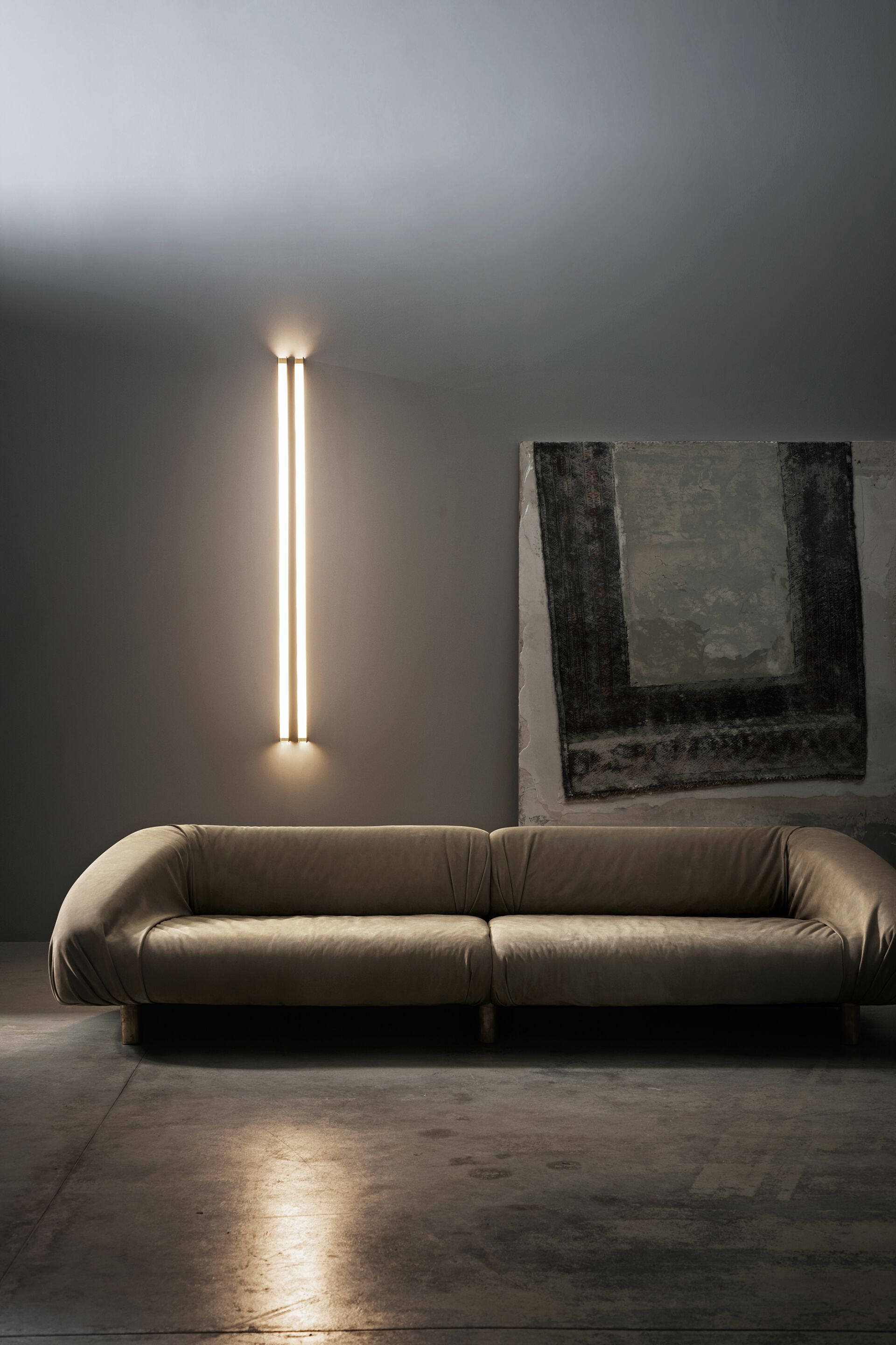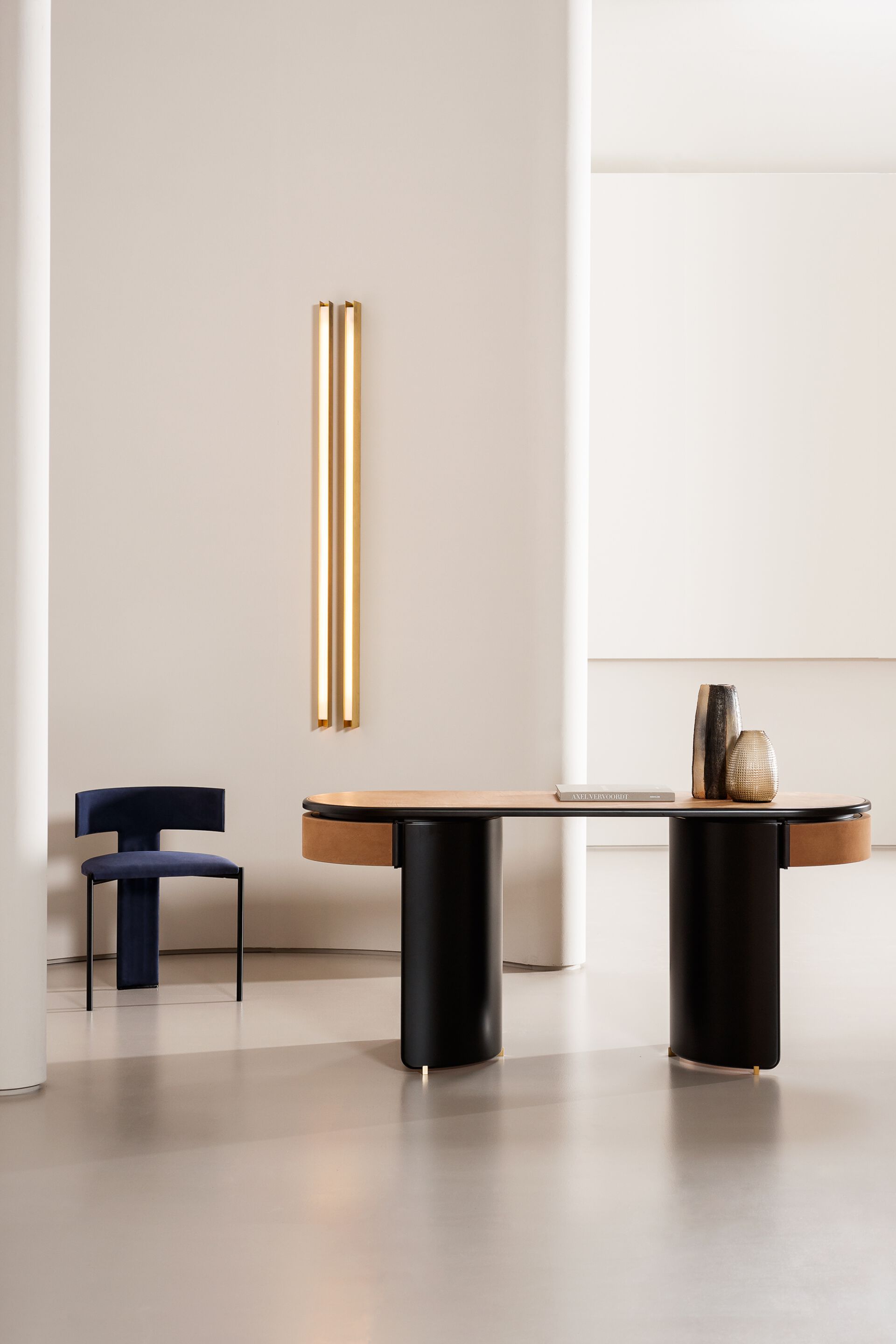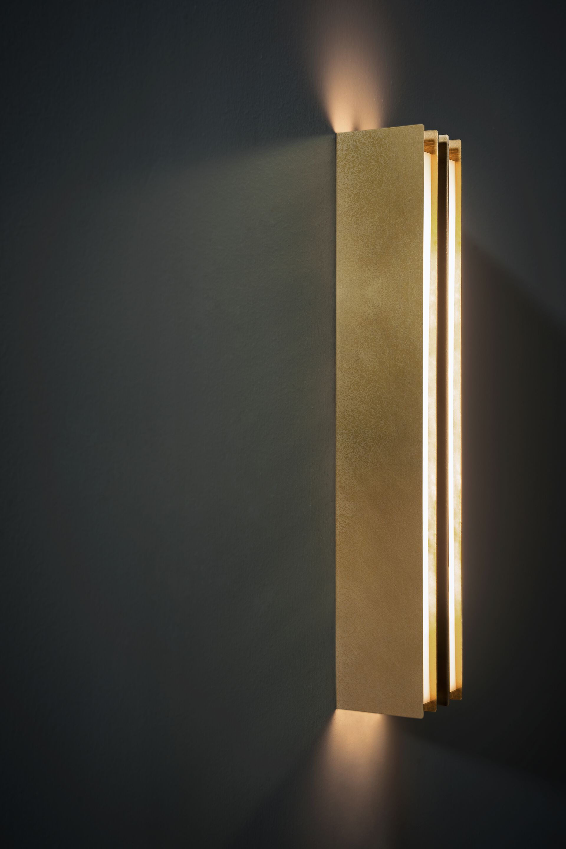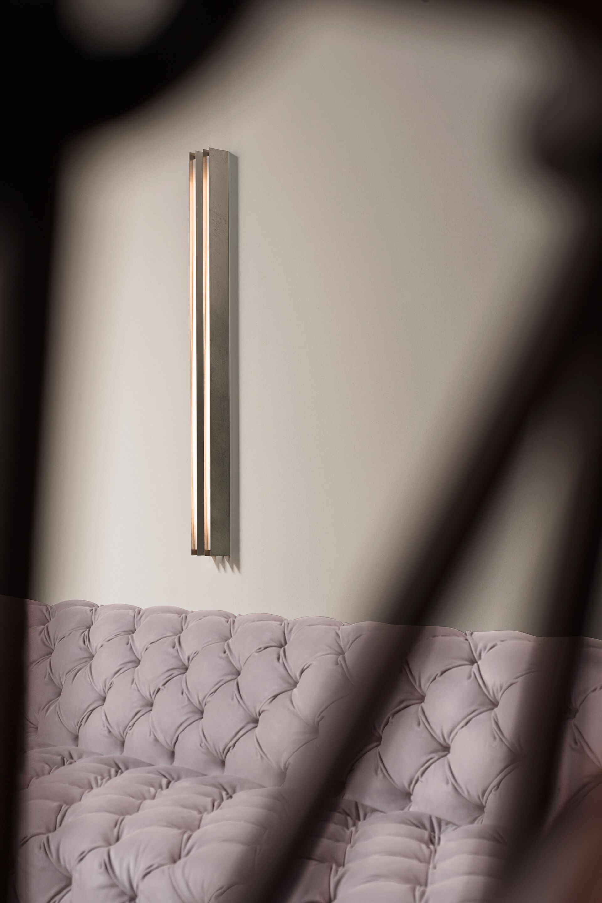 Светодиодная лента 3000K, 9,6 Вт/м, 24В. Класс 1, IP20. Доступны варианты на 210, 320 и 1600 люмен. Каркас из состаренной латуни или альпаки, покрытый матовым лаком. Основание — глянцевый гранит Geode или бетон темно-серого цвета. Окисление ручной работы делает каждый светильник уникальным. Возможность диммирования — по запросу.