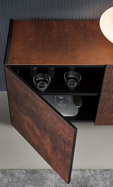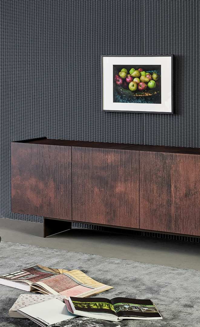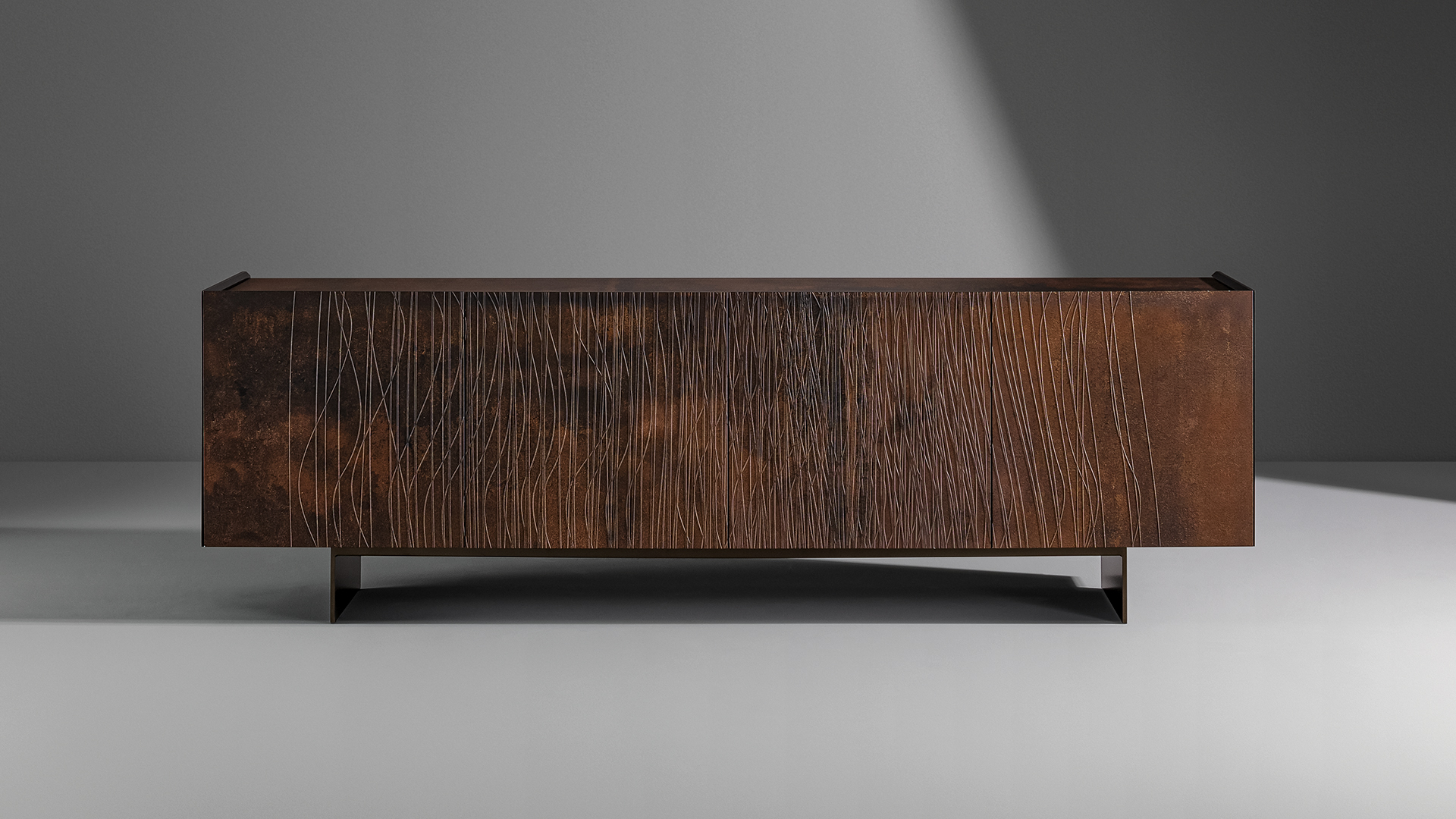 Буфет Blush привлекает внимание своей сдержанной формой и оригинальным основанием с ножками, выполненными из двух тонких панелей, которые придают конструкции лёгкость. Особый акцент сделан на фасаде, украшенном тонкими рельефными линиями, создающими визуальный эффект вибрации и движения. Переплетение прямых и изогнутых абстрактных линий в изменчивом ритме перекликается с натуральной текстурой дерева, подчёркивая её глубину и игру светотени. Название модели — Blush, что в переводе означает «румянец» — отсылает к утончённому декоративному приёму, придающему предмету тонкий «оттенок» и визуальную живость.