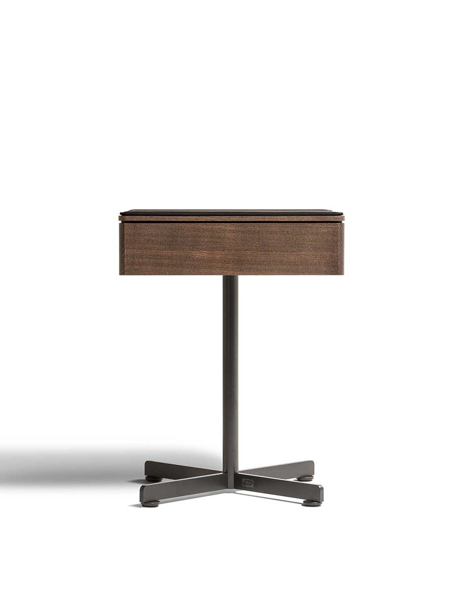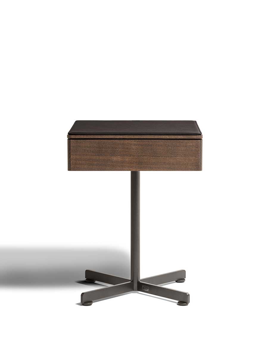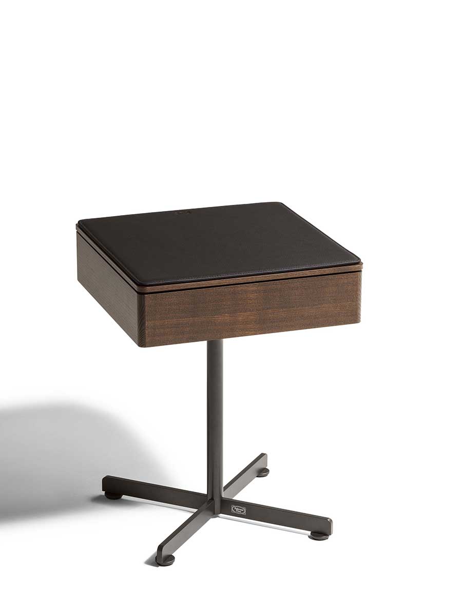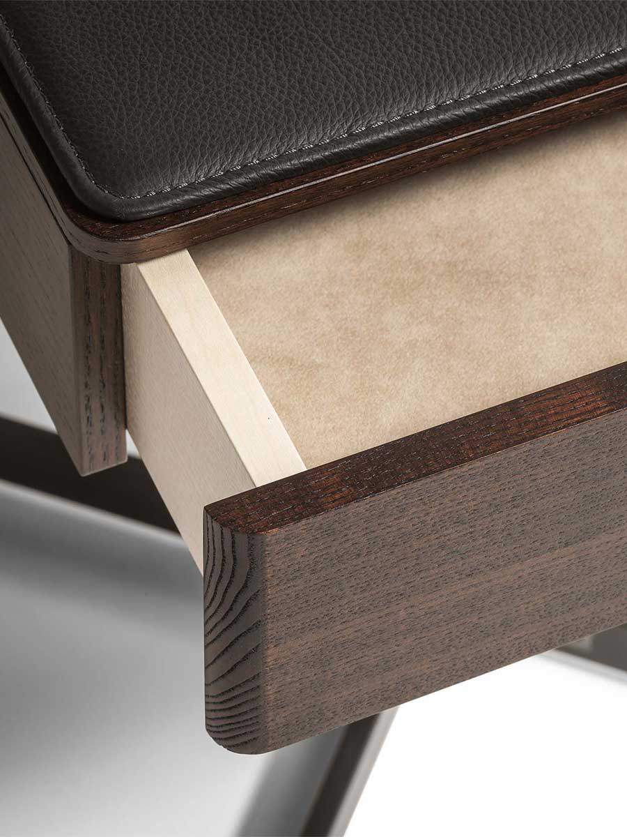 Приставной столик BOB с ящиком имеет столешницу и переднюю панель ящика из массива ясеня. Основание и ножка изготовлены из окрашенной стали и доступны в различных вариантах отделки. В качестве дополнительных аксессуаров можно использовать бежевый противоскользящий коврик из алькантары для защиты и украшения внутренней части ящика, а также мягкий коврик Pelle Frau® с тональной или контрастной строчкой, который можно положить на столешницу для дополнительного комфорта.