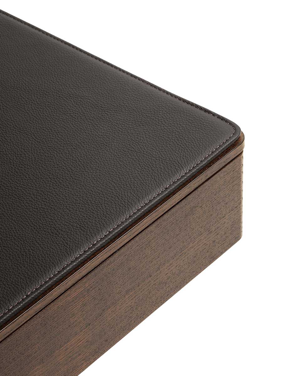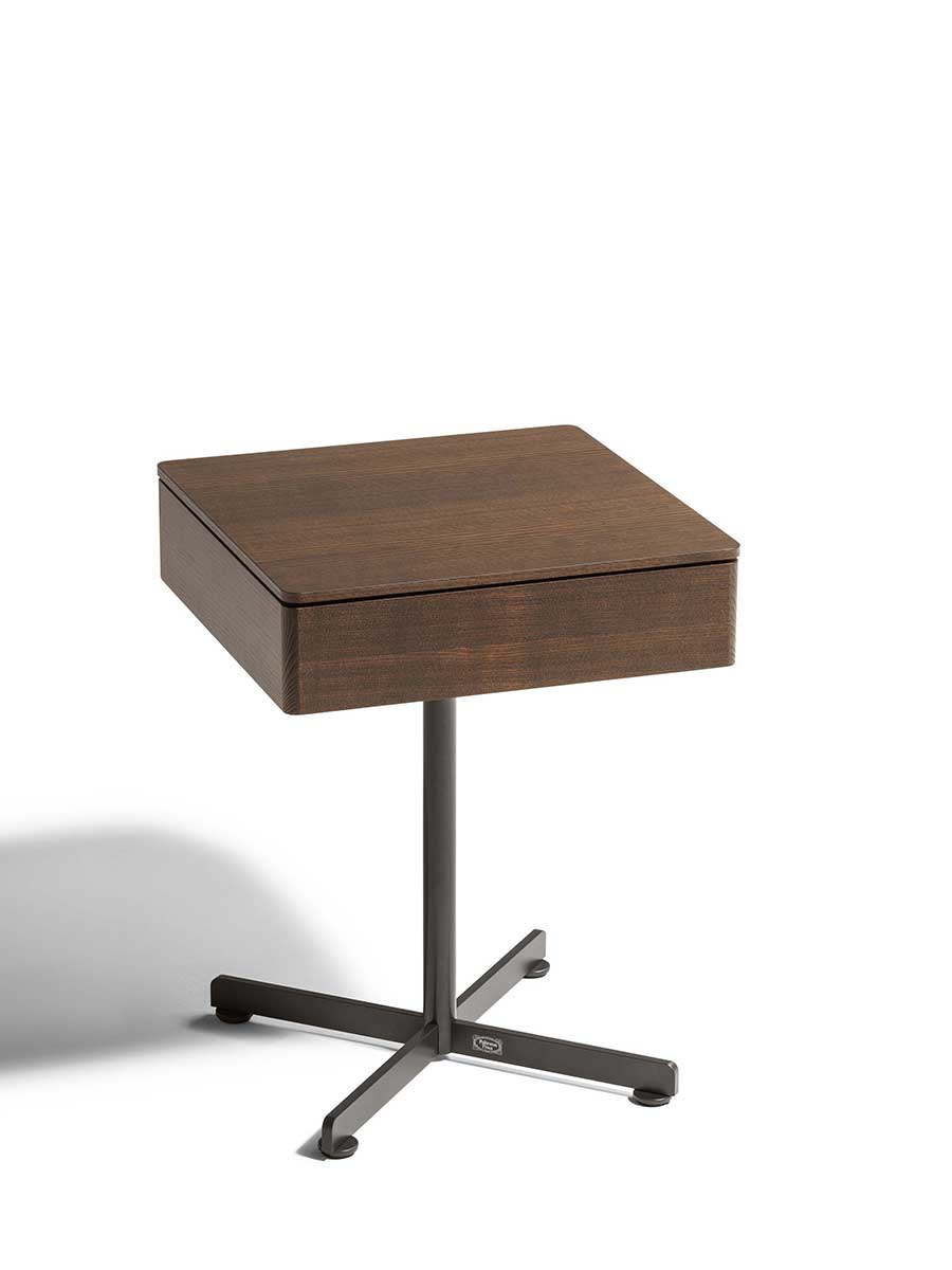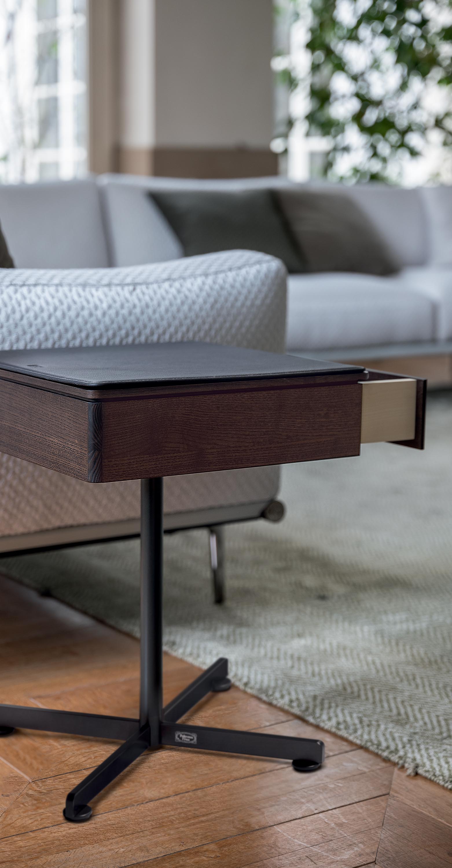 Приставной столик BOB с ящиком имеет столешницу и переднюю панель ящика из массива ясеня. Основание и ножка изготовлены из окрашенной стали и доступны в различных вариантах отделки. В качестве дополнительных аксессуаров можно использовать бежевый противоскользящий коврик из алькантары для защиты и украшения внутренней части ящика, а также мягкий коврик Pelle Frau® с тональной или контрастной строчкой, который можно положить на столешницу для дополнительного комфорта.