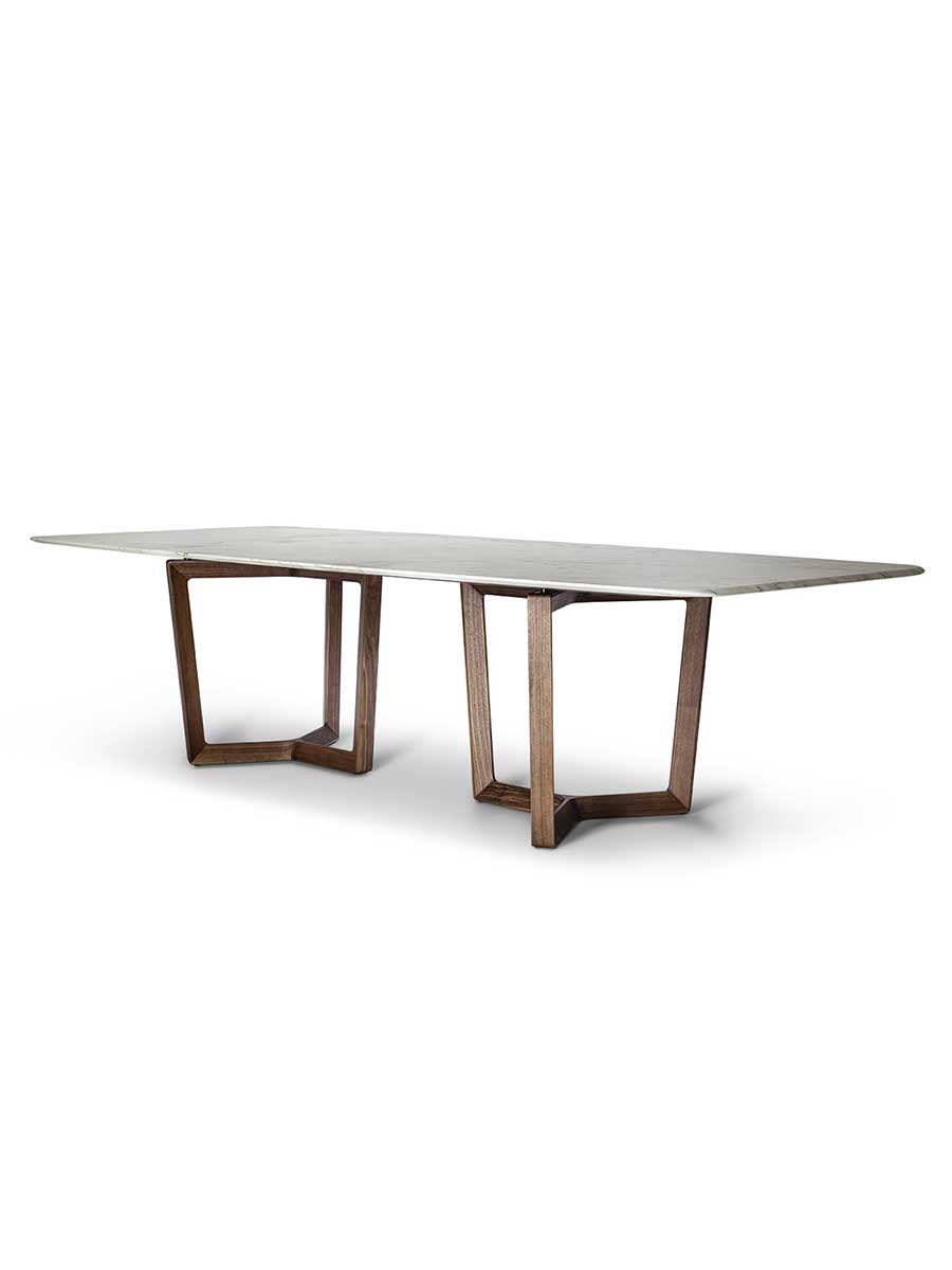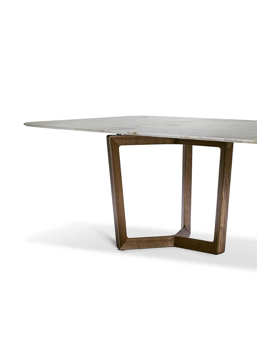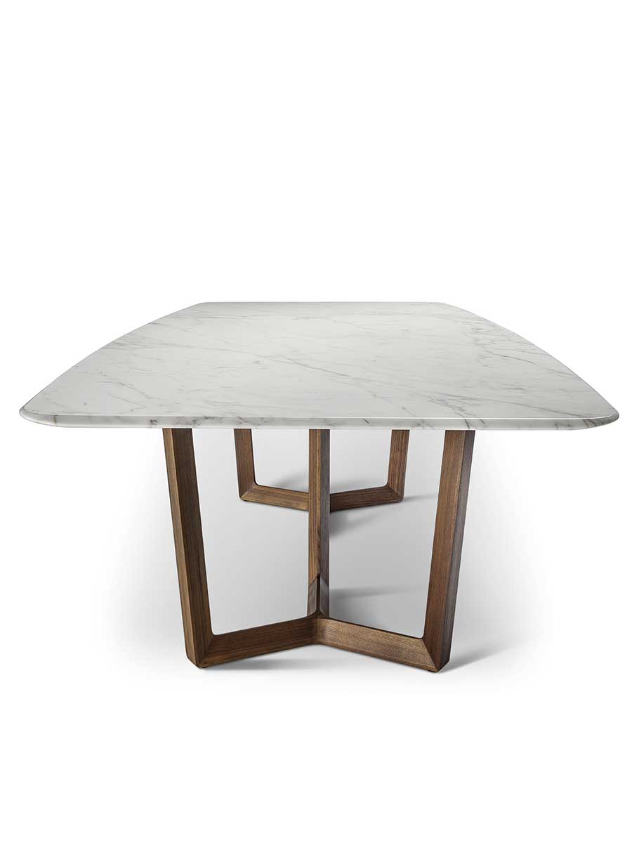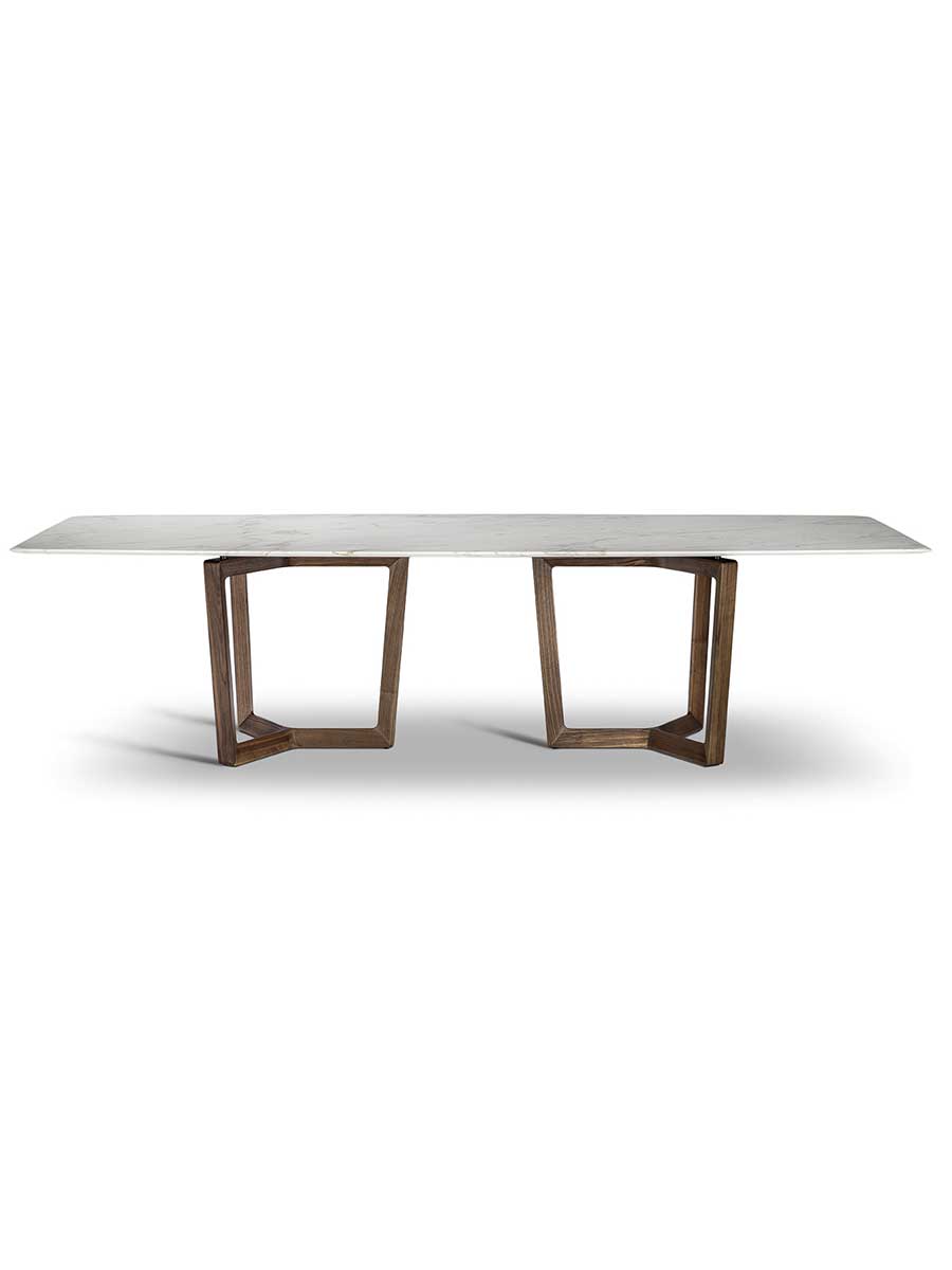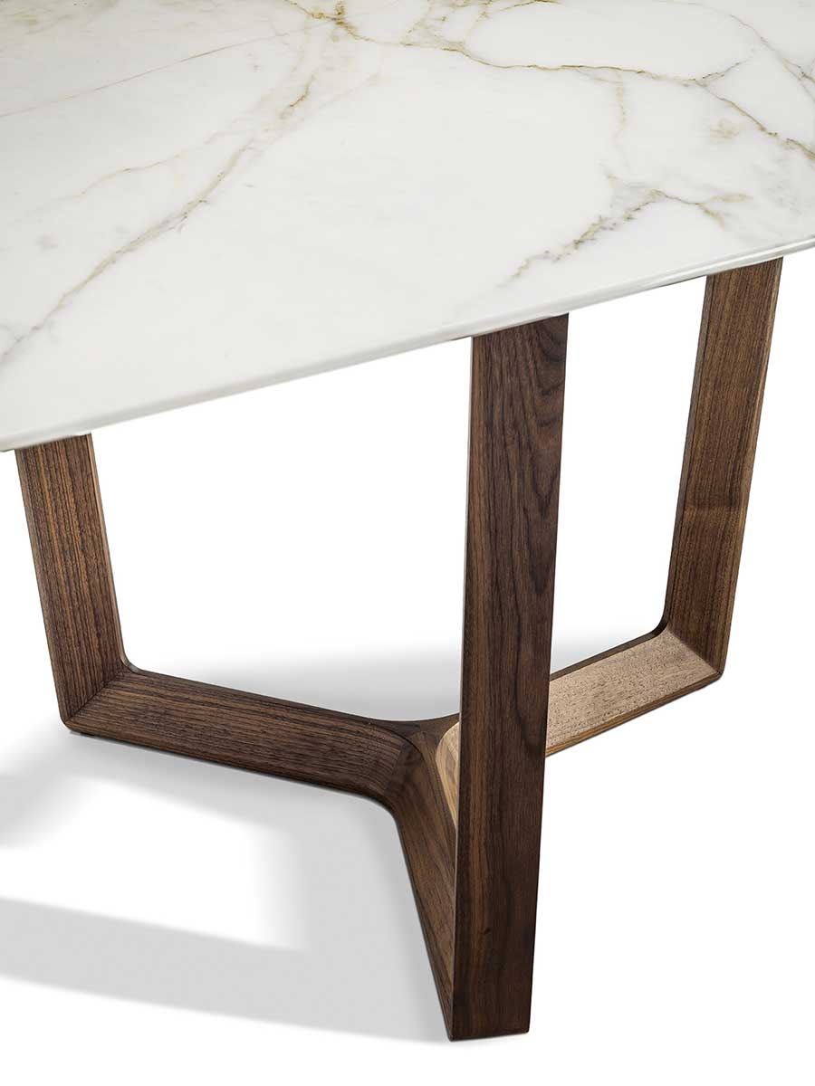 Стол Bolero Ravel имеет самонесущее основание на козлах с тремя стойками треугольного сечения. Ножки могут быть изготовлены из дерева с различными вариантами отделки. Крепёжные пластины и распорки изготовлены из стали, окрашенной в чёрный цвет. Мраморная столешница, доступная в различных вариантах глянцевой и полуглянцевой отделки, изготовлена из цельной бочкообразной плиты со скошенными краями. Глянцевая поверхность обработана полиэфирным лаком, который обеспечивает повышенную прочность и предотвращает впитывание жидкости; полуглянцевая поверхность обработана водоотталкивающим маслом для более естественного вида. Нижняя сторона мраморной столешницы усилена технической сеткой для обеспечения долговечности.