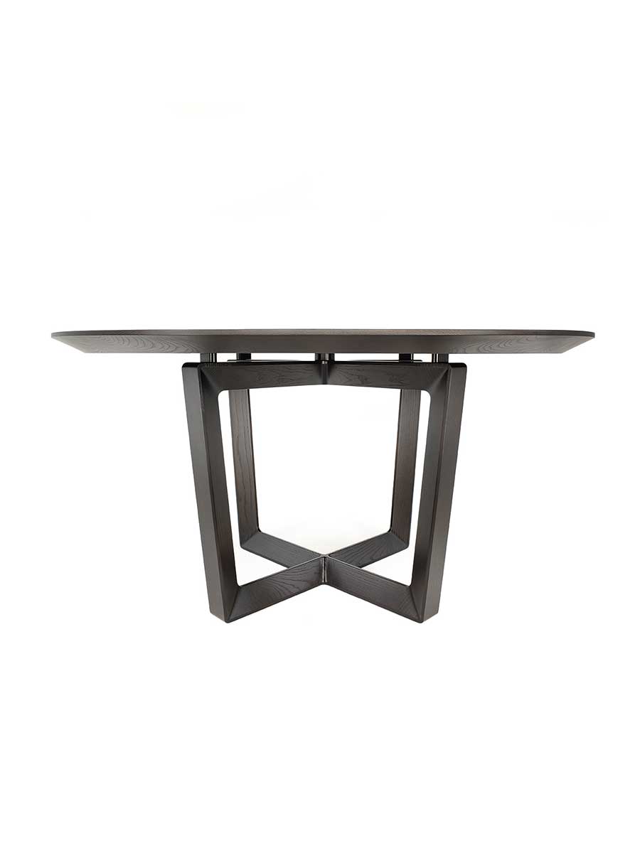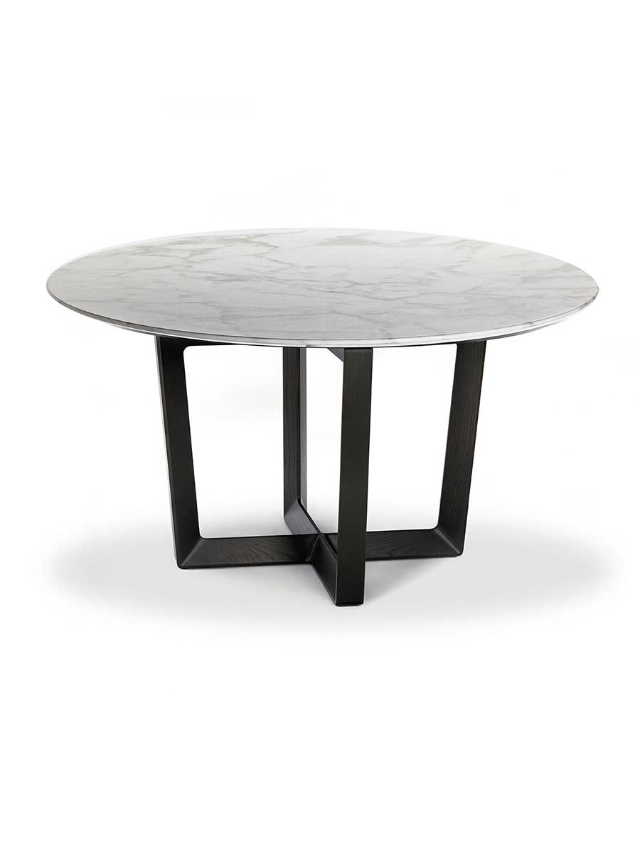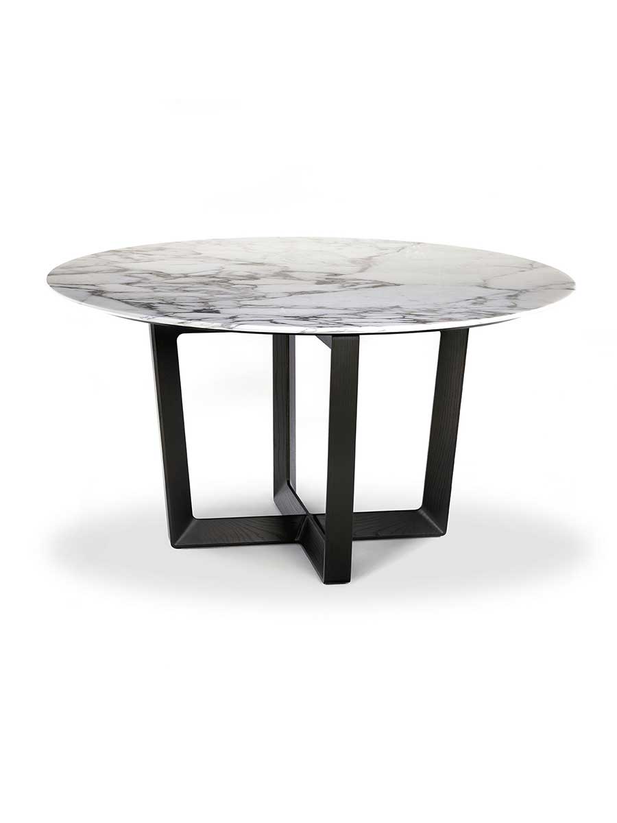 Несущая конструкция круглого стола Bolero выполнена из массива дерева с различными вариантами отделки и имеет треугольное сечение. Столешница может быть выполнена из дерева, ясеня, окрашенного в цвет венге, или ореха каналетто с окантовкой из массива дерева в той же отделке, которая придает изюминку. Столешница диаметром 150 см также доступна из мрамора со скошенным краем, в глянцевой и полуглянцевой отделке.