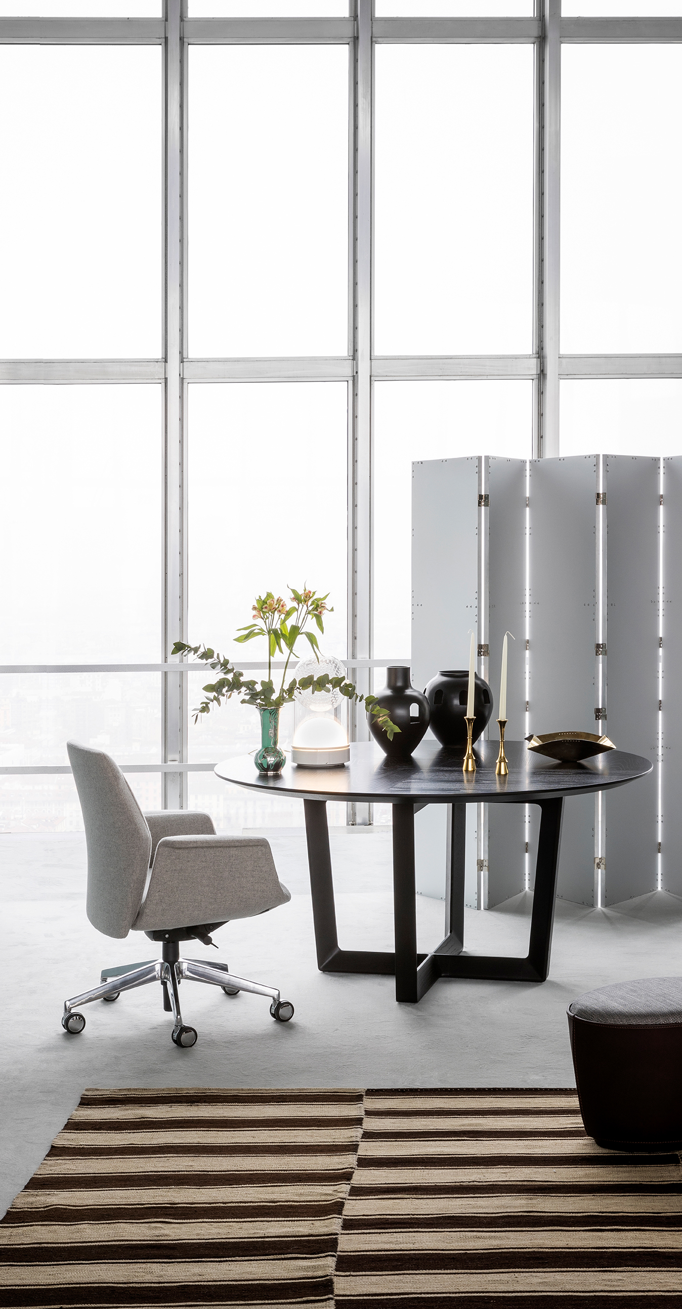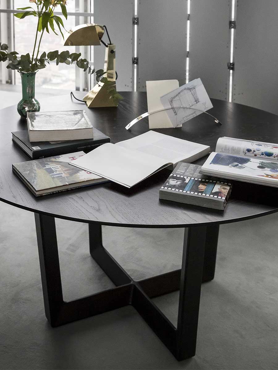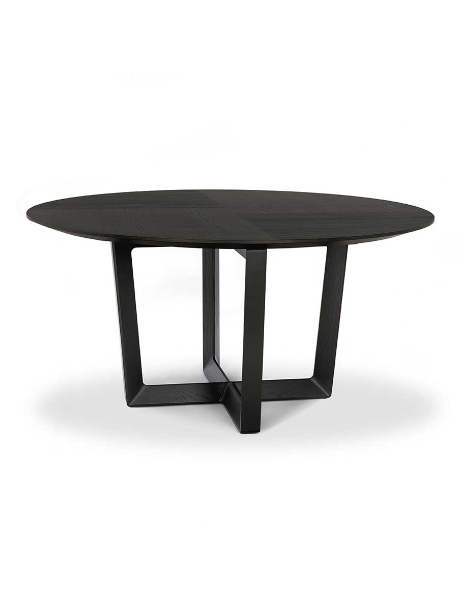 Несущая конструкция круглого стола Bolero выполнена из массива дерева с различными вариантами отделки и имеет треугольное сечение. Столешница может быть выполнена из дерева, ясеня, окрашенного в цвет венге, или ореха каналетто с окантовкой из массива дерева в той же отделке, которая придает изюминку. Столешница диаметром 150 см также доступна из мрамора со скошенным краем, в глянцевой и полуглянцевой отделке.