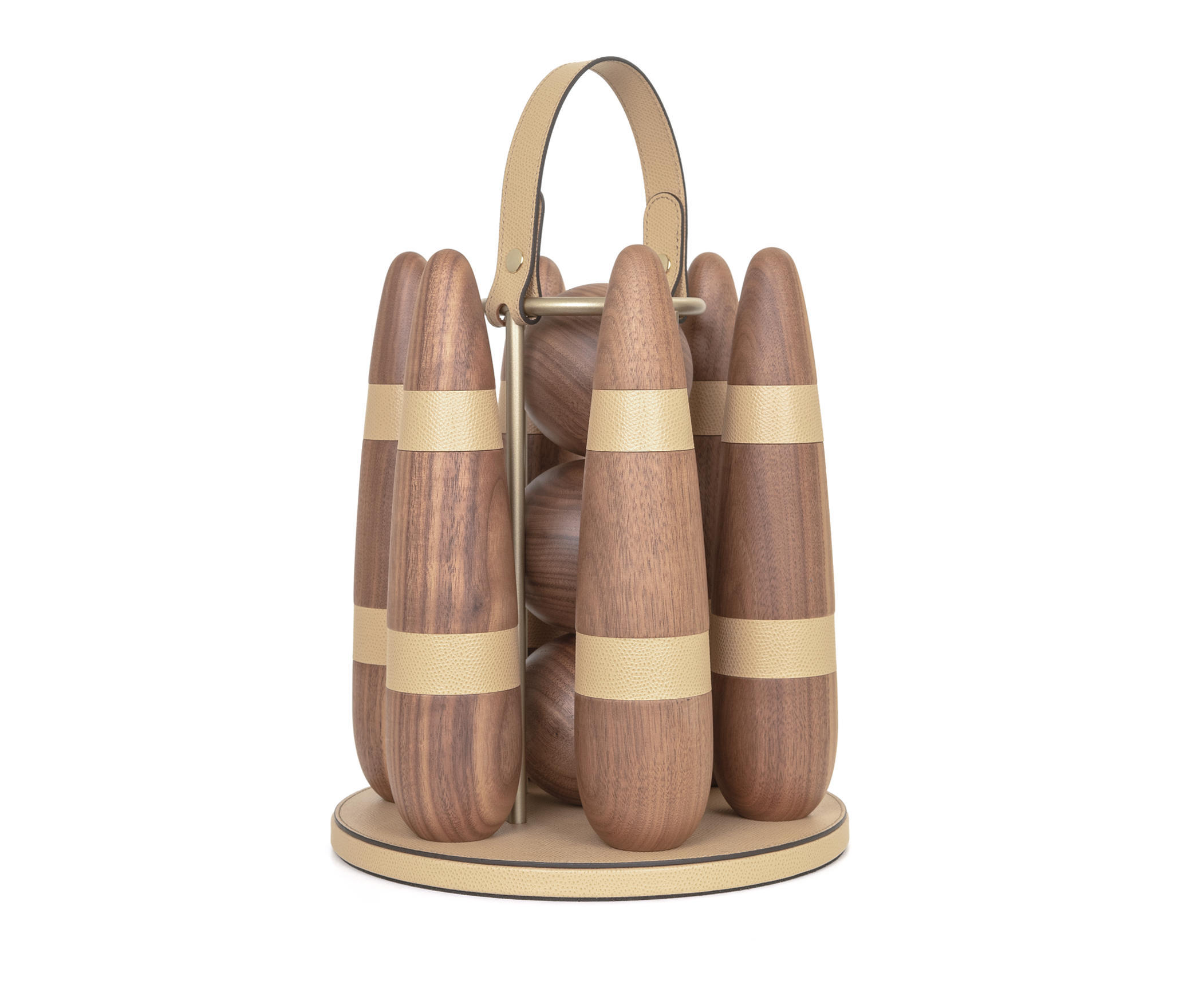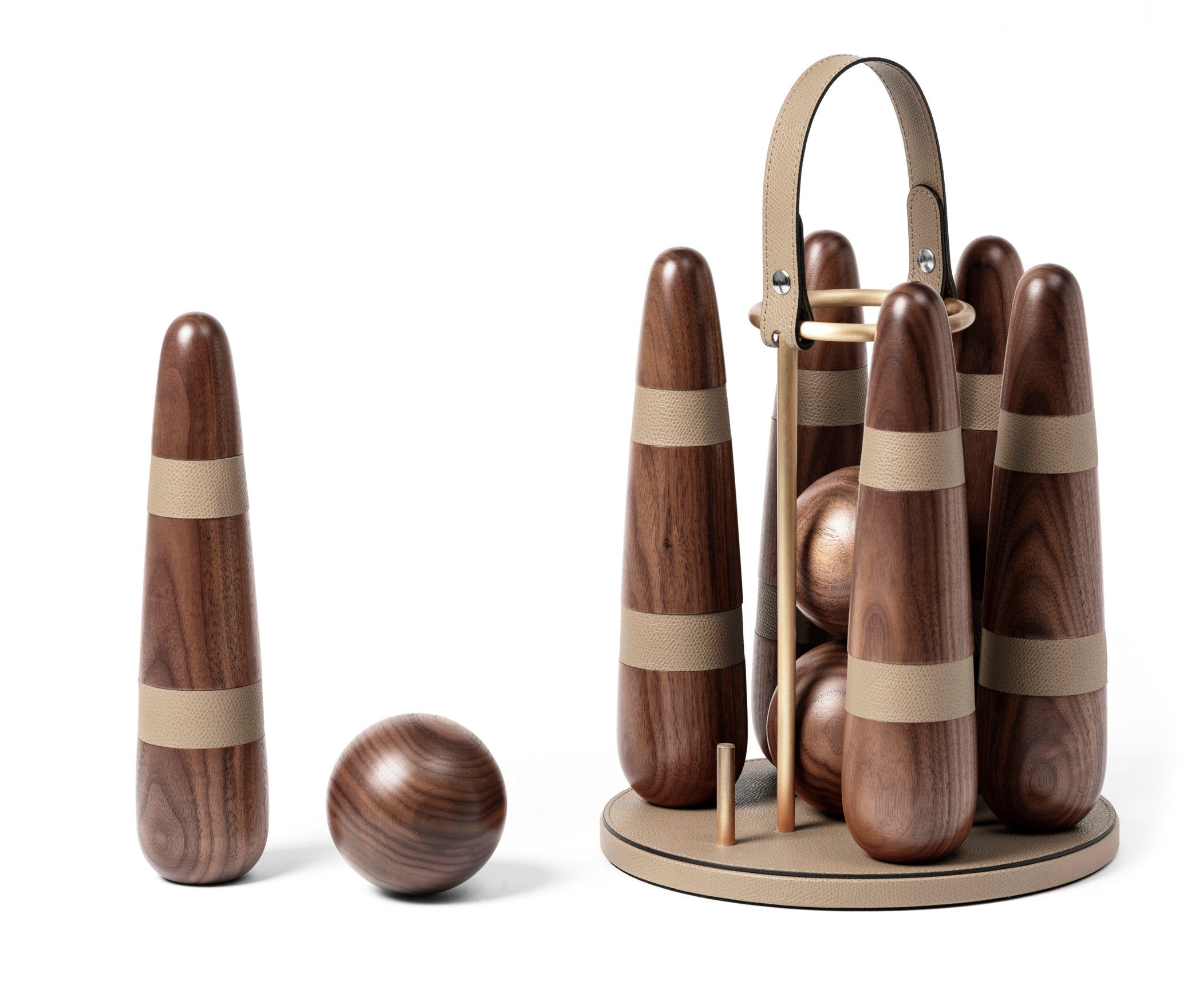Изысканный переносной боулинг-набор, вручную изготовленный из ценной древесины ореха каналетто и дополненный кожаными деталями и отделкой из сатинированной латуни. Элегантный подарок для любого возраста и стильный акцент для дома или офиса. В комплект входят три шара и шесть кеглей в современном исполнении. Влюбиться в него — проще простого.