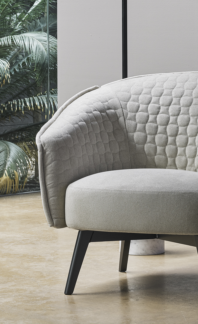 Кресло Bruno от итальянского бренда Bonaldo, созданное дизайнером Мауро Липпарини, представляет собой гармоничное сочетание традиционной эстетики и современного комфорта. Его изогнутые формы и щедрая набивка придают образу мягкость и уют, а чёткие линии и лаконичный силуэт подчёркивают сдержанную элегантность. Изогнутая спинка и подлокотники образуют единую линию, создавая выразительный визуальный эффект. Детали, такие как кожаные вставки, подчёркивают внимание к материалам и отделке.