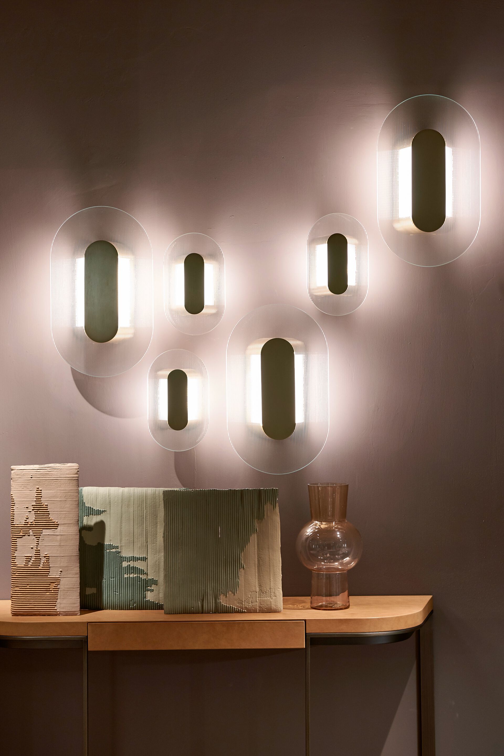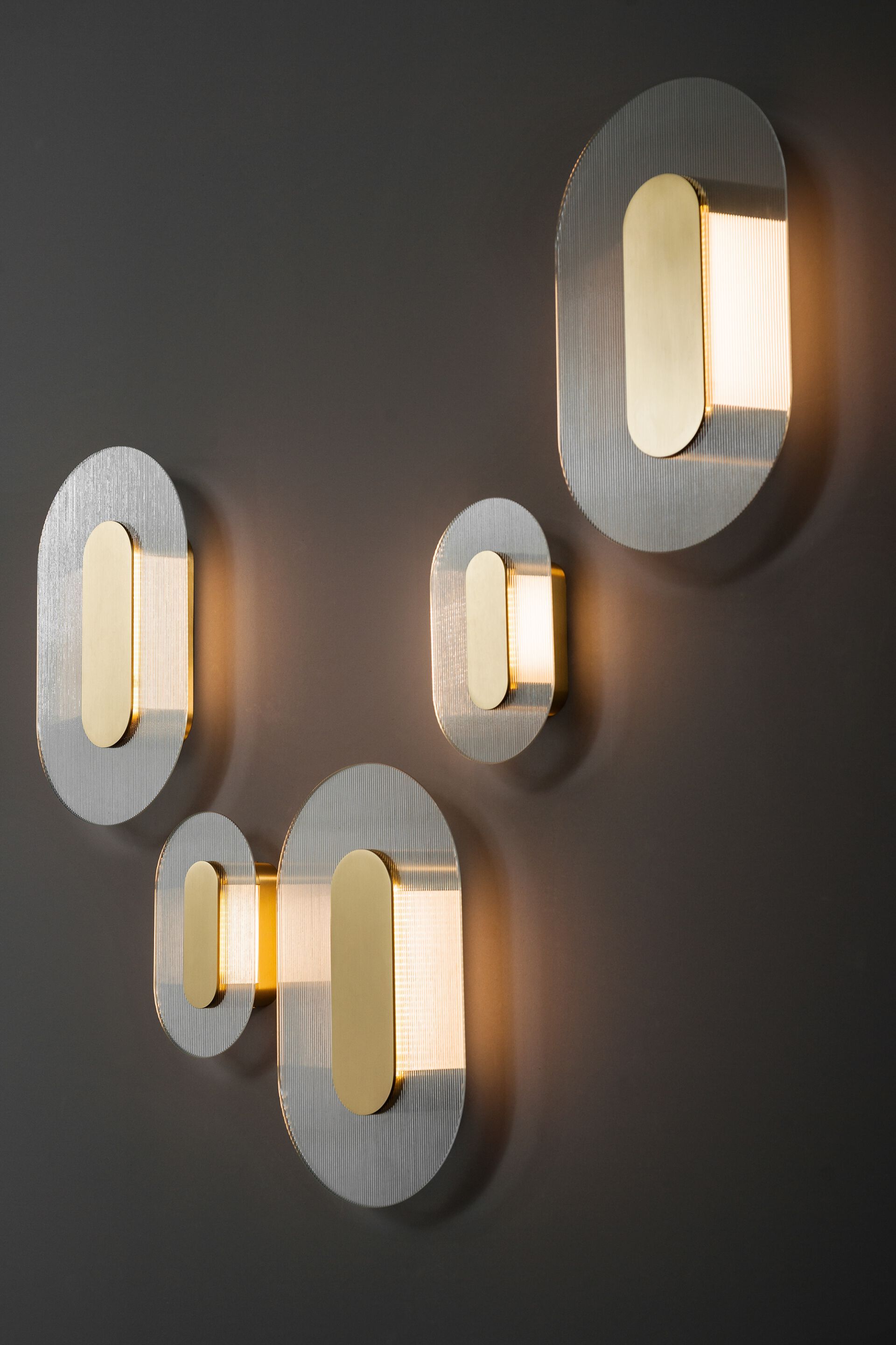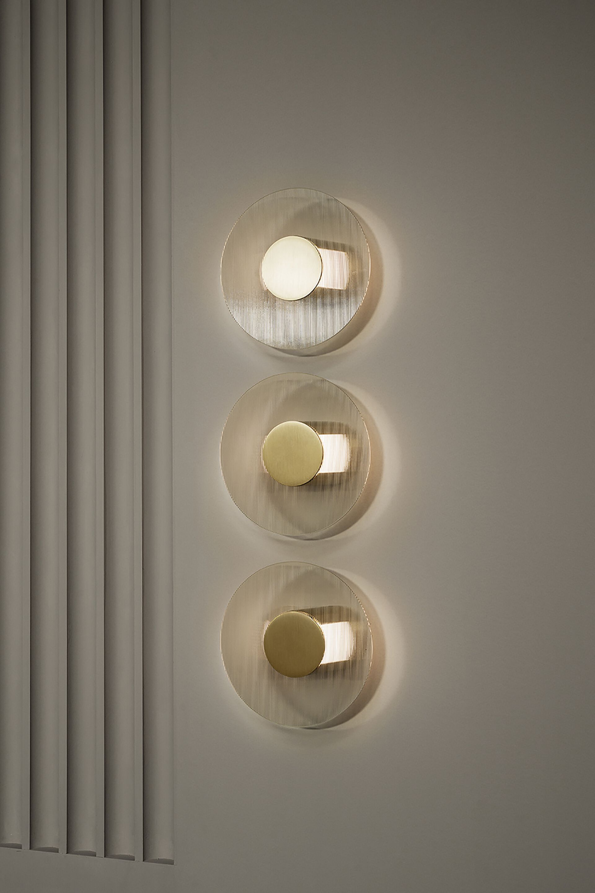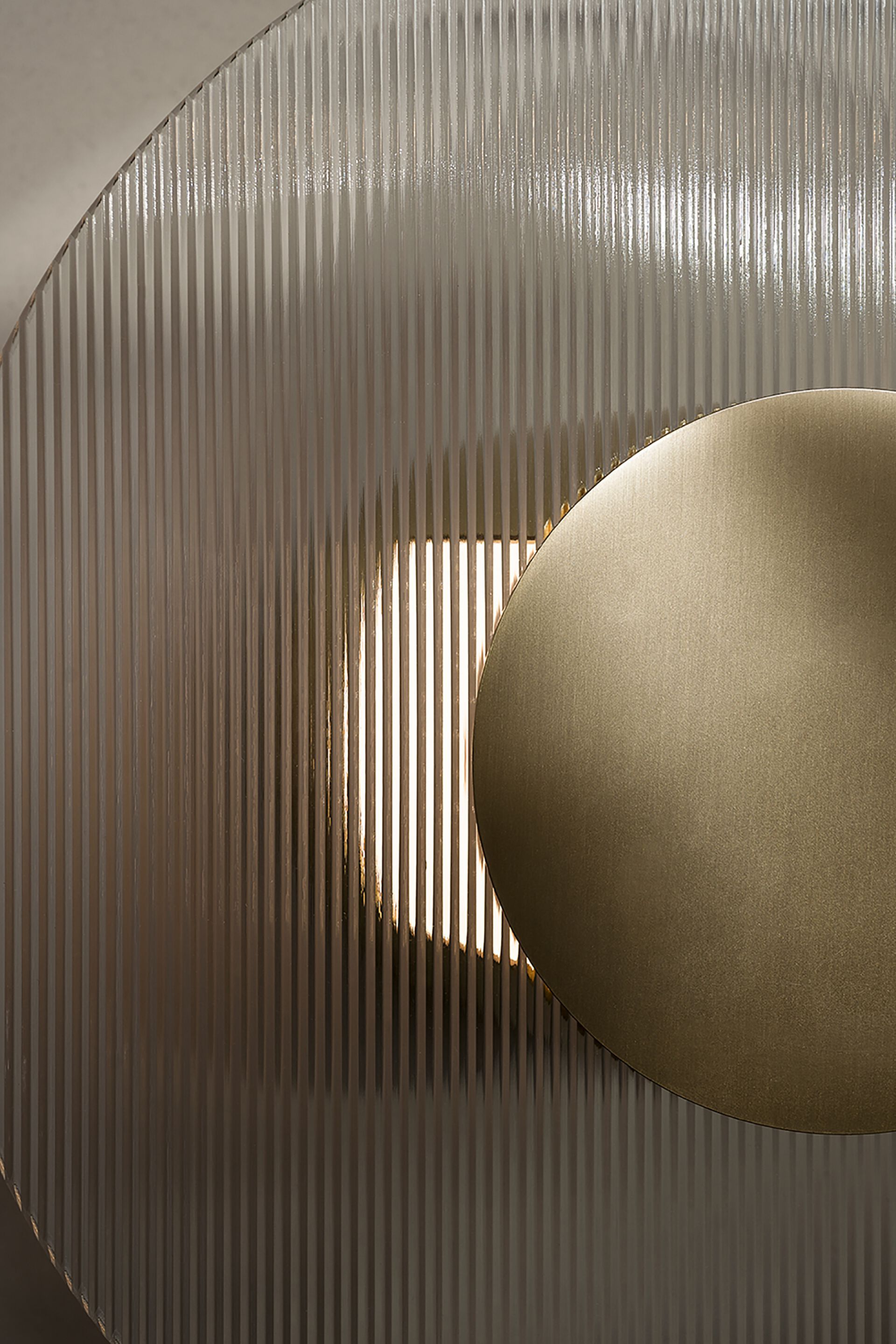 Сатинированная латунная конструкция с прозрачной матовой эмалевой отделкой. Внутренняя трубка из алюминиевого сплава с метакрилатным опалом. Пластина для настенного монтажа в лакированной металлической и нейлоновой оболочке. Толщина полосатого стекла 4 мм.
