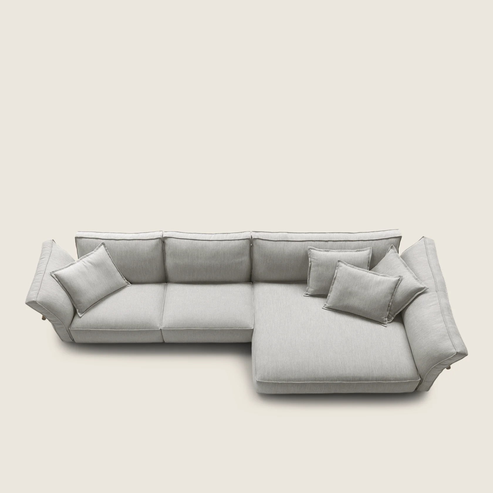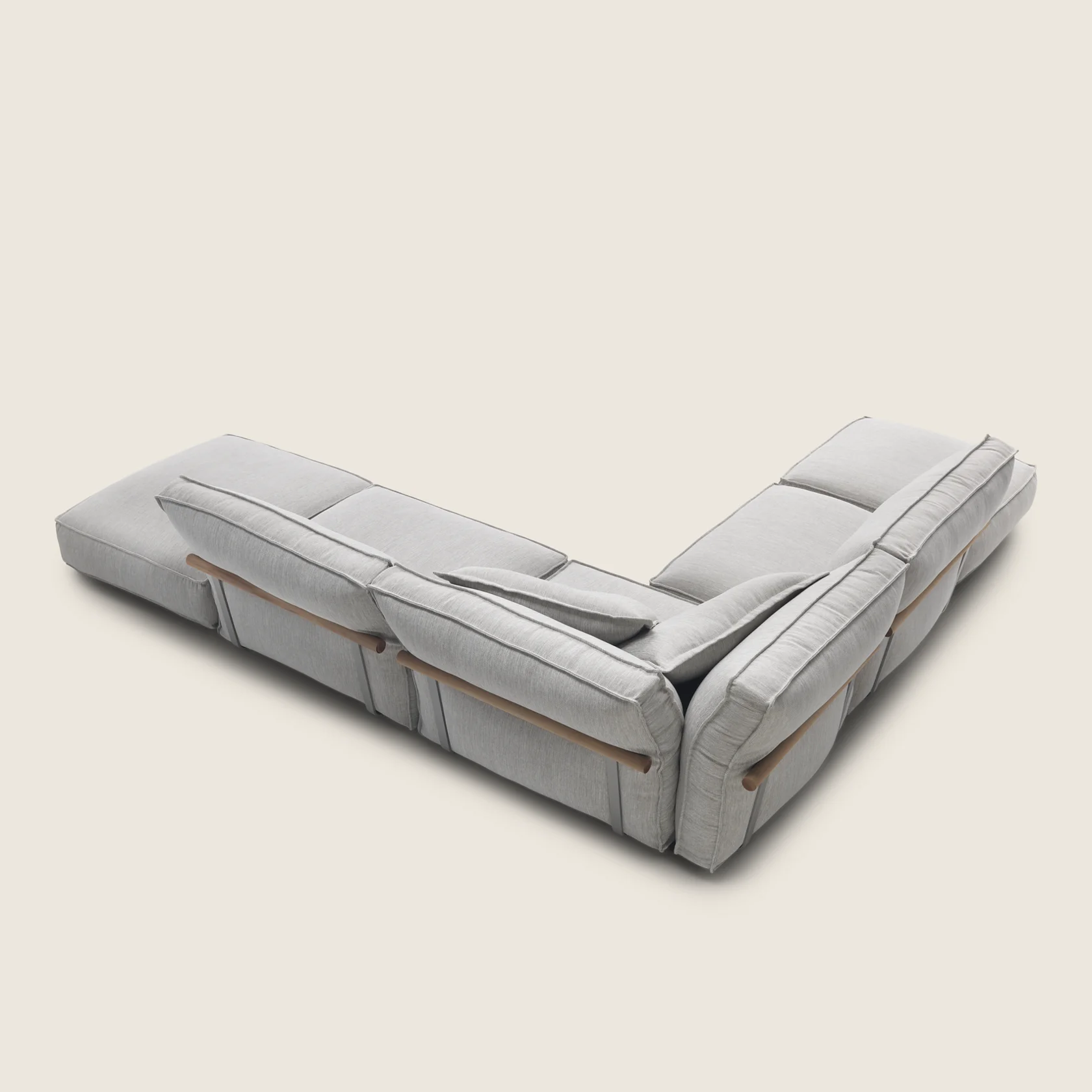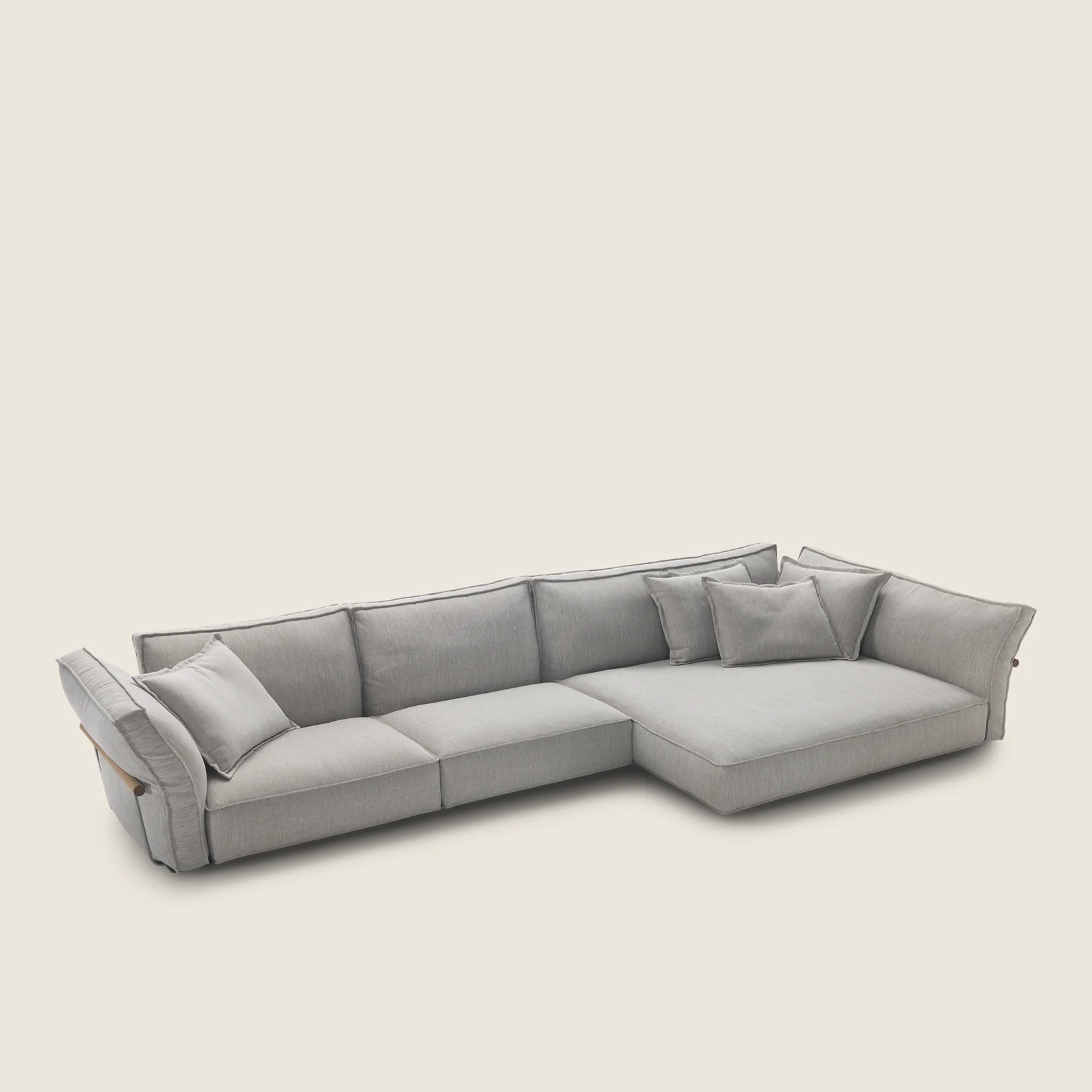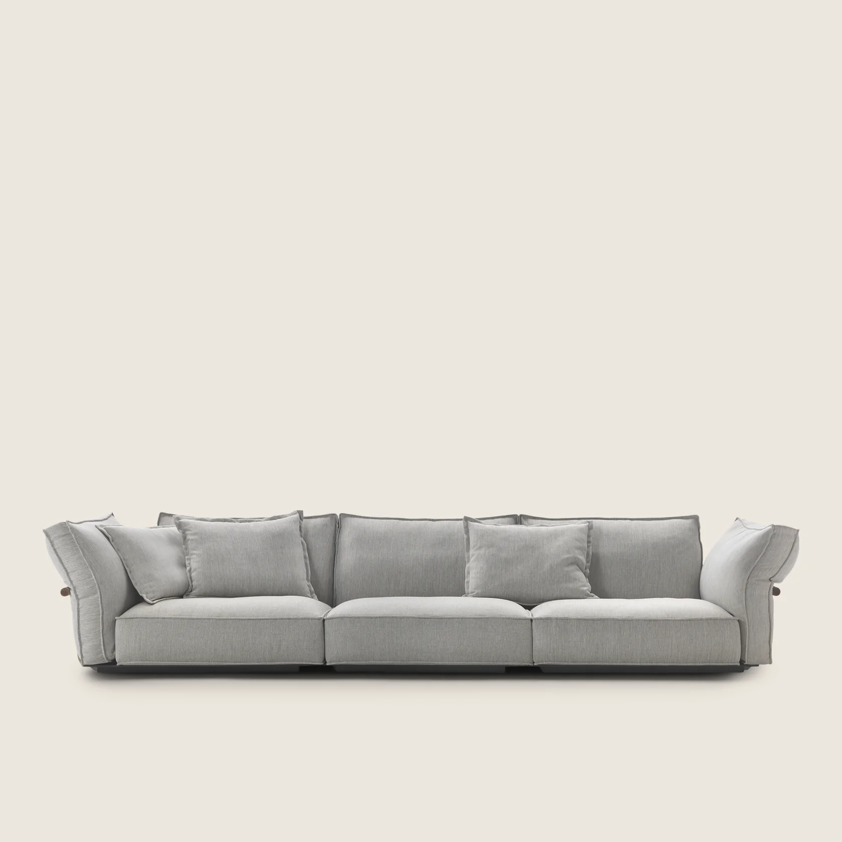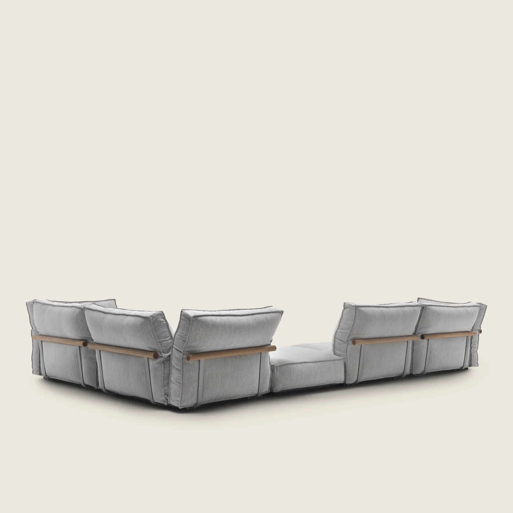 Camelot Outdoor сочетает в себе строгую структуру и мягкость обивки, создавая визуальный контраст. Диван предлагает широкие возможности для персонализации благодаря модульной конструкции и разнообразию материалов.