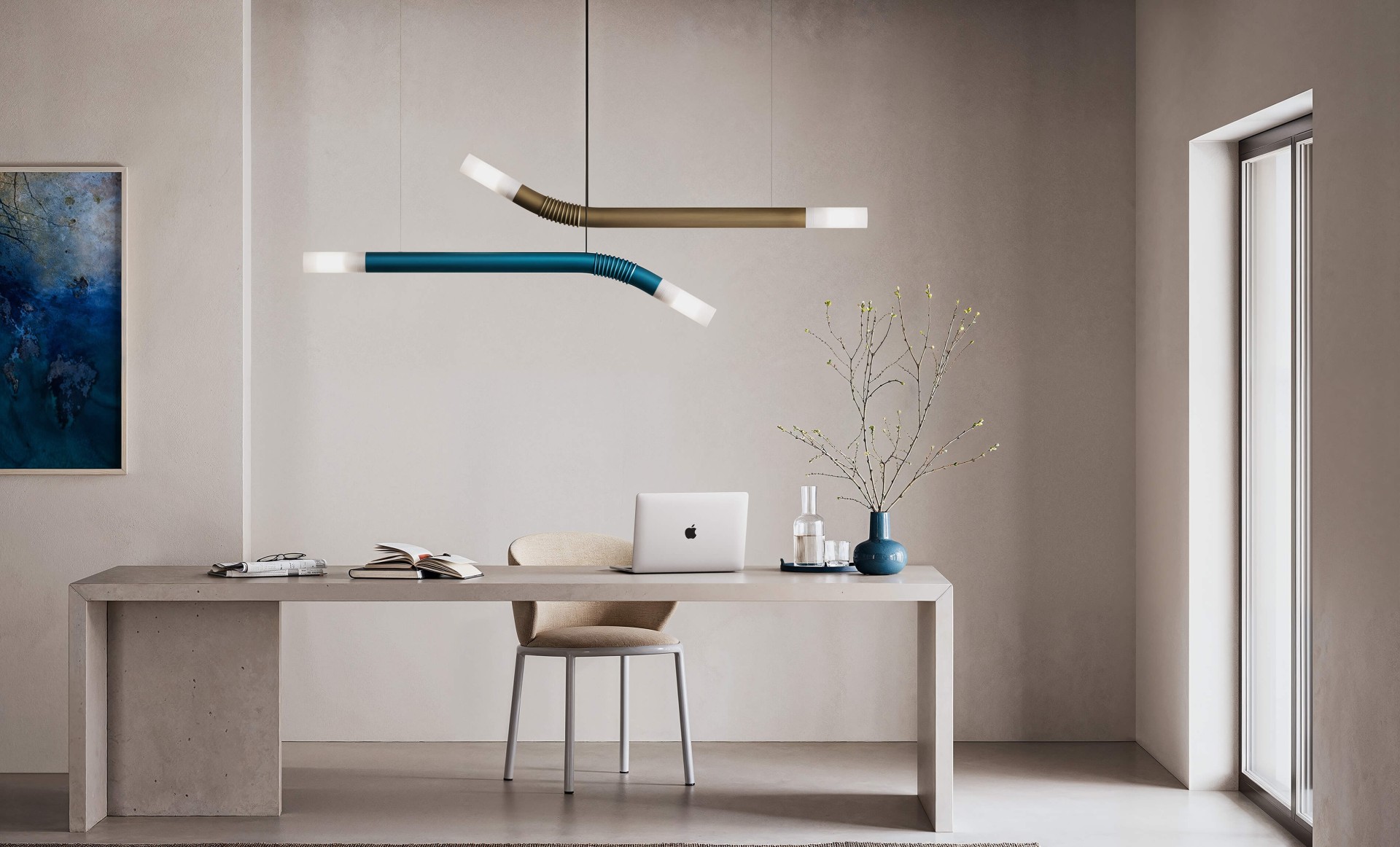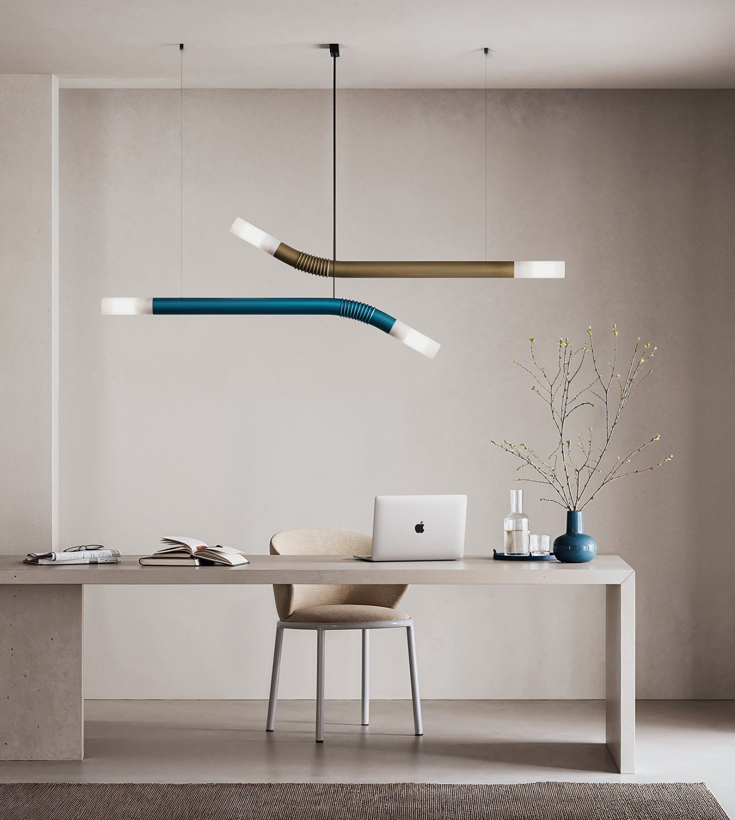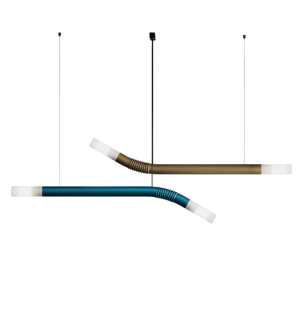 Подвесной светильник из стекла доступен в матово-голубом, сатинированном титановом или сатинированном латунном цветах. Рассеиватели из глянцевого белого стекла и матово-черные металлические элементы.
