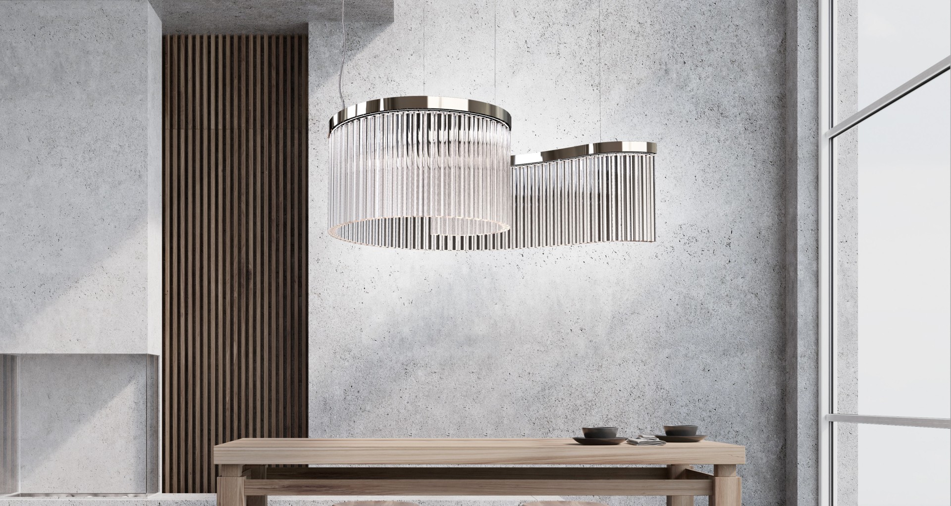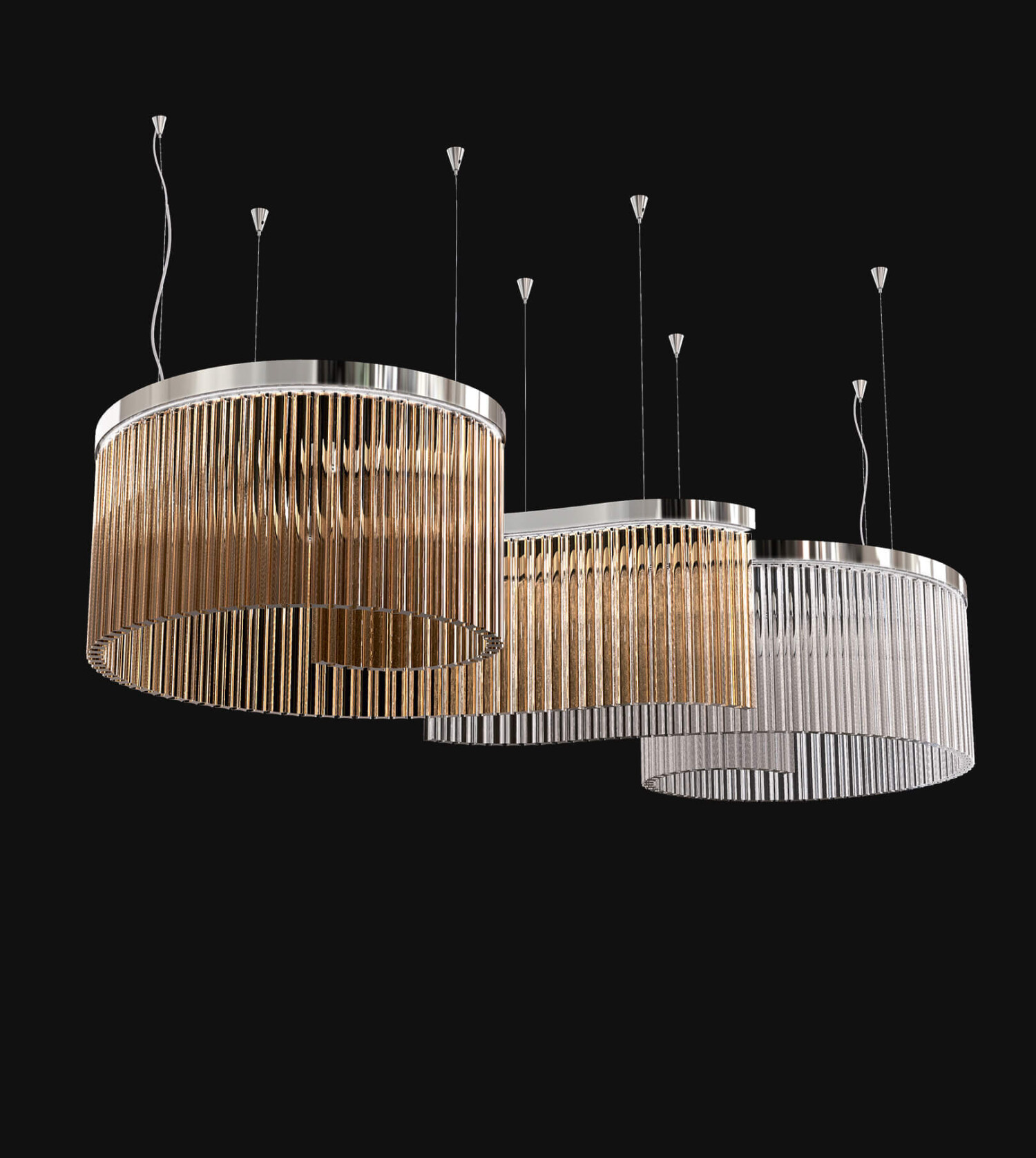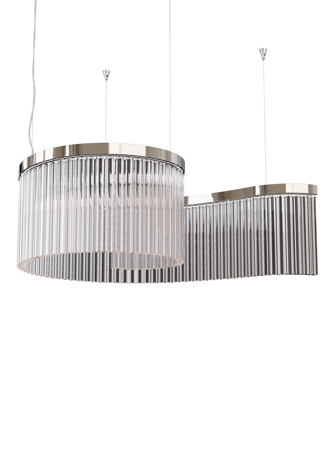 Подвесной светильник, состоящий из четырёхгранников из прозрачного, тикового или дымчато-серого стекла. Металлический каркас с хромированной отделкой.