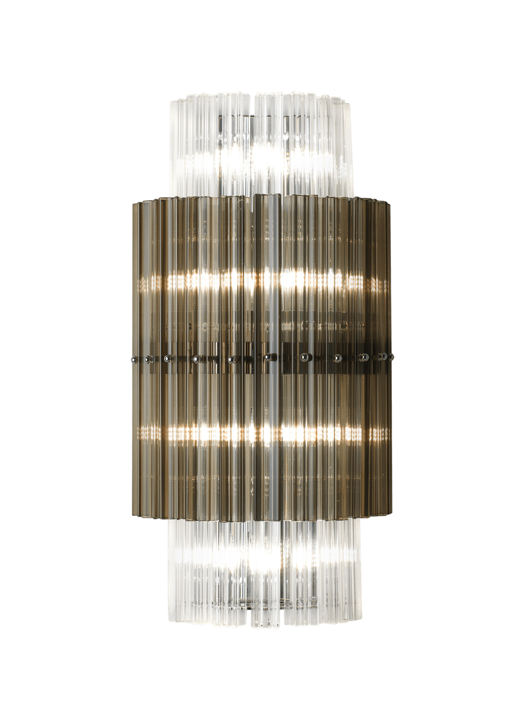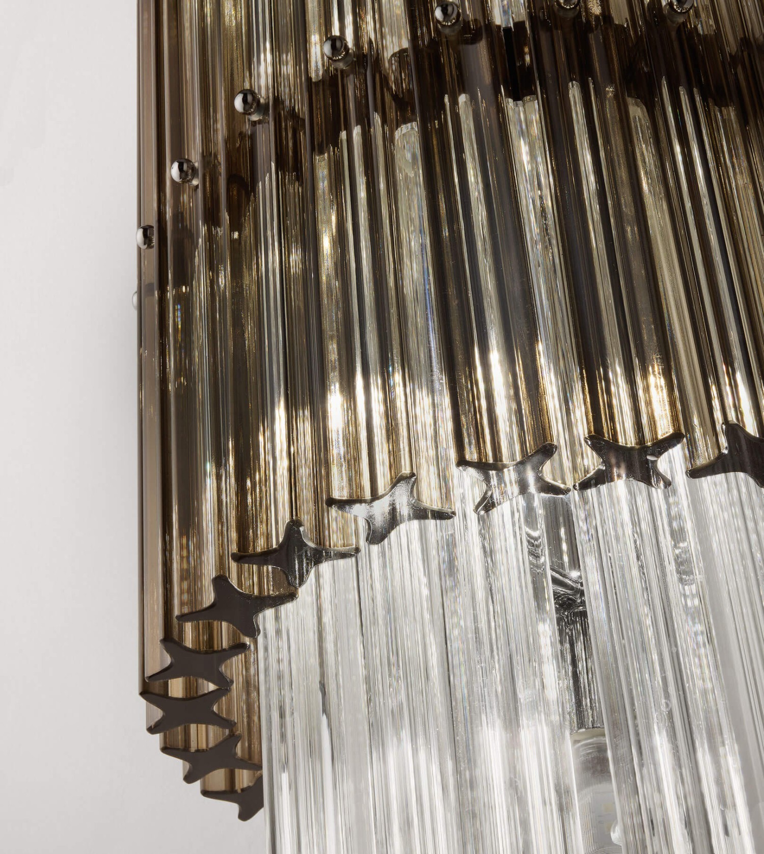 Настенный светильник из металла с хромированной отделкой и стекла прозрачного, дымчатого или тикового цвета.