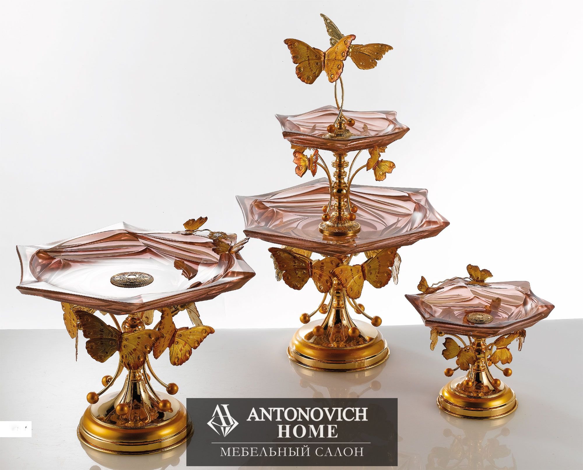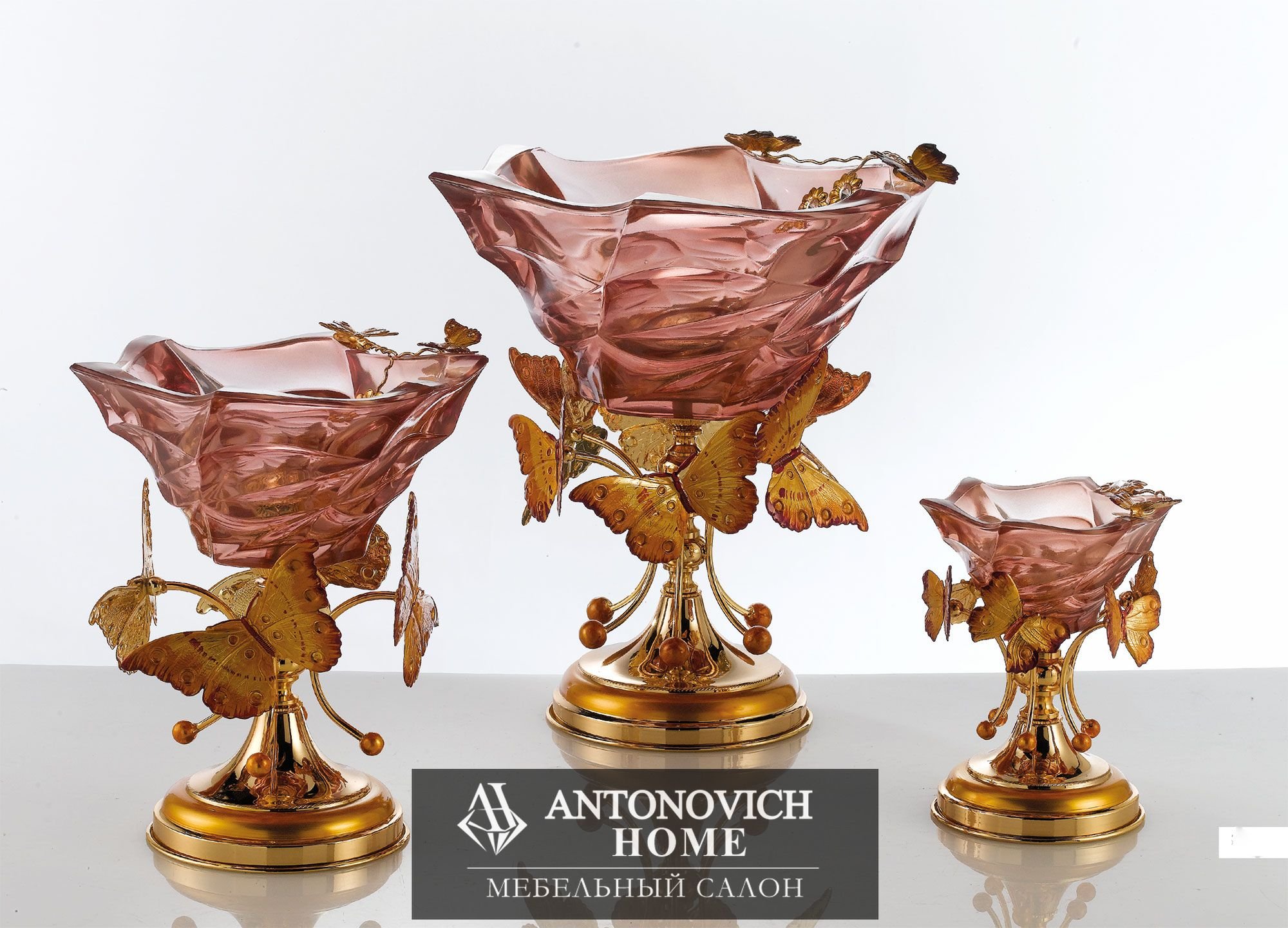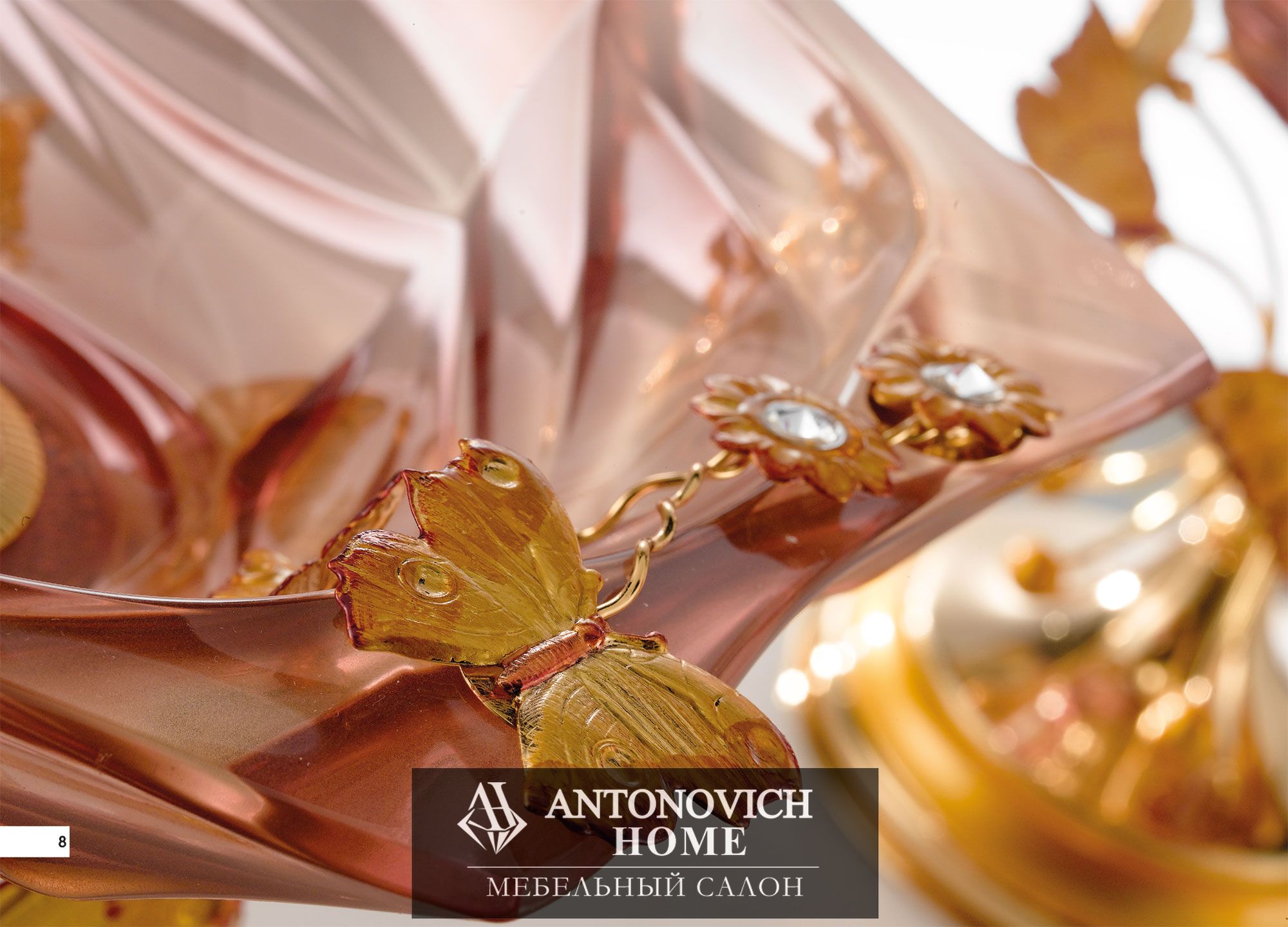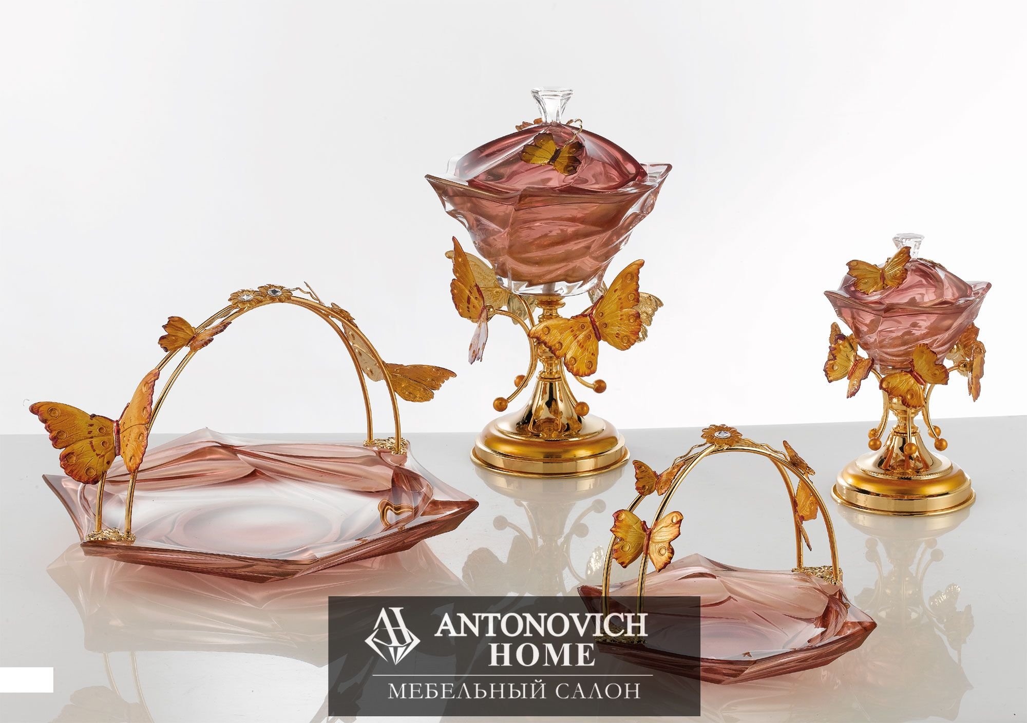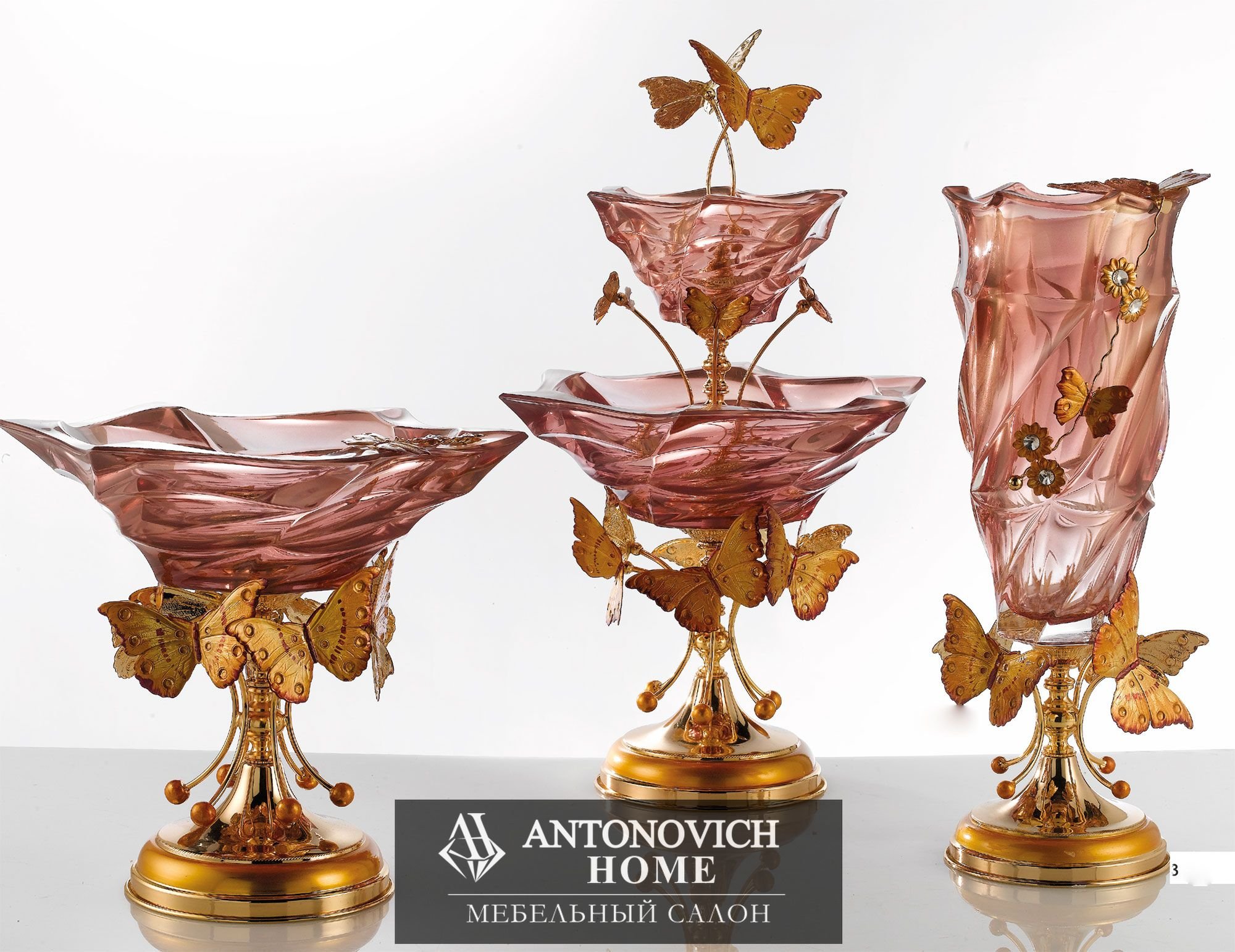 Очаровательная основа из Металла для структуры сделанной полностью из Итальянского стекла. Особый розовый цвет подчеркивает изысканность декоративных бабочек.