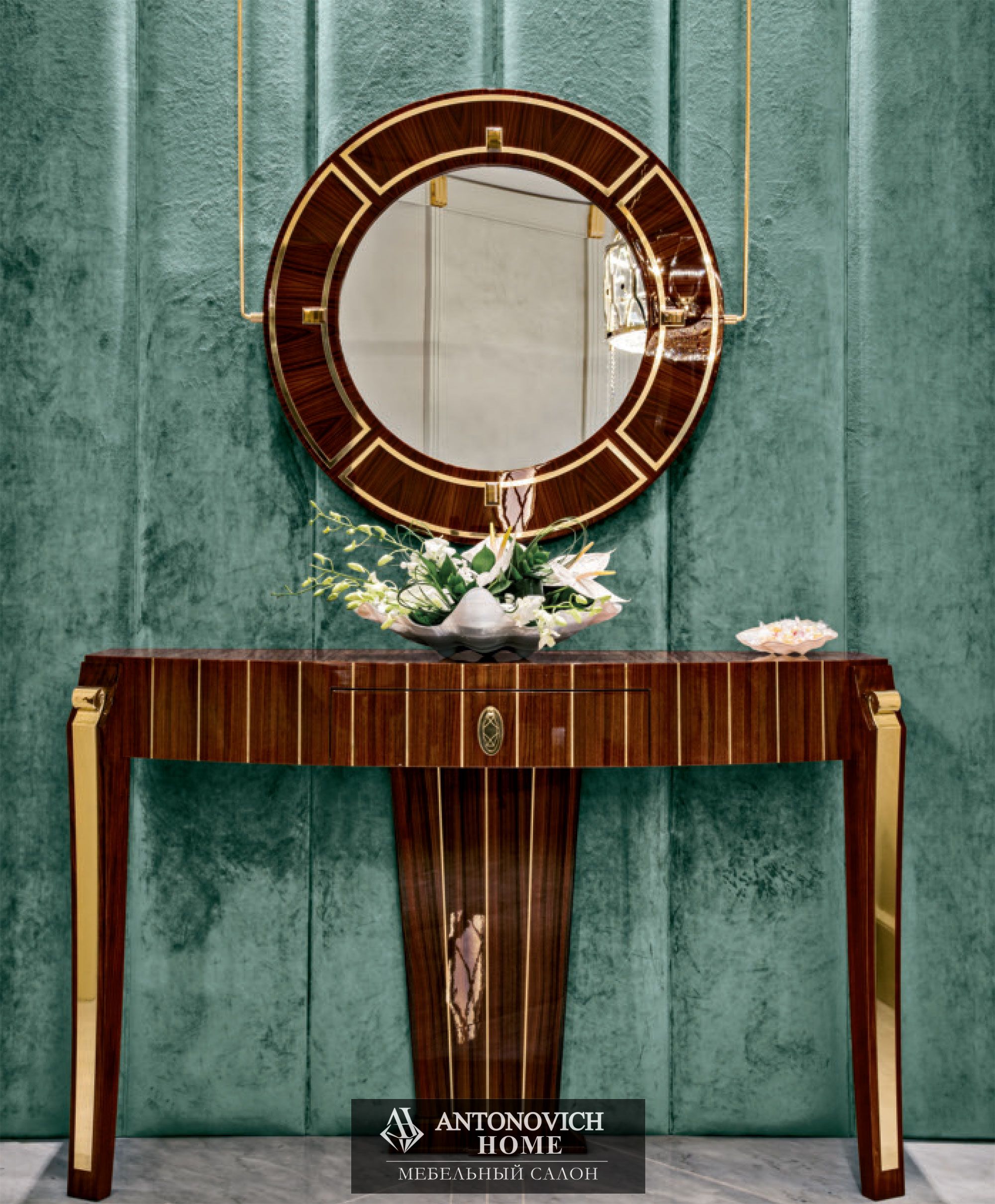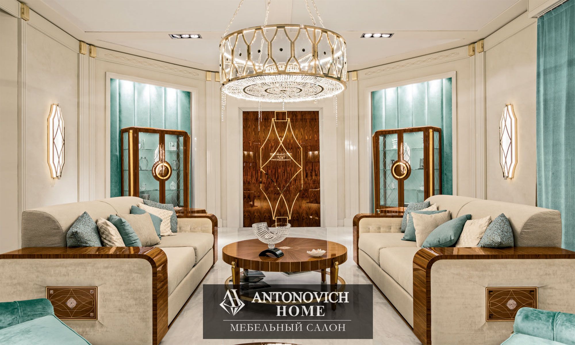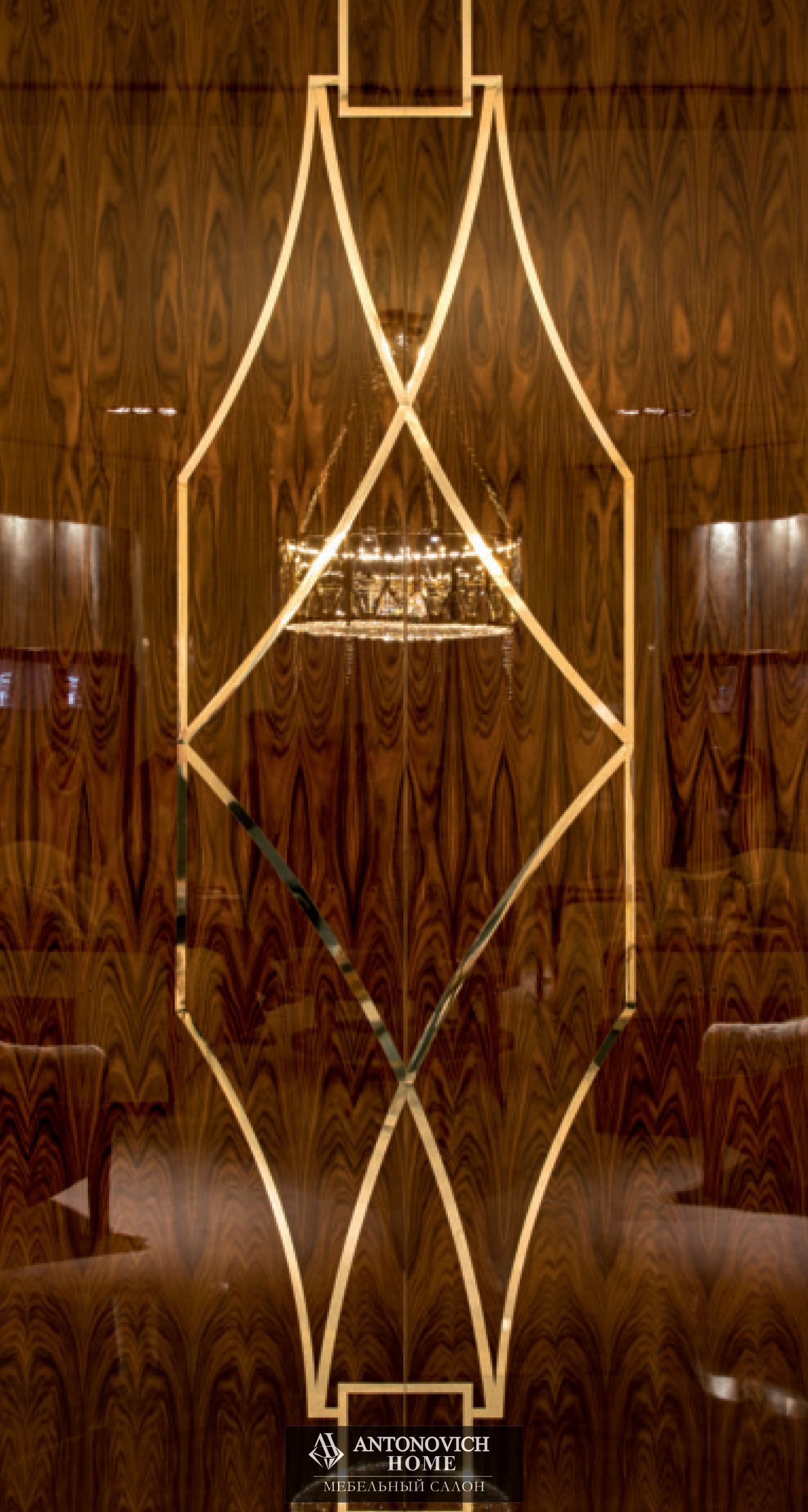 Линейная отделка подчеркивает светлый оттенок мягкой обивки дивана. Столики, расположенные около соф являются точными напоминаниями стиля ар деко, повторяют оттенок фронтальных полос. Дорогие вставки из твердого камня на зеркалах, как, например, «тигровый глаз».