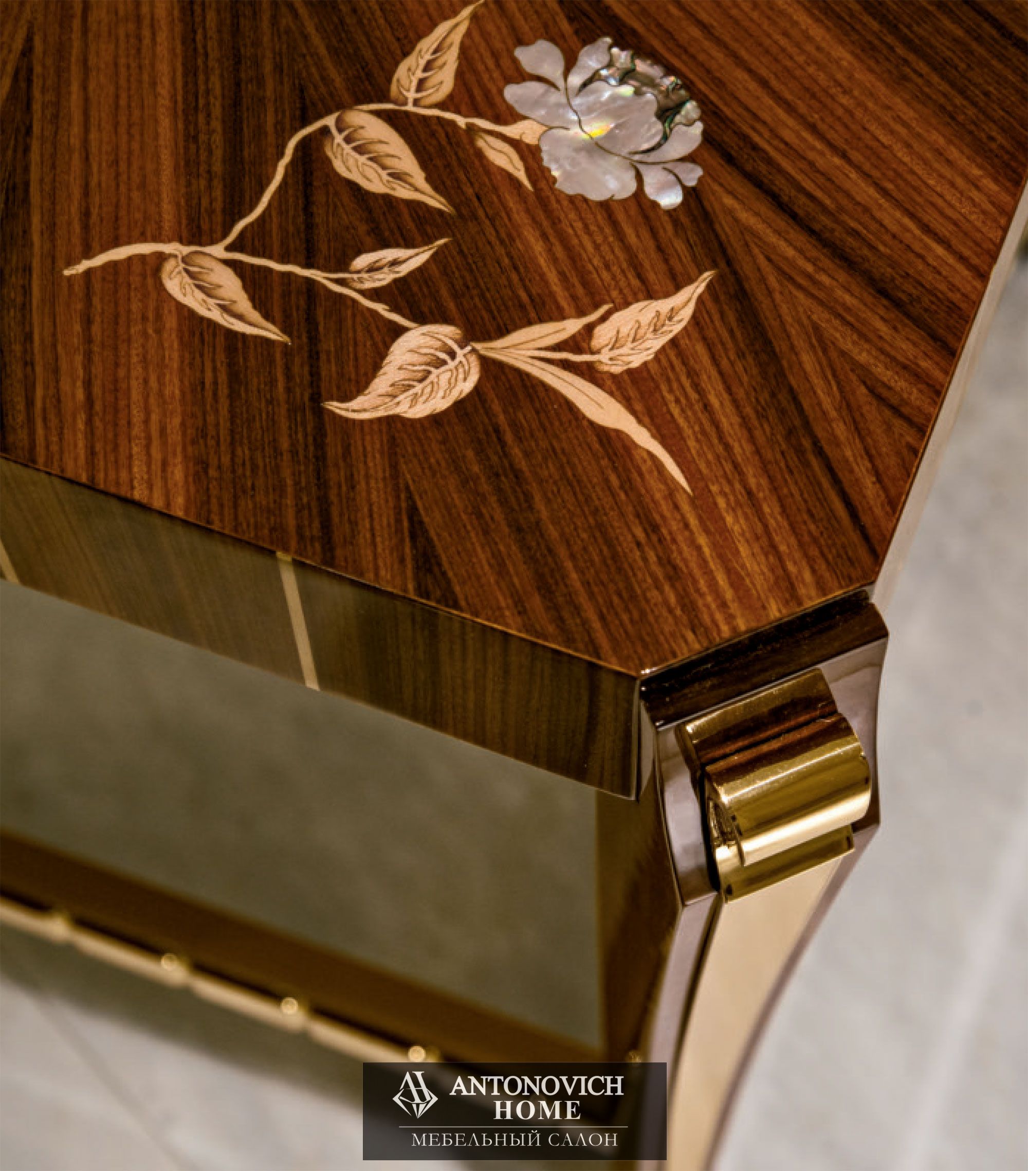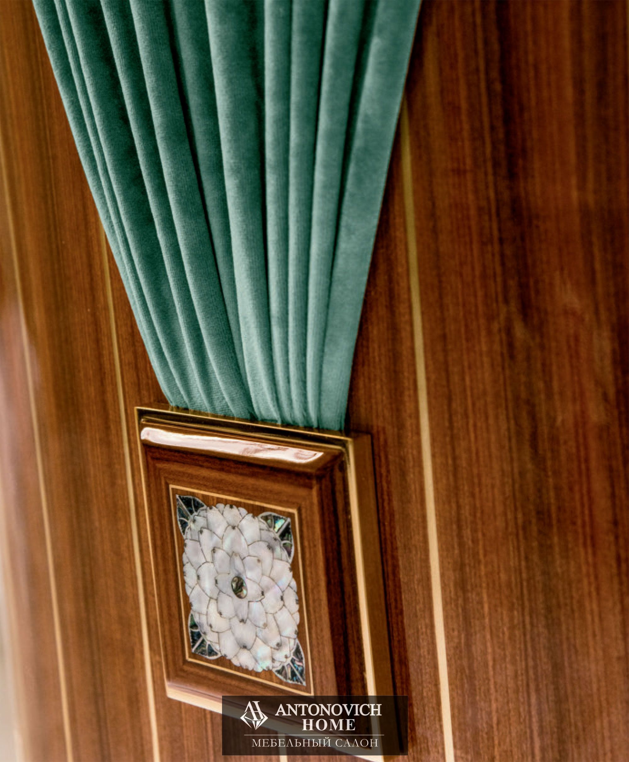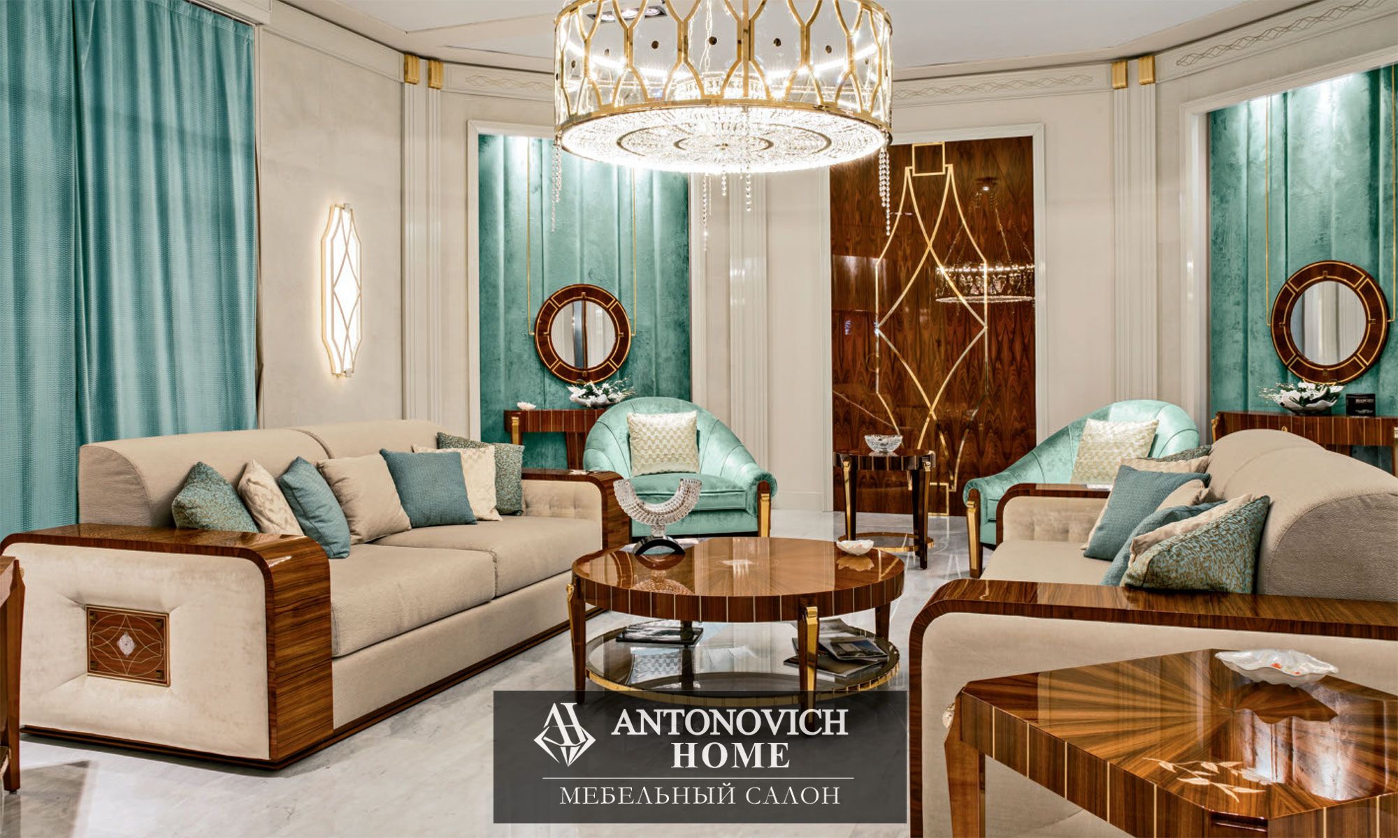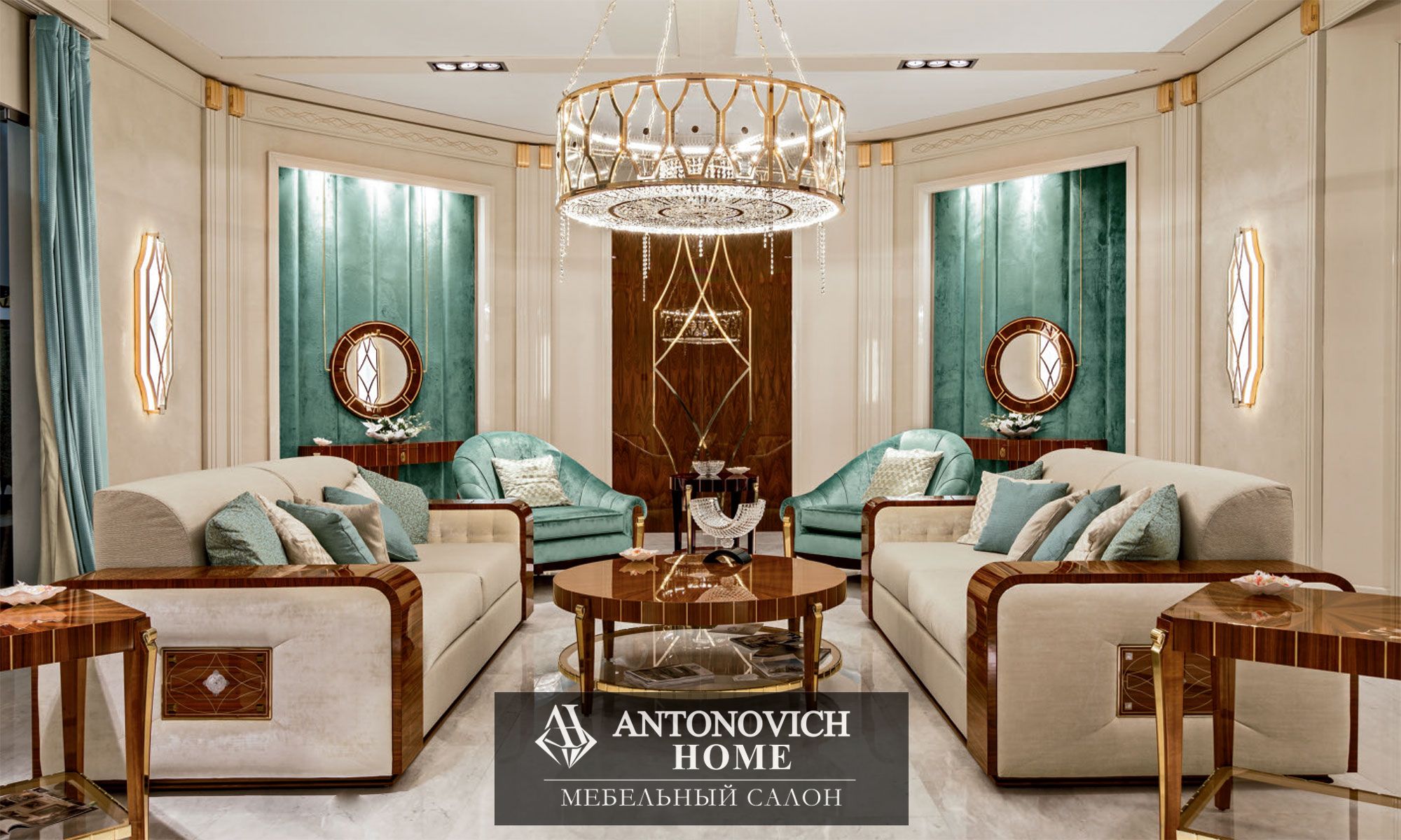 Линейная отделка подчеркивает светлый оттенок мягкой обивки дивана. Столики, расположенные около соф являются точными напоминаниями стиля ар деко, повторяют оттенок фронтальных полос. Дорогие вставки из твердого камня на зеркалах, как, например, «тигровый глаз».