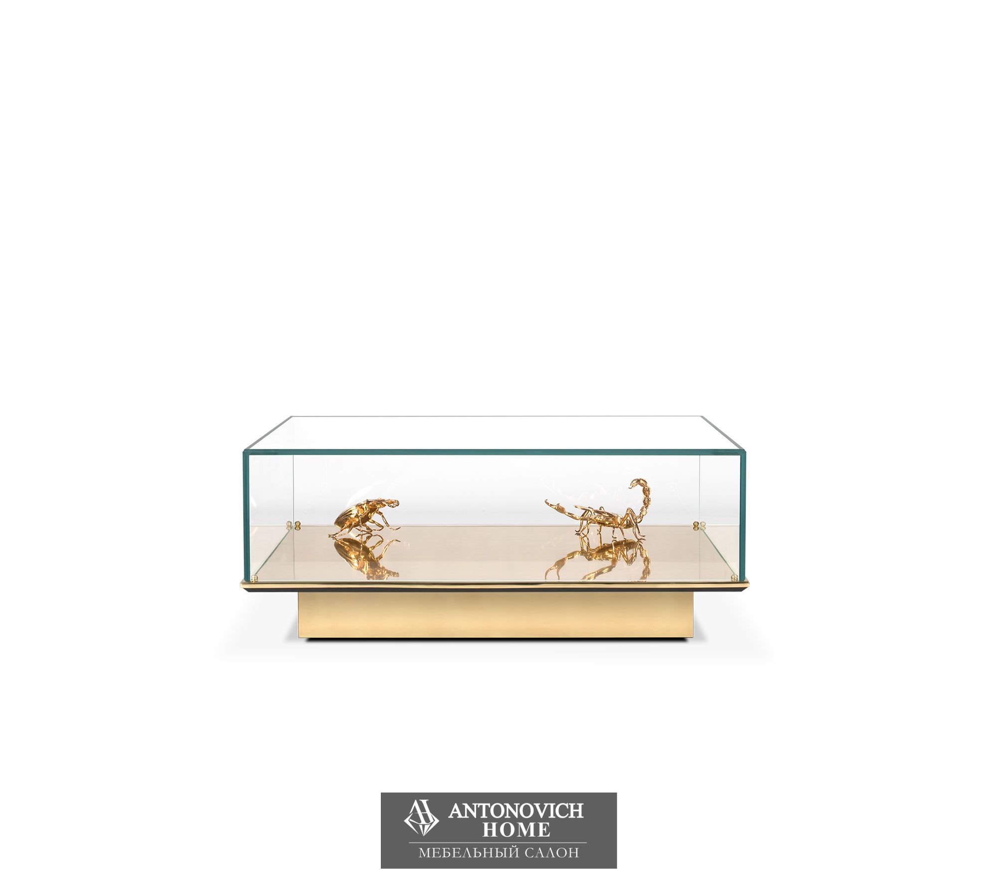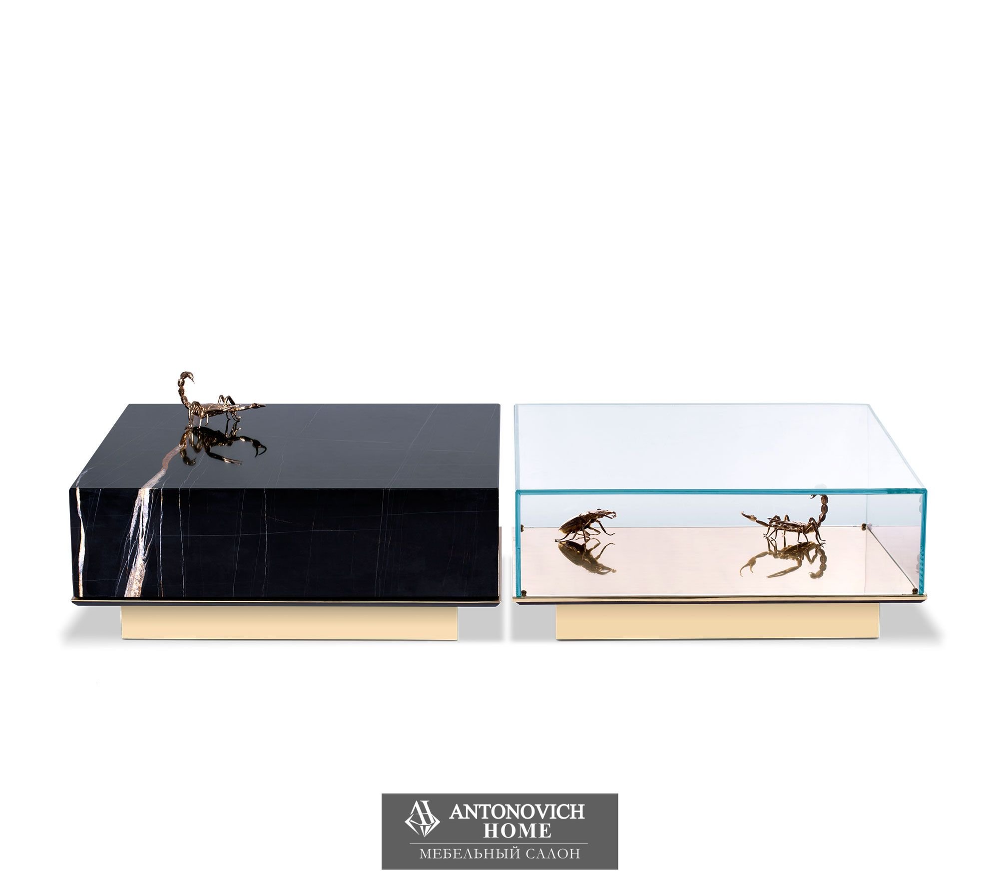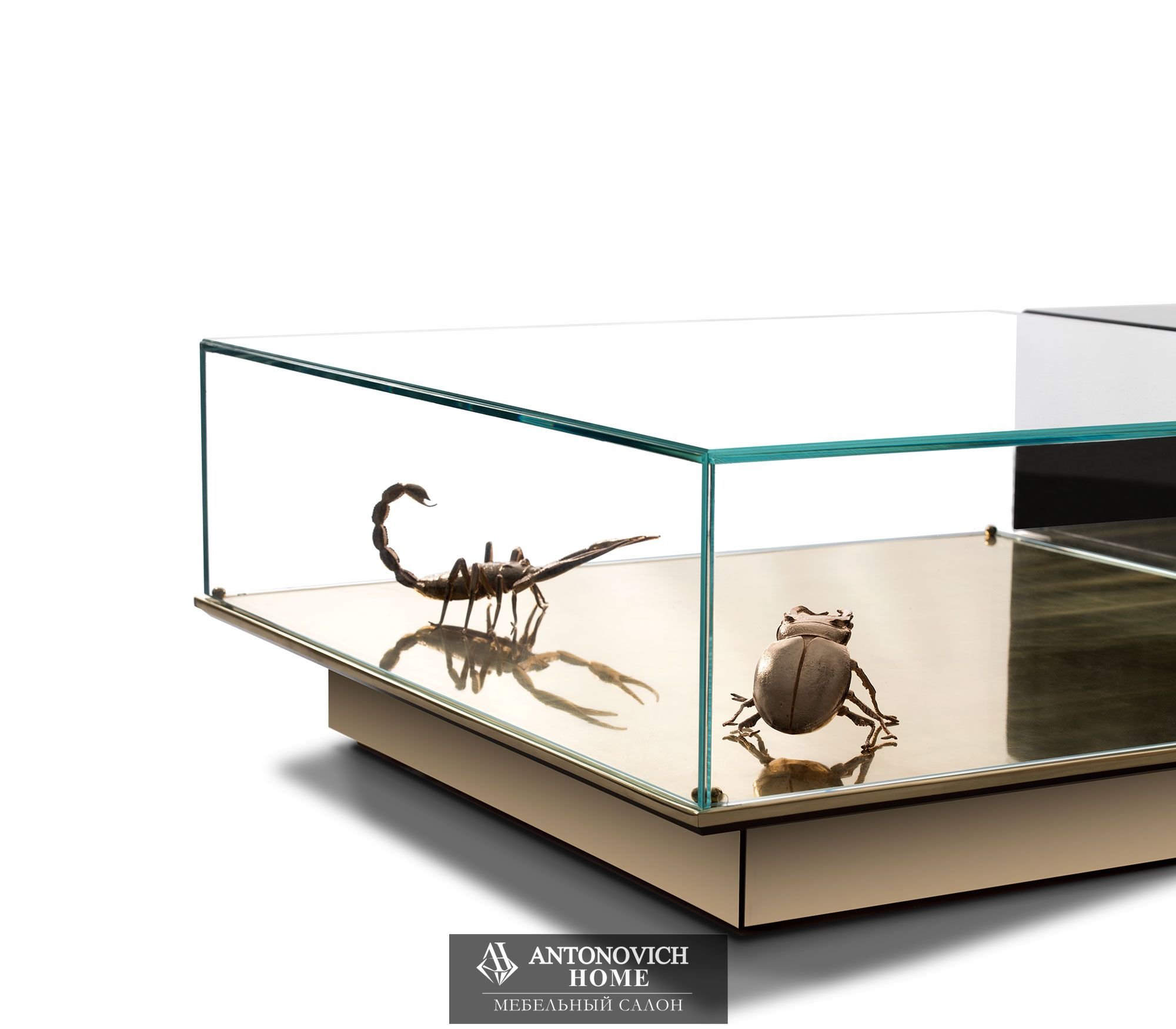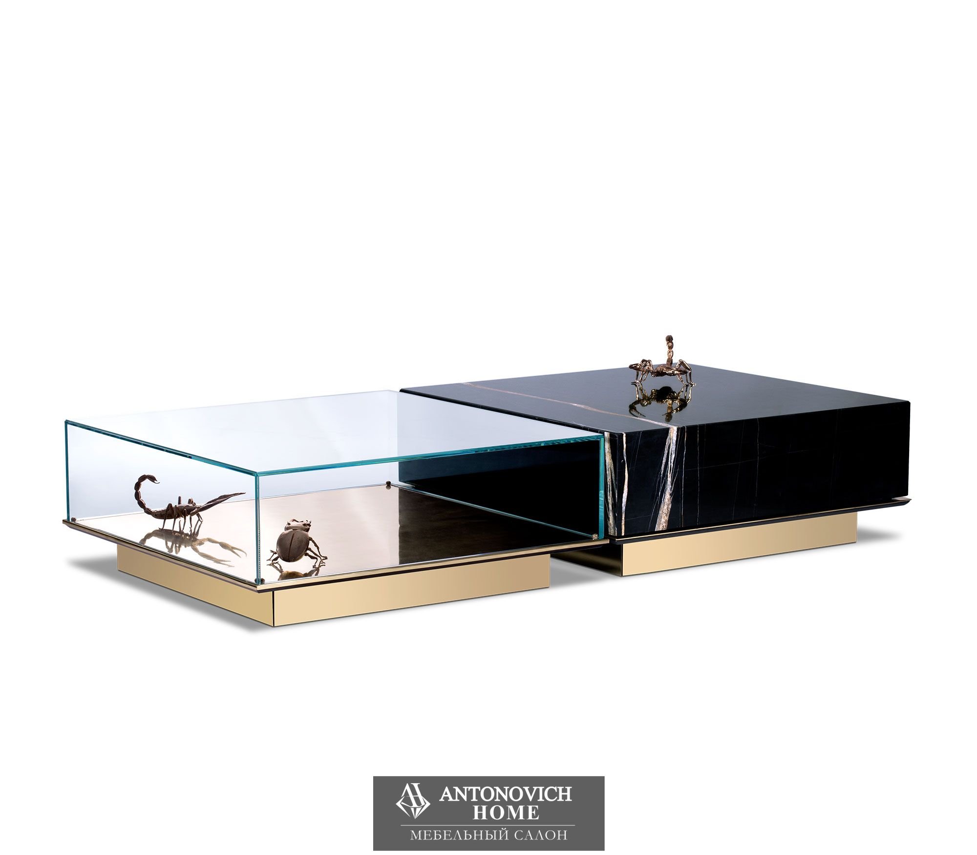Журнальный стол состоит из двух фрагментов, отделанных зеркалом и благородным мрамором и украшен присутствием золотых существ, готовых к их окончательной метаморфозе.